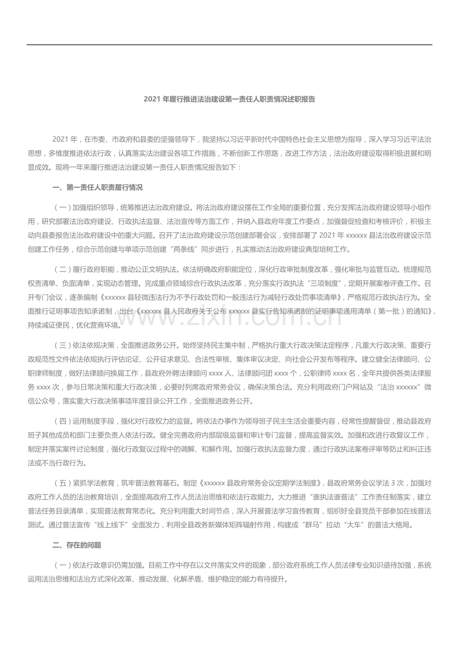 2021年,在县委、县政府正确领导下,本人坚持以习近平新时代中国特色社会主义思想为指导,深入学习习近平总书记在中央全面依法治国委员会上的重要讲话精神,全面贯彻落实党中央和省市县关于法治建设的重大决策部署。按照《x县党政主要负责人履行推进法治建设第一责任人职责实施办法》文件要求,切实履行推进法治建设第一责任人职责,将法治建设与城市管理工作相结合,推动我局法治建设取得新成效。现将本人一年来履行法治建设第一责任人职责情况报告如下: