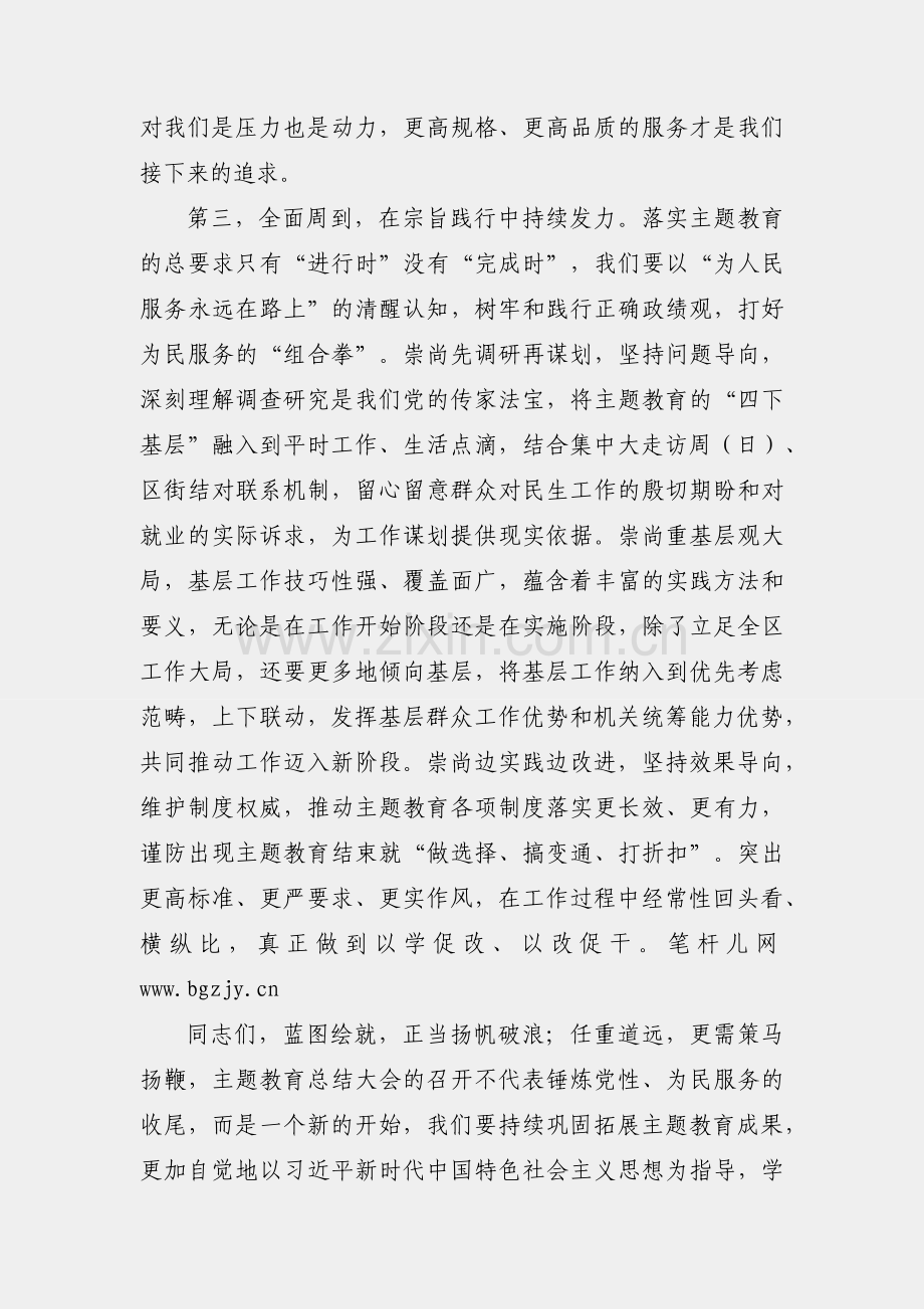 同志们,蓝图绘就,正当扬帆破浪;任重道远,更需策马扬鞭,主题教育总结大会的召开不代表锤炼党性、为民服务的收尾,而是一个新的开始,我们要持续巩固拓展主题教育成果,更加自觉地以习近平新时代中国特色社会主义思想为指导,学习贯彻习近平总书记对江苏工作“四个走在前”“四个新”的重大任务和重大要求,扎实落实中央、省市区委各项部署,感悟使命嘱托、昂扬奋进力量,促就业保民生,为中国式现代化建设作出新的更大贡献。笔杆儿网