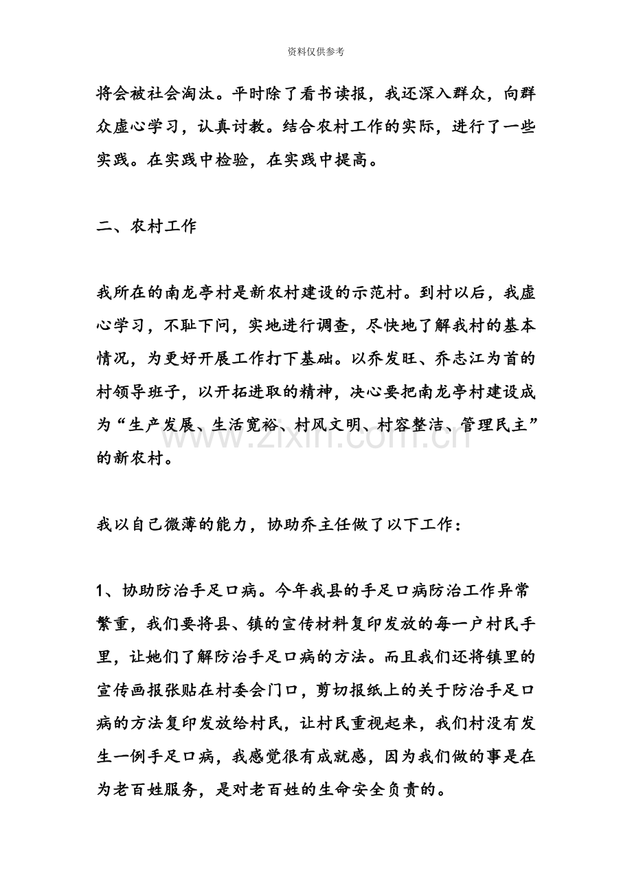 坚持学习,严格要求自己。担任村官工作,只要一有闲暇我就主动学习,不断提高自身素质。我认识到投身到新农村建设中,构建和谐社会,需要高素质人才。如果不主动学习,将会被社会淘汰。平时除了看书读报,我还深入群众,向群众虚心学习,认真讨教。结合农村工作的实际,进行了一些实践。在实践中检验,在实践中提高。