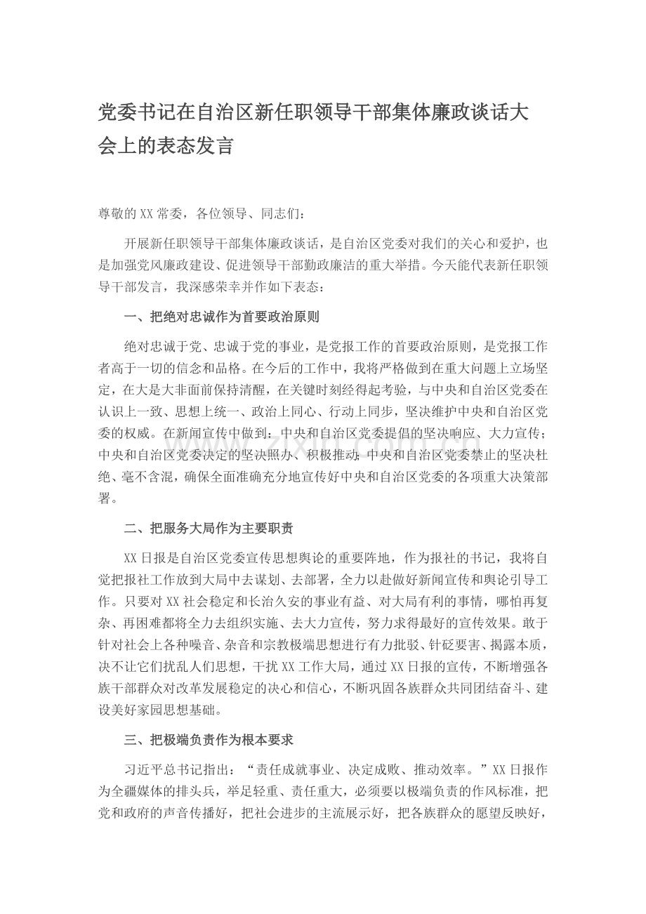 党委书记在自治区新任职领导干部集体廉政谈话大会上的表态发言