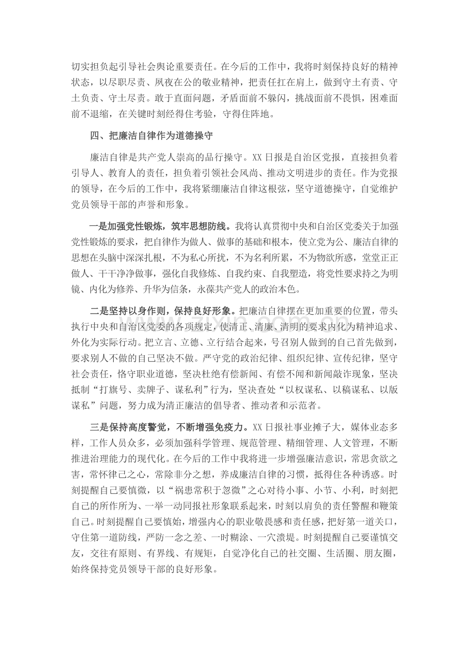 廉洁自律是共产党人崇高的品行操守。XX日报是自治区党报,直接担负着引导人、教育人的责任,担负着引领社会风尚、推动文明进步的责任。作为党报的领导,在今后的工作中,我将紧绷廉洁自律这根弦,坚守道德操守,自觉维护党员领导干部的声誉和形象。