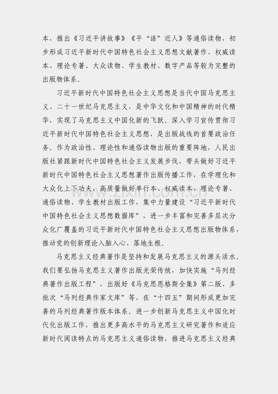 2021年10月26日,习近平总书记致信祝贺人民出版社成立100周年,充分肯定人民出版社百年来为推动马克思主义中国化时代化、传播党的创新理论、繁荣社会主义文化作出的重要贡献,对人民出版社发展提出殷切希望。贺信充分体现了以习近平同志为核心的党中央对全国出版战线和人民出版社的高度重视,为做好新时代出版工作指明了前进方向、提供了根本遵循。我们要坚持以习近平新时代中国特色社会主义思想为指导,深入学习贯彻习近平总书记重要指示精神,牢记嘱托、不辱使命,在赓续红色血脉中奋力开创党的出版事业新局面。