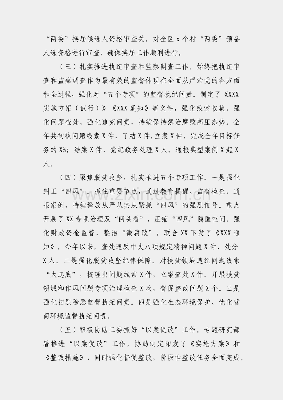 (四)聚焦脱贫攻坚,扎实推进五个专项工作。一是强化纠正“四风”。抓住重要节点,通过教育提醒、监督检查、通报案例,持续释放从严从实从紧抓“四风”的强烈信号。重点开展了XX专项治理及“回头看”,压缩“四风”隐匿空间。强化财政资金监管,整治“微腐败”,联合XX下发了《XXX通知》。今年以来,查处违反中央八项规定精神问题X件,处分X人。二是强化脱贫攻坚纪律保障。对扶贫领域违纪问题线索“大起底”,梳理出问题线索X件,立案查处X件。开展扶贫领域和作风问题专项治理检查X次,督促整改问题X个。三是强化扫黑除恶监督执纪问责。四是强化生态环境保护、优化营商环境监督执纪问责。