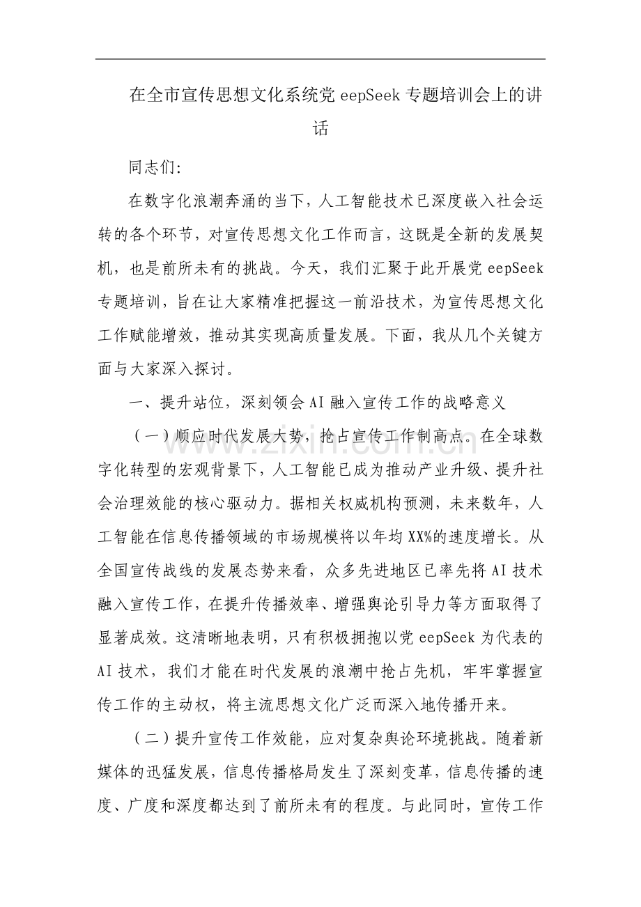 在全市宣传思想文化系统党eepSeek专题培训会上的讲话