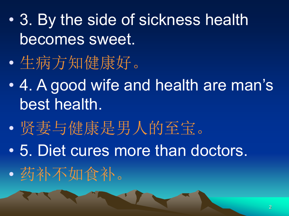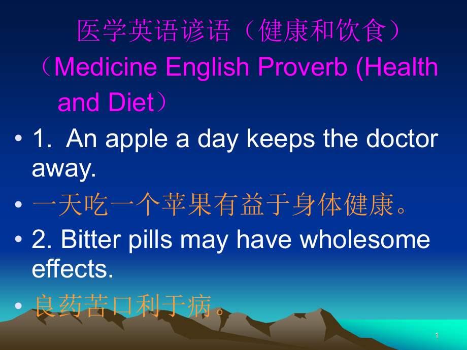 单击此处编辑母版标题样式,单击此处编辑母版文本样式,第二级,第三级,第四级,第五级,*,1,医学英语谚语(健康和饮食),(,Medicine English Proverb(Health,and Diet,),1.An apple a day keeps the doctor away.,一天吃一个苹果有益于身体健康。,2.Bitter pills may have wholesome effects.,良药苦口利于病。,2,3.By the side of sickness health becomes sweet.,生病方知健康好。,4.A good wife and health are mans best health.,贤妻与健康是男人的至宝。,5.Diet cures more than doctors.,药补不如食补。,3,6.Sickness is felt,but health not at all.(Health is not valued till sickness comes.),生病方知健康贵。,7.Laugh and grow fat.,一日三笑,心宽体胖。,8.Leave off with an appetite.,只吃七分饱,健康长寿宝。,4,9.Medicine is not meant to live on.,药不能当饭吃。,10.Sorrow and an evil life makes soon an old wife.,悲伤和放荡使女子早衰。,11.Temperance is the best physic.,节欲便是良药。,5,12.Ill air slays sooner than the sword.,污浊空气杀人比刀快。,14.Sound man wears out shoes,sick man sheets.,健康的人穿破鞋,久病的人磨破床单。,15.The head and feet keep warm,the body will take no harm.,冷自头上起,寒从脚底来。,6,16.Two things both prolong the life:,A quiet heart and a loving wife.,延年益寿有良药:静心和爱妻。,17.After death,the doctor.(Too late.),人死医生到。(太晚了。),18.An physician and a young lawyer(are best.),青年律师老郎中(最好)。,7,19 He is a good physician who cures himself.,能给自己看病的才是好医生。,20.As old as the hills.,老当益壮,青山不老。,21.Cleanliness is next to godliness.,清洁仅次于圣洁。,8,22.Temperance and industry are the two real physicians of mankind.,节制与勤劳是人类两个真正的医生。,23.An ague in the spring is physic for a king.,春天一场病,一年不服药。,24.It is the pace that kills.,操劳过度最伤人。,9,25.It is ill healing of an old sore.,旧病难医。,26.He whomever was sick dies the first fit.,不病则已,一病呜呼。,27.An ounce of prevention is worth a pound of cure.,一分钟预防抵得十分治疗。,10,28.Prevention is better than cure.,预防胜于治疗。,29.There is no medicine against death.,世上没有长生不老的药。,30.Hunger finds no fault with the cookery.,饥不择食。,11,医学英语同义句式日常用语,1.He could not remember,(recall),what disease he has ever had.,He had no memory of ever having had any disease.,He had no,recollection,of any,previous,disease.,他想不起患过什么病。,12,2.He,is attacked by,diabetic.,He has an,attack,of diabetic.,He,suffers from,diabetic.,他患糖尿病。,3.He,was admitted(taken),to hospital.,He was in hospital.,He went to hospital.,他住院了。,13,4.His condition was,aggravated,.,His condition,took a bad turn,.,His condition,took a turn for the,worse.,他的病情恶化。,5.When he takes a deep breath he felt a pain in the chest.,When he takes a deep breath he,complains of,chest pain.,14,He feels a chest pain on deep breathing.,He gets a chest pain on deep breathing.,他深呼吸时,感到胸部疼痛。,6.He,has difficulty in,breathing when he climbs the stair.,He,is troubled by,dyspnea when going up the stairs.,15,Climbing stairs,results in,difficult breathing.,Climbing stairs,ends in,labored breathing.,他上楼时,感觉呼吸困难。,7.He has bad digestion.,He has,impaired,digestion.,He has,defective,digestion.,16,He suffers from,indigestion.,He suffers from dyspepsia.,他消化不良。,8.Have you,thrown up,your food?,Have you,sent up,your food?,Have you,brought up,your food?,Have you vomited your food?,你把饭吐出来了吗?,17,9.I,feel like,vomiting.,I feel,nauseated,.,I feel sick.,I want to,vomit.,我想呕吐。,10.,His cough,which started 3 days ago,has persisted up to the present,.,He began to have cough 3 days ago and has continued since then.,18,Three days ago he,developed,a cough and it,has lasted,until today.,Three days ago he,began coughing,and it,has lasted,until today.,Three days ago he began coughing and it,has lasted,until today.,Three days ago he,started coughing,and it,has lasted,until today.,19,三天前他开始咳嗽,一直持续到现在。,11.I have a ringing in my ears.,I have a singing in my ears.,I have a,buzzing,in my ears.,I have got a,humming,in my ears.,My ears ring.,My ears are ringing.,我患耳鸣。,20,12.My vomiting stopped.,My vomiting,ceased.,My vomiting,cleared.,我不再呕吐。,13.He,suffered from,headache and fever.,He,was troubled by,headache and fever.,21,He had headache,associated,(together),with,fever.,他头痛发热。,14.He is(feels)very(extremely),thirsty.,He has excessive,thirst.,He,parches,with extreme thirst.,He marks thirst.,他非常口渴。,22,15.His fever has never fallen.,His fever has remained,unchanged.,He fever has been steady(constant).,他发烧一直不退。,16.Your fever,was reduced to,normal.,Your fever,dropped to,normal.,你的烧退到正常。,23,17.How about,(,is,),your,appetite,?,What appetite do you have?,What appetite have you?,Whats your appetite,like,?,Do you have any appetite?,你的胃口怎样?,18.I dont have any appetite.,Ive got a bad appetite.,Ive a weak appetite.,24,Ive no appetite.,我没有胃口。,19.My appetite was,reduced,gradually.,My appetite,decreased(diminished,)gradually.,My desire for food,declined,gradually.,A gradual failure for my appetite,was noted.,我的食欲渐减。,25,20.My appetite is not as good as,it used to be.,My appetite proves no better than before.,My appetite appears to be,poorer,than before.,我的胃口不如以前。,21.He eats too much.,He eats,to excess,.,He eats heavily.,26,He is intemperate in eating.,He over eats.,他过度饮食。,22.He has a good appetite and eats all kinds of foods.,He has a good(strong)stomach and,accordingly,eats anything.,His appetite is perfect and he likes all varieties of food.,他胃口好,什么都吃