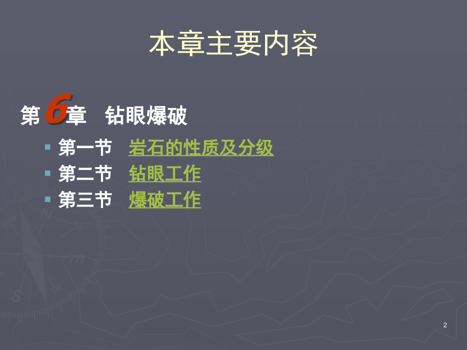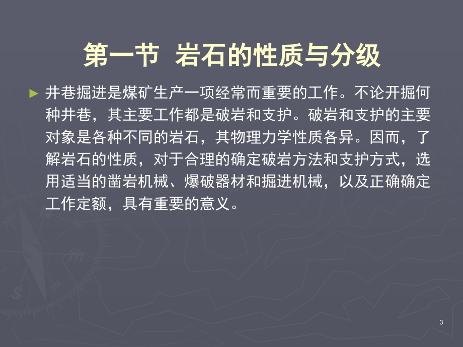,单击此处编辑母版标题样式,*,单击此处编辑母版文本样式,第二级,第三级,第四级,第五级,单击此处编辑母版标题样式,单击此处编辑母版文本样式,第二级,第三级,第四级,第五级,*,采,矿通,论,课程,第三篇,井巷掘进与支护,第,6,章 钻眼爆破,1,本章主要内容,第,6,章 钻眼爆破,第一节,岩石的性质及分级,第二节,钻眼工作,第三节,爆破工作,2,第一节 岩石的性质与分级,井巷掘进是煤矿生产一项经常而重要的工作。不论开掘何种井巷,其主要工作都是破岩和支护。破岩和支护的主要对象是各种不同的岩石,其物理力学性质各异。因而,了解岩石的性质,对于合理的确定破岩方法和支护方式,选用适当的凿岩机械、爆破器材和掘进机械,以及正确确定工作定额,具有重要的意义。,3,第一节 岩石的性质与分级,一般认为:,岩块,是从地壳岩层中切取出来的小块体;,岩体,是指地下工程周围较大范围内的自然地质体;,岩石,则是不分岩块和岩体的泛称。,“,坚固性系数,f,”,:表示岩石破坏的难易程度。,式中:,Rc,岩石的单轴抗压强度,,MPa,或,kg/cm3,1kg/cm2,约等于,0.098,MPa,,工程上近似为,0.1MPa,。,。,4,级别,坚固性程度,岩石,坚固性系数,f,I,最坚固的岩石,最坚固、最致密的石英岩及玄武岩,其它最坚固的岩石,20,II,很坚固的岩石,很坚固的花岗岩类:石英斑岩,很坚固的花岗岩,硅质片岩;坚固程度较,I,级岩石稍差的石英岩;最坚固的砂岩及石灰岩,15,III,坚固的岩石,致密的花岗岩及花岗岩类岩石,很坚固的砂岩及石灰岩,石英质矿脉,坚固的砾岩,很坚固的铁矿石,10,IIIa,坚固的岩石,坚固的石灰岩,不坚固的花岗岩,坚固的砂岩,坚固的大理岩,白云岩,黄铁矿,8,IV,相当坚固的岩石,一般的砂岩,铁矿石,6,IVa,相当坚固的岩石,砂质页岩,泥质砂岩,5,V,坚固性中等的岩石,坚固的页岩,不坚固的砂岩及石灰岩,软的砾岩,4,Va,坚固性中等的岩石,各种不坚固的页岩,致密的泥灰岩,,3,VI,相当软的岩石,软的页岩,很软的石灰岩,白垩,岩盐,石膏,冻土,无烟煤,普通泥灰岩,破碎的砂岩,胶结的卵石及粗沙砾,多石块的土,2,VIa,相当软的岩石,碎石土,破碎页岩,结块的卵石及碎石,坚硬的烟煤,硬化的粘土,1.5,VII,软岩,致密的粘土,软的烟煤,坚固的表土层,1.0,VIIa,软岩,微砂质粘土,黄土,细砾石,0.8,VIII,土质岩石,腐植土,泥煤,微砂质粘土,湿砂,0.6,IX,松散岩石,砂,细砾,松土,采下的煤,0.5,X,流沙状岩石,流砂,沼泽土壤,包含水的黄土既包含水的土壤,0.3,表,6-1,岩石强度分级表,5,第二节 钻眼工作,井巷施工首先要破碎岩石,常用的破岩方法有,机械破岩,和,爆破破岩,两种。,进行爆破破岩,就是要在采掘的煤岩中用钻研工具钻凿炮眼,其深度一般不超过,3,4m,,直径,35,75mm,。然后在炮眼中安放一定数量的炸药,炮眼口直至炸药间的一段炮眼放置以不燃的惰性物质(一般为粘土与砂子混合物)做得炮泥,再用一定的方法是炸药在炮眼内起爆,从而产生巨大压力使煤和岩石从其整体中分离出来,并破碎成便于装运的块度。,因此,钻眼爆破可分为两项主要工作:,钻眼工作,和,爆破工作,。,6,第二节 钻眼工作,一、钻眼机械与机具,岩石的切削,钻眼(又称凿岩)机具按,能源,分,有电动、风动、液压、内燃四种。,按,破岩机理,来分,有,冲击式、旋转式,两种。,1,电钻,用旋转式钻眼法破岩,用电力为动力。,煤矿常用的有煤电钻和岩石电钻。,7,8,9,10,第二节 钻眼工作,2,、凿岩机,(,风钻,),矿山一般常用的有:手持式、气腿式、伸缩式和导轨式几种。,3,全液压钻机,液压凿岩机是以液压为动力的凿岩机,它和风动凿岩机一样,也由冲击机构、转钎机构及排粉系统等组成。,YT-23,型风钻外形,11,12,13,十字钎子头原理,14,15,16,钻眼工具,1,、凿岩机,钎子,:钎头的形状较多,但最常用的是一字形和十字形钎头。,2,、,电钻钻具,组合钎子,活动钎头,煤电钻钻具,17,第二节 钻眼工作,二、掘进机械设备,一种组合的装备及自动化配置。,掘进凿岩台车,目前最广泛采用的掘进凿岩台车,是在可自行的车体上,安立钻臂,钻臂上端安设推进器。凿岩机在推进器的导轨上,因推进机械的作用而前后移动,完成钻进和退钻的动作。钻臂可上下、左右摆动,以便将凿岩机安置在所需钻眼的位置。,台车行走机构有轨轮、履带及轮胎三种形式。国产台车目前以轨轮式为主。,18,CGJ220.2,型掘进凿岩台车,19,凿岩台车,20,大型的凿岩台车,21,第三节 爆破工作,一、爆破作用的原理,岩石与空气相接触的表面称为,自由面,。,药包中心到自由面的垂直距离叫,最小抵抗线。,不同最小抵抗线时的集中药包爆破现象,22,三、炮眼的布置,23,三、炮眼的种类和作用,掏槽眼,:首先爆炸的炮眼,其作用在于产生自由面。,辅助眼,:在掏槽眼的外围,除崩落岩石外,还能扩大所掏的槽,提高周边眼的爆破效果。,周边眼,:靠近巷道的周边,其作用在于使巷道获得一定的形状和规格。,24,25,炮眼的布置,26,第三节 爆破工作,二、矿用炸药,炸药是一种固体或液体的化合物或混合物。当这种物质受到一定的外界能量作用时,(,遇热、机械冲撞力、其它炸药爆炸的影响,),,就能迅速分解,同时产生大量的气体和热量。,在炸药迅速分解的过程中,由于气体的膨胀作用对周围介质产生突然的冲击压力,致使介质破坏,同时发生巨大的音响和振动,这种现象称为爆炸。,爆炸与燃烧的区别:爆炸与燃烧的共同点均是散发气体和热量,但燃烧的反应速度很慢,所以热量不能聚积,