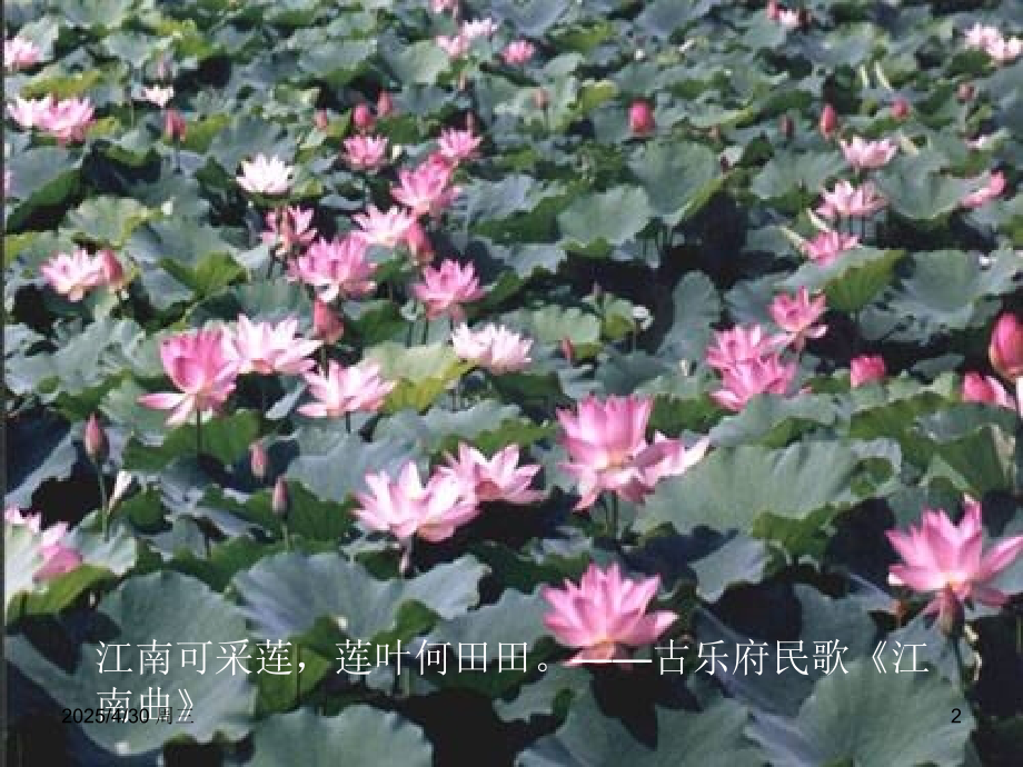 单击此处编辑母版标题样式,单击此处编辑母版文本样式,第二级,第三级,第四级,第五级,*,爱莲说,周敦颐,1,2025/4/30 周三,江南可采莲,莲叶何田田。古乐府民歌江南曲,2,2025/4/30 周三,荷花入暮犹愁热,低面深藏碧伞中。杨万里暮热游荷池上,3,2025/4/30 周三,四面荷花三面柳,一城山色半城湖。济南大名湖对联,4,2025/4/30 周三,),荷叶罗裙一色裁,芙蓉向脸两边开。王昌龄采莲曲,5,2025/4/30 周三,6,2025/4/30 周三,兴尽晚回舟,误入藕花深处。李清照如梦令,7,2025/4/30 周三,秋阴不散霜飞晚,留得枯荷听雨声。李商隐宿骆氏亭寄怀崔雍崔衮,8,2025/4/30 周三,四顾山光接水光,凭栏十里芰荷香。黄庭坚鄂州南楼书事,9,2025/4/30 周三,莲,莲,又称荷、芙蕖、鞭蓉、水芙蓉、,水芸、水旦、水华等,溪客、玉环是,其雅称,未开的花蕾称菡萏,已开的花朵,称鞭蕖,睡莲科,属多年生水生宿根草本,植物,其地下茎称藕,能食用,叶入药,,莲子为上乘补品,花可供观赏。是我国十,大名花之一。是印度的国花。,10,2025/4/30 周三,接,天,莲,叶,无,穷,碧,映,日,荷,花,别,样,红,杨,万,里,11,2025/4/30 周三,清水出芙蓉,天然去雕饰。,李白(唐),12,2025/4/30 周三,小荷才露尖尖角,早有蜻蜓立上头,13,2025/4/30 周三,荷叶罗裙一色裁,芙蓉向脸两边开,14,2025/4/30 周三,接天莲叶无穷碧,映日荷花别样红。,杨万里,清水出芙蓉,天然去雕饰。,李白,采莲南塘秋,莲花过人头。,乐府民歌,15,2025/4/30 周三,文体探究:,是古代一种议论性的文体,大多是就一事、一物或一种现象抒发作者的感想。,“说”:,16,2025/4/30 周三,濂溪,学者就称他为,濂溪先生,。宋代理学创始人,著,周元公集,。,周敦颐,周敦颐,(1017-1073),,,宋,代道洲,(,现在湖南省道县,),人,字,茂叔,,哲学家。因他世居道县濂溪,后居庐山莲花峰前,峰下有溪,也,命名,17,2025/4/30 周三,“,说”是一种,议论文,的文体,可以直接,说明事物或论述道理,,也可以,借人借事,或,借物,的记载来论述道理。,爱莲说,就是说说,爱好莲花,的问题。,说,18,2025/4/30 周三,检查预习,1、看拼音写汉字或看汉字写拼音,甚,蕃,(),濯,()清lin()而不妖 不,蔓,不枝()亭亭jng植(),亵,玩()陶后,鲜,有闻(),2、重点字词解释,1)、可爱者甚,蕃,(),2)、出淤泥而不,染,(),3)、,濯,清涟而不妖(),4)、不,蔓,不,枝,()(),5)、可远观而不可,亵,玩,焉,()(),6)、花之,君子,者也(),7)、,宜,乎众矣(),fn,zhu,涟,mn,净,xi,xin,多,沾染(污秽),洗涤,生枝蔓,长枝节,玩弄,助词,品德高尚的人,应当,19,2025/4/30 周三,爱 莲 说,周敦颐,水陆草木之花,可爱者甚蕃。晋陶渊明独爱菊。自李唐来,世人甚爱牡丹。予独爱莲之出淤泥而不染,濯清涟而不妖,中通外直,不蔓不枝,香远益清,亭亭净植,可远观而不可亵玩焉。,予谓菊,花之隐逸者也;牡丹,花之富贵者也;莲,花之君子者也。噫!菊之爱,陶后鲜有闻。莲之爱,同予者何人?牡丹之爱,宜乎众矣。,20,2025/4/30 周三,水陆草木之花,可爱者甚,蕃,。晋陶渊明独爱菊。自,李唐,来,世人甚爱牡丹。,fn,多,唐代,水上、地上各种草木的花,可爱的很多。晋朝的陶渊明只喜爱菊花。自从唐朝以来,世人大多很喜爱牡丹。,21,2025/4/30 周三,注释:,沾染(污秽),洗涤,清水,美丽而不端庄,生枝蔓,长枝节,耸立的样子,亲近而不庄重,立,予独爱莲之出淤泥而不,染,,,濯清涟,而不,妖,,中通外直,不,蔓,不,枝,,香远益清,,亭亭,静,植,,可远观而不可,亵,玩焉。,22,2025/4/30 周三,予,独爱莲之出淤泥而不,染,,,濯,清涟而不,妖,,中通外直,不蔓不枝,香远益清,亭亭净,植,,可远观而不可,亵,玩焉。,沾染(污秽),洗涤,美丽而不端庄,树立,亲近而不庄重,我只喜爱莲花从淤泥里生长出来却不受沾染,在清水里洗涤过,而不显得妖媚;它的茎内空外直,不生枝蔓,不长枝节;香气远播,更显得清芬;笔直地洁净地立在那里,只可以从远处观赏却不可以贴近去玩弄啊。,我,23,2025/4/30 周三,注释:,认为,隐士,叹词唉,爱菊,少,应当,予,谓,菊,花之,隐逸者,也;牡丹,花之富贵者也;莲,花之君子者也。,噫,!,菊之爱,,陶后,鲜,有闻;莲之爱,同予者何人;牡丹之爱,,宜乎,众矣。,24,2025/4/30 周三,予,谓,菊,花之隐逸者也;牡丹,花之富贵者也;莲,花之,君子,者也。,认为,品德高尚的人,我认为菊,花,是花,中隐居的,人;牡丹,是花中富贵的(花);莲花是花中品德高尚的人。,25,2025/4/30 周三,噫,!菊之爱,,陶后,鲜,有闻。莲之爱,同予者何人?牡丹之爱,,宜,乎众矣。,y,叹词,唉,Xin,少,应当,唉,对于菊花的喜爱,陶渊明以后就很少听到了。对于莲花的喜爱,像我一样的还有几个人呢?对于牡丹的喜爱,人该是很多了。,26,2025/4/30 周三,1.,文中哪些句子描写了莲的形象?分别体现,了莲怎样的品质?你觉得作者赞美的仅仅是,莲花吗?,2.,在文中作者对菊花、牡丹、莲的评价如何?,态度怎样,?,3.,文中为何要写菊花、牡丹?,从中能看出作者怎样的生活态度?,让我们讨论一下吧,讨论时间到,纲,合作探究,27,2025/4/30 周三,1.,环境:出淤泥而不染,,濯清涟而不妖,2.,体态:中通外直,,不蔓不枝,3.,香气:香远益清,4.,风度:亭亭净植,可远观而不可亵玩焉,不同流合污,洁身自好。,(高洁),不妖媚,洁净,朴实。,(质朴),为人正直;不趋炎附势。,(正直,),香气清爽悠远,美名远扬。,(清香),为人独立,令人敬重不敢玩弄。,(清高),28,2025/4/30 周三,(三)文本探究,1.,请将匹配的相应的字母填入相应的地方。,(,莲的特征,人的品质,),A.,君子,B.,自尊自爱,C.,仪态庄重,D.,美名远扬,E.,不同流合污,F.,独立高洁,G.,不攀