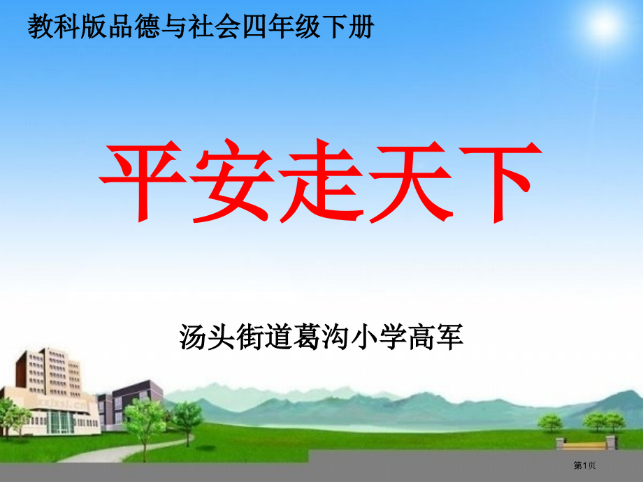 单击此处编辑母版标题样式,单击此处编辑母版文本样式,第二级,第三级,第四级,第五级,*,*,单击此处编辑母版标题样式,单击此处编辑母版文本样式,第二级,第三级,第四级,第五级,教科版品德与社会四年级下册,平安走天下,汤头街道葛沟小学高军,第1页,事 故 呈 现,问:事故发生原因是什么?,1,、公交车挡住了轿车司机和行人视线。,2,、当事人过马路时没有左看看右看看。,案例告诉我们过马路要注意什么?,过马路时,要 先左看看再右看看,,不要在车辆临近时突然横穿。,第2页,学好交通知识,,平安走遍天下。,第3页,第4页,第5页,第6页,第7页,第8页,儿童注意,注意信号灯,慢行,注意危险,禁止行走,禁止左转,禁止鸣喇叭,直 行,限速,步行,注意车辆,禁止跨越,第9页,我当,小警官,第10页,第11页,第12页,第13页,第14页,第15页,恪守交通规则做行路文明人,1,、不翻越护栏。,2,、不在车辆临近时突然过马路。,3,、不在公路上玩耍、追逐打闹。,4,、不在公路上读书看报,聊天嬉笑,5,、,不在道路上扒车、追车、强行拦车,或抛物击车,第16页,第17页,第18页,恪守交通规则,做乘车文明人,1,、不坐未经检验合格机动车,2,、不坐非法营运机动车,3,、不坐超载、无牌无证、报废机动车,4,、乘车时不将身体任何部位伸出窗外,第19页,我们身边有违反交通规则现象吗?,第20页,第21页,警 世 钟,菏泽道路交通事故视频警示世人:,恪守交通规则,,珍爱生命安全!,部分画面较惨烈,请做好心理准备,第22页,第23页,第24页,第25页,第26页,第27页,第28页,第29页,自1886年世界第一辆汽车问世以来,全世界死于交通事故人数已经超出3200万,而且仍以每年40万速度在增加。,当前我国交通事故十分严重,全国共发生道路交通事故26.5万起,伤亡37.8万人,直接经济损失达10.1亿元,日均死亡201人,这些数字可谓触目惊心。,大多数事故是因为当事人缺乏交通知识或违反交通规则。所以我们一定要恪守交通规则,小资料,第30页,人,生命,只有一次。,恪守,交通规则,,注意,交通安全,,才能平,平安,安走天下。,第31页,感悟实践,1.,学了这节课,你们有怎样 感受,把它写在本子上吧!,2.,设计两条交通安全宣传口号,同学间相互交流。,第32页,放 映 结 束,好人一生平安,第33页,