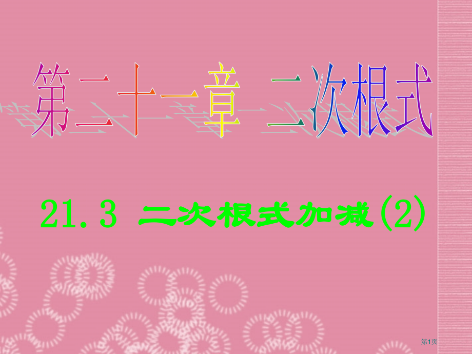单击此处编辑母版标题样式,单击此处编辑母版文本样式,第二级,第三级,第四级,第五级,*,*,*,第二十一章 二次根式,21.3 二次根式加减(2),第1页,主页,学习方式说明,按次序学习,可利用鼠标控制进程。,从右侧或上方导航栏中选择内容,进行学习。,电子教案可查看配套教案,课后练习可查看配套练习(含答案)。,第2页,目标展现,第3页,教材分析,第4页,复习引入,第5页,探索新知,探究,第6页,范例,范例点击,第7页,反馈练习,第8页,应用拓展,第9页,谈一谈本节课自己收获和感受?,小结,小结作业,第10页,作业,教材P21习题21.3,第6、8题,小结作业,第11页,双基演练,第12页,能力提升,第13页,聚焦中考,第14页,