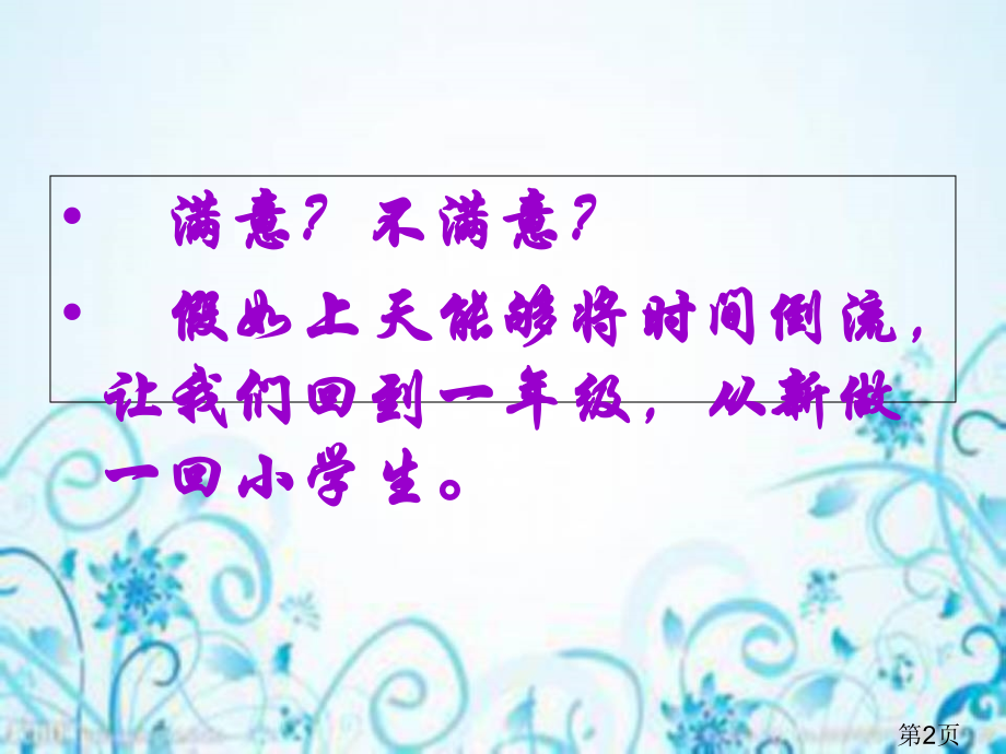 单击此处编辑母版标题样式,单击此处编辑母版文本样式,第二级,第三级,第四级,第五级,*,本资料仅供参考,不能作为科学依据。谢谢,眼看着就要六年级了,你所学知识都掌握了吗?你对如今成绩满意吗?,第1页,满意?不满意?,假如上天能够将时间倒流,让我们回到一年级,从新做一回小学生。,第2页,第3页,第4页,假如你能回到一年级,,从新做一回小学生,,你将会干什么呢?,第5页,假如我能再做一回小学生,第6页,假如我能再做一回小学生,我一定不会以为时间过得太慢;我一定不会再在生日蜡烛前默默许下快快长大愿望;我一定不会再埋怨同学们那些无微不至关心;我一定不会再认为老师布置家庭作业太多而耽搁了我玩游戏时间,我一定不会,第7页,假如我能再做一回小学生,回到刚才入学那一年,那一天,我不会因为害怕或懒惰而不敢前进小学校园一步,不会因为老师批评而躲在角落里悄悄哭泣。不会因为,第8页,假如我能再做一回小学生,我不会因为自己小,在自己考了第一名领奖时遮遮掩掩将自己藏在那大大奖状身后;我不会再在语文课上因为怕答错了问题而将自己早已想好并经过重复确认答案藏在心中;我不会再因为自己被叫起来之后回答不出老师问题而哭鼻子。,第9页,假如我能再做一回小学生,我一定会变得很好很好,假如我能回到六年前,第10页,假如你能再做一回小学生,你会干什么呢?,完成自己入课时梦想?,或是上课认真听老师讲课,切切实实掌握所学知识?,或是结交众多朋友,不至于让自己惋惜?,请以“假如我能再做一回小学生”为话题,写一篇习作。,第11页,假如我能再做一回小学生,时光荏苒.白驹过隙.六年时光像条滔滔不绝大河一去不返.我还有一个月就要告别母校了。六年来.我做过许多错事.假如.我能再做一回小学生.我要去更正我犯下错误.做一名小学生。,假如.我能再做一回小学生.我不会再粗心大意。以前.我做什么事都很马虎.不论是看书看报.还是考试写作业.我都摆脱不了粗心这个毛病。有一次考试.因为题目比较轻易.我三下五除二就做完了试卷.没有检验就交给了老师。结果那次考试我才得85分.其中有许多我做错题目我都会做.我真是太粗心了。我一定要更正粗心大意这个缺点!,第12页,假如.我能再做一回小学生.我不会再小肚鸡肠。从前我是一个心胸狭窄人.每次同学找我借文具.借纸巾.我都会视而不见.置之不理。有时.我把一张试卷放在了课桌上.一位同学走过时衣服不小心碰掉了那张试卷.我连忙要他捡起.不然我就去告诉老师。其实.现在我回想起来.真是十分惭愧。我以后一定要做一个心胸宽广、宽容大度.不斤斤计较好学生。,第13页,假如.我能再做一回小学生.我不会再书写马虎。从一年级到六年级.我写字就是不好.有时我写字甚至连我自己都看不懂.这让我十分尴尬。即使.我也试着练过字.可是我写字还是像鸡爪一样难看。以后.我一定要把字练好.写出一手漂亮好字。,假如.时光能够倒流.再让我做一回小学生.我必定要做一名品学兼优、尊师守纪好学生.让我更正犯下错误和缺点.那该多好啊!,第14页,假如,我能再做一回小学生,燕子去了,有再来时候;杨柳枯了,有再青时候;桃花谢了,有再开时候。不过,聪明你告诉我,我们为何不能够再做一回小学生了呢?是有些人偷了它们罢?那是谁?又藏着何处?是它们自己,走了吧?现在又到了哪里呢?,在逃去如飞日子里,六年光阴就在转瞬刹那间恍恍而过了。昨天,我还是一个刚入学新生,今天,我竟然要含泪说这句:“再见了,我小学生活!”,第15页,小学这六年来,它曾给我带来了许许多多高兴,它让我从一个无知不懂小屁孩,变得懂事从容。走过操场,记得我们曾经在那里做操,我们曾经在那里打比赛,我们曾经在那里相互追逐、打闹、嬉戏。听,那里曾经有过我们歌声,一曲曲再次从记忆海洋里波动着我心弦。走过教室,记得我们曾经在那里学习过,我们曾经在那里捣蛋过,我们曾经在那里游戏过。假如黑板就是浩淼大海,那么,老师便是海上选手。铃声想起那刻,老师用粉笔做浆,划动那船只般泊在港口课文。课桌上,那难题堆放,如同暗礁一样布列,老师手势生动如一只翱翔鸟,在讲台上挥一条优美弧线?船只穿过.天空飘下来一片云,如同老师亮堂堂心,一派高远。,第16页,而讲台下我们如战场上一个个抬头挺胸烈士,展开了一场血战含糊地殊死拼搏一场战争,老师为我们编织战役。我们携手同舟,闯过了一道道门槛。这六年战争,全是用老师辛勤汗水,同学们永不言败、刻苦心,赢得了胜利口号,而今天所响起一阵阵口号声,不停波动着我心弦.,小学这六年来陪同我走过同学、老师还有充满我们回想校园我都不会忘怀。因为它是我人生幸福一个转折点,也是他们在我漫漫人生路途上,给予了莫大帮助,莫大宽容,莫大自信。,第17页,小学生真好,假如还能再让我做一回小学生话,我一定会愈加珍惜小学在校读书时光,同学们和老师情谊。可惜过去了就回不来了,假如有这个机会让我反老回童话,我一定会让我小学生活愈加充实、美好!,第18页,