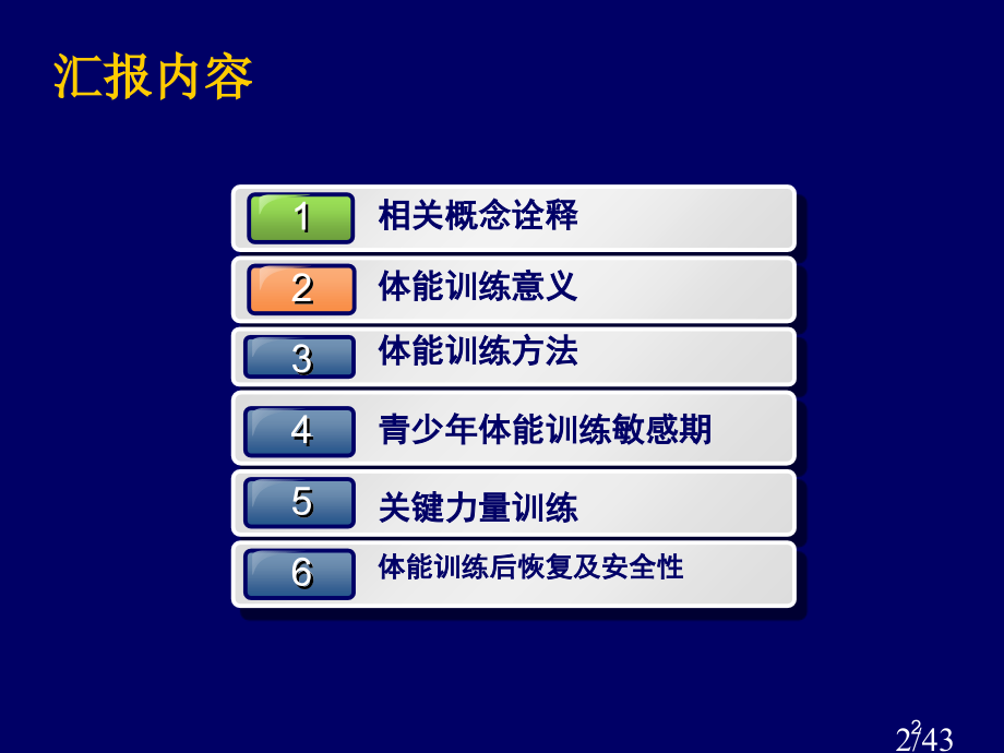 ,单击此处编辑母版标题样式,单击此处编辑母版文本样式,第二级,第三级,第四级,第五级,*,*,本资料仅供参考,不能作为科学依据。谢谢。本资料仅供参考,不能作为科学依据。本资料仅供参考,不能作为科学依据。谢谢。本资料仅供参考,不能作为科学依据。,体能训练,朱桂林,江西师范大学体育学院,1/43,1,汇报内容,1,相关概念诠释,2,体能训练意义,3,体能训练方法,4,青少年体能训练敏感期,5,关键力量训练,6,体能训练后恢复及安全性,2/43,2,1.体能训练诠释,1.1 概念,体能:,运动能力:,人体机能能力:,体能训练:,3/43,3,1.2 内涵,体能训练可分为普通身体训练、专题身体训练和专题能力训练(亦称为功效性体能训练)。,体能训练包含:SPEARQ。,Sspeed,,速度训练(动作速度、动作频率、移动速度)。,Ppower,,力量训练(,绝对、暴发、速度力量和力量耐力等。,Eendurance,,耐力训练(有氧耐力、无氧耐力)。,Aadaptability or agility,,灵活性或灵敏。,Rreaction,,反应能力训练。,Qquality,,运动天赋。,1.体能训练诠释,4/43,4,普通身体训练和专题身体训练可视为一个整体。,专题身体训练,有利于普通身体训练水平发展。二者是相辅相成、相互促进关系。在强调专题身体训练同时,决不能忽略普通身体训练。80年代世界上不少优异运动员,只重视专题身体训练,破坏了人体整体素质协调能力发展,造成运动成绩下降,运动创伤重复出现,甚至终断了运动生命,其实例是不少。,1.体能训练诠释,5/43,5,功效性体能训练:,一个为提升专题运动能力,经过加强关键力量并能使神经肌肉系统愈加有效率训练方法。,功效训练是专题训练,是体能专题化桥梁,它提升了技术表示体能效率,缩小了训练和比赛距离。,1.体能训练诠释,6/43,6,2.1确保运动员有机体适应当代运动训练及比赛大负荷、大强度要求,2.2促使运动员更加好掌握复杂、先进、合理运动技术和战术,2.3培养运动员良好心理素质和顽强意志品质,2.4提升专题运动能力,服从于专题运动特征和比赛特点需要,2.体能训练意义,7/43,7,3.体能训练方法,研究目标,研究意义,3.1速度训练,身体素质训练方法:,(1)耐力项目速度训练,运动员既需要磷酸能速度(CP),又需要乳酸能速度(糖酵解)。其同时改进才能促进运动员速度耐力水平提升。,发展乳酸能速度,即是在运动员有机体处于一定量乳酸堆积条件下,发展运动员最大速度。,8/43,8,3.体能训练方法,(2)速度项目标训练方法,经过跑练习,发展运动员速度,其训练方法和伎俩是因项、因人而异。如100m跑运动员.,(3)力量项目速度训练,力量项目运动员速度训练,主要是在逐步提升运动员力量时,努力提升肌肉用力收缩速度,努力提升整体速度力量水平。,(4),艾弗森提升奔跑速度训练:,最主要不是天天练短跑,而是需要掌握正确跑动姿势。将跑步动作分解开来训练。,9/43,9,3.体能训练方法,专题运动能力训练方法:,(1)因项、因人而异。,(2)运动员速度训练与力量训练相结合,是发展速度、提升专题运动能力训练主要训练方法。,A.发展最大速度与暴发力量和速度力量相结合。B.发展速度耐力与速度力量和速度力量耐力相结合。C.改进技术训练与最大力量和暴发力量相结合。D.提升专题运动能力与专题力量和速度力量相结合,10/43,10,3.2力量训练,(1)耐力项目,追求力量耐力(既克服体重速度力量耐力或负重体重参数条件下速度力量)水平提升,含有鲜明项目特征。,经常选取训练方法:,A.丘陵地跑发展腿部力量耐力。要求:,B.连续跳跃练习发展腿部力量耐力,3.体能训练方法,11/43,11,(2)速度项目,影响动作频率和步长相关最亲密原因之一,是运动员不一样性质力量素质发展水平。,(3)力量项目,不一样运动项目,对运动员不一样性质力量素质要求有显著区分。,3.体能训练方法,12/43,12,3.3耐力训练,有氧耐力训练,发展有氧耐力练习强度普通说应低于最大强度70%,以有氧系统供能为主。练习强度通常可专心率负荷来控制。如可控制在140170次分钟之间。依据这个强度进行长时间工作,可使有氧系统供能得到改进,心肺系统机能水平、肌肉供血和直接吸收氧气能力得到提升。,3.体能训练方法,13/43,13,无氧耐力训练,无氧耐力发展水平主要取决于三个原因:,第一是无氧代谢能力,这是组成无氧耐力最主要原因。,第二是能源物质(ATP、CP、糖元)贮备。,第三是肌肉、关节、韧带等支撑运动器官承受大强度工作能力。,3.体能训练方法,14/43,14,3.体能训练方法,A.耐力项目,普通是在保持专题目标要求稳定快节奏条件下,逐步增加训练负荷数量,同时保持一定训练数量百分比,逐步提升训练强度,这种训练百分比伴随训练数量增加又因人而异地逐步加大训练强度百分比。,B.速度项目,速度项目标耐力素质主要是发展速度耐力,速度力量耐力普通耐力素质与运动成绩相关相对较小,所以,训练负荷数量必须给予严格控制。训练应以快节奏、匀速度,协调放松技术连续跑。,C.力量项目,力量项目标耐力素质主要是发展运动员速度力量耐力。其训练方法,是保持稳定呼吸节奏连续跑,到达调解机能,促进恢复目标。抓好大力量训练后耐力跑是非常有益。,15/43,15,3.体能训练方法,3.4灵活性或灵敏训练,以足球为例:,移动技术特点:步频快、步幅小、重心低,移动形式:起动、急停、变向、变速、转身,平衡能力:,复杂移动保持身体平衡、稳定能力是完成各有技术动作基础。,协调能力:,复杂情况下合理完成技术