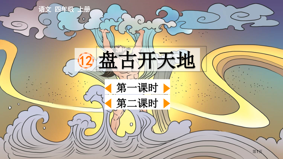 单击此处编辑母版标题样式,单击此处编辑母版文本样式,第二级,第三级,第四级,第五级,*,盘古开天地,12,语文,四年级,上册,第一课时,第,二,课时,第1页,神 话,由,人民集体口头创作,表现对自然力量崇敬、斗争及对理想追求虚构故事,属于民间文学,含有较高哲学性、艺术性。千百年来一直是文人墨客与民间艺人进行创作不朽源泉,对后世影响深远。,第一课时,你知道哪些神话故事,呢,?,第2页,嫦娥奔月,牛郎织女,八仙过海,大闹天宫,哪吒闹海,第3页,朗诵课文,读通句子,边读边想象画面。,初读课文,点击图标,听范读,第4页,p,劈,过去,zhu,重而,浊,zhng,一,丈,lng,隆,隆,zh,四,肢,q,躯,干,血,液,y,翘舌音,学认字,第5页,劈,p,浊,zhu,丈,zhng,撑,chng,竭,ji,缓,hun,f,斧,fn,翻,zhng,睁,学写字,累,li,xu,血,y,液,mo,茂,bn,奔,滋,z,拼音开关,第6页,li,“田”,要,写扁点儿,,下面不要写成“系”。,重难点字书写指导,hun,右边,不是“爱”而是“爰”。,第7页,下面,不能写成“戍”或“戌”。,mo,右下不要写成“丝”。,z,第8页,观,察文中四幅图,读课文,找出文中与图画对应段落,并概括主要内容。,第,1,自然段,第,2,自然段,第,3,、,4,自然段,第,5,、,6,自然段,混沌中沉睡,劈开天地,顶天立地,化身万物,整体感知,第9页,你能用按照起因、经过、结果次序说一说课文主要内容吗?,天地还没有分开,时,,盘古在混沌中沉睡。盘古醒来后拿起斧头向黑暗劈去,使天地分开,,,然后头顶天,脚踏地,直到天地形成,累得倒下。最终盘古身体化成了漂亮世界。,第10页,自读课文,勾画出你认为神奇描写。品读这些语句,边读边想象画面,与同学进行交流。,互动课堂,第11页,第,1,自然段,宇宙未分开之时,混沌景象非常神奇,既令人恐惧又让人好奇,极具吸引力。,盘古能在其中沉睡一万八千年,不可思议,一定是在积蓄力量,等候神秘使命召唤。,天地未形成前情景是怎样?说说你感受。,第12页,第,2,自然段,你“看”到了盘古劈天开地时哪些神奇画面?,“看”到画面:盘古一睡醒就拿着斧头把黑暗劈开,天地瞬间分开,世界一下子就变得光明了。,“看”到画面,:天在升高,地在下降,就像一部科幻大片在上演。,第13页,重,而,浊,东西,,,慢慢,下降,,,变成了,地,。,轻,而,清,东西,,,缓缓,上升,,,变成了,天,,,第14页,清,浊,轻,重,上升,下降,第15页,从盘古一系列动作,你感受到了盘古怎样人物形象?,力大无比,勇于开创,第16页,创(),液,(),枪()夜(),宗()肢(),踪()肌(),祖宗,踪迹,四肢,枪手,创造,肌肤,液体,夜晚,一、辨字组词。,课堂演练,第17页,二、,将以下搭配恰当词语用线连起来。,巍峨,辽阔,奔流不息,江河,巨人,大地,第18页,盘古开天辟地是我国,_,。,A.,神话故事,B.,寓言故事,C.,喜剧,A,三、选择题。,第19页,这,节课,我们在掌握生字词同时,也知道了盘古在沉睡中清醒,感受到了他用神力劈开天地神奇,故事中还有许多神奇地方等着大家去发觉,我们下节课再继续学习吧,。,课文小结,第20页,借助这两,幅插图,,请你简明,讲一讲盘古在沉睡中清醒和劈开“大鸡蛋”情,节。,第,二,课时,复习导入,第21页,第,3,、,4,自然段,为了不让天地再合起来,盘古做了什么?,互动课堂,第22页,你能把盘古做法,用,一个,成语,来,概括,吗,?,顶天,立地,第23页,普通居民楼,从外面看,大约一层楼高度。,一,丈是,3.3,米,大约是多长呢,?,你,知道“一丈”有多高吗?,第24页,运动会上,当我精疲力竭地跑到终点时,全班同学都涌向我,为我欢呼!,你能联络自己在运动会上赛跑、拔河或野外登山等生活经验,利用“精疲力竭”写个句子吗?,第25页,盘古,这个巍峨巨人就像一根柱子,撑在天和地,之间。,盘古这个巨人,就像一根柱子,,立在,天和地,之间。,对比品味:哪一句更能带给我们画面感?,“巍峨”,这个词不但写出了盘古身体像山一样高大,还让我感受到他巨大力量,,坚不可摧。,第26页,盘古,这个巍峨巨人就像一根柱子,撑在天和地,之间。,盘古这个巨人,就像一根柱子,,立在,天和地,之间。,第,一句话不但写出了盘古用双手和双臂顶起天地动作,还表现出他支撑天地用尽全力,而且坚持不懈精神,天地辽阔,巨人,伟岸。,只是,站着,很,普通。,需要,双手双脚和全身同时,发力,。,只是,站着,很,普通。,需要,双手双脚和全身同时,发力,。,第27页,在朗诵中,你好像看到了盘古撑开天地时哪些神奇画面?,盘古,身体会伴随天地改变而,改变,真是“神人”有“神力”。,盘古在天地间撑了一万八千年一直没有放弃,日复一日,年复一年,感觉好漫长啊。那时世界什么也没有,盘古孤零零,很寂寞,第28页,第,5,、,6,自然段,中心句,第29页,四季风,飘动云,气息,他呼出,气息变成,了四季风和飘动,云。,第30页,他,发出,声音化作,了隆隆,雷声。,隆隆雷声,宇宙之间从此有了声音,这是多么令人激动啊!,声音,第31页,温暖,光明,他,左眼变成了,太阳,,照耀大地,,他右眼,变成了,月亮,,给夜晚带来了光,明。,眼睛,第32页,他,四肢,和,躯干,变成,了大地四极和五方名,山。,四肢和躯干,第33页,他,血液变成,了奔流不息江,河。,请,你结合动图,,利用“奔流不息”写,个句子吧!,汹涌黄河水奔流不息,让人感到气势壮观!,血液,第34页,他,汗毛,变成,了茂盛花草树,木。,花草树木,汗毛,第35页,他,汗水,变成,了滋润万物,雨露,雨露,汗水,第36页,从,这些神奇改变中你发觉了什么?,巨人,声音一定是非常宏亮,所以,作者就把盘古发出,声音,想象,成了隆隆雷声。,第37页,盘古左眼变成
