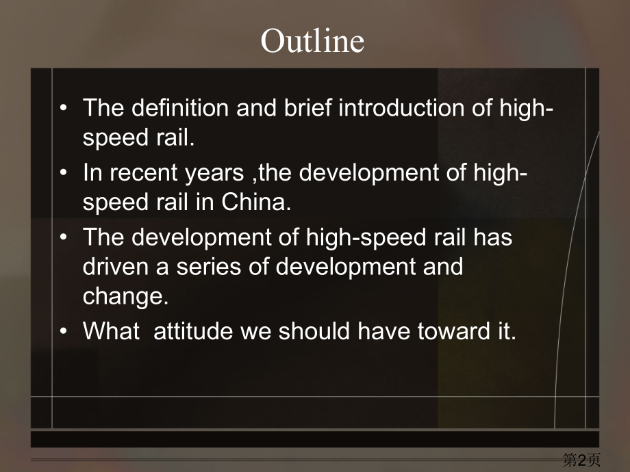 单击此处编辑母版标题样式,单击此处编辑母版文本样式,第二级,第三级,第四级,第五级,*,本幻灯片资料仅供参考,不能作为科学依据,如有不当之处,请参考专业资料。谢谢,单击此处编辑母版标题样式,单击此处编辑母版文本样式,第二级,第三级,第四级,第五级,*,本幻灯片资料仅供参考,不能作为科学依据,如有不当之处,请参考专业资料。谢谢,Chinas Recent Development of High-Speed Rail,Student:*,ID:*,Instructor:*,第1页,Outline,The definition and brief introduction of high-speed rail.,In recent years,the development of high-speed rail in China.,The development of high-speed rail has driven a series of development and change.,What attitude we should have toward it.,第2页,The definition and brief introduction,.,High-speed rail,is the operating rate of which is more than 200 kilometers per hour by the transformation of the original line;or,new purpose-built high-speed line,the operating rate of which is more than 250 kilometers per hour.,.In addition to high-speed rail trains speed in the operation reach the certain standard,vehicles,track,operations need to meet the increase.,第3页,The definition and brief introduction,.At present,there are four models of high-speed rail train in china,they are CRH1,CRH2,CRH3 and CRH5.The head of the CRH locomotive just like a bullet.Whatever how fast,the passengers will feel smooth and comfortable inside.,.However,high-speed rail train is sensitive to the wind,rain,snow,earthquake.Its full range of video surveillance ensure the safety of the train.,第4页,There are 8 can run in two direction,There are 8 cars or 16 cars,because it can run in two direction,It looks very warm inside!,第5页,There are 8 can run in two direction,It also has a dinner car!,The toilets are very clean!,第6页,In recent years,the development of high-speed rail in China,In fact,Chinas high-speed rail represents the speed of the worlds high-speed rail.,.Currently the worlds highest rate of investment in the actual operation still is Wuhan-Guangzhou high-speed rail which is at a top speed of 394 kilometers per hour.,第7页,In recent years,the development of high-speed rail in China,.As the first truly high-speed railway,Beijing-Tianjin high-speed rail stand in the forefront,which created operational speed,volume,energy saving,comfort,four NO.1in the world.,第8页,In recent years,the development of high-speed rail in China,.A.,China has had the first high-speed railway the Beijing-Tianjin Intercity railway with speed of more than 300 km per hour.,B.,China also had built the longest distance of the world and highest operating speed which is Wuhan-Guangzhou Passenger Line.,第9页,In recent years,the development of high-speed rail in China,C.In -year,China will build railway which will treat Beijing as the center of the 8-hour high-speed rail traffic circle.Beijing to the capital cities of all provinces,will be in 8 hours.,D.Till,“Four vertical and four horizontal”planning will be completed.,第10页,The development has driven a series of development and change,.Shorten the travel time,resulting in enormous social benefits.,.Improve Chinas international status.,.Playing an important role in promoting the economic development and land development along the city;,.Increasing the number of firms along.A corresponding increase in national and local tax.,.Saving energy and reducing environmental pollution.,.resulted in greater competition on Civil Aviation.,第11页,What attitude we should have toward it,Problems:,.The price for ordinary people is high.,.Residents along the high-speed rail are disturbed by the noise.,.In order to maintain the world,too much money will be put into the development of high-speed rail which will affect states other aspects of development.,第12页,What attitude we should have toward it,Problems:,Only in,Ministry of RailwaysInvestment in high-iron is more than 1 trillion RMB,account for the State 4 trillion,nearly a third of the total investment.Involving such a large number of investment,but it is difficult for public to know the specific input-output data.,第13页,What attitude we should have toward it,Attitude:,.Overall,the development of high-speed rail is a good thing which benefits the country.We should support moderatly.,.We should distinguish the form of promoting the balanced development of national economy.,.As a graduate,we should do our best to solve these problem existed or develop other areas.,第14页,Summary,.In recent years,the development of Chinas high-speed rail is rapid.,.The reason is a lot of Human and material resources are put into it.,.,High-speed rail caused a series of profits and also a lot of problems at the same time.,.We should have right attitude and do right things toward the rapid development.,第15页,Thank you for your listening!,第16页,
