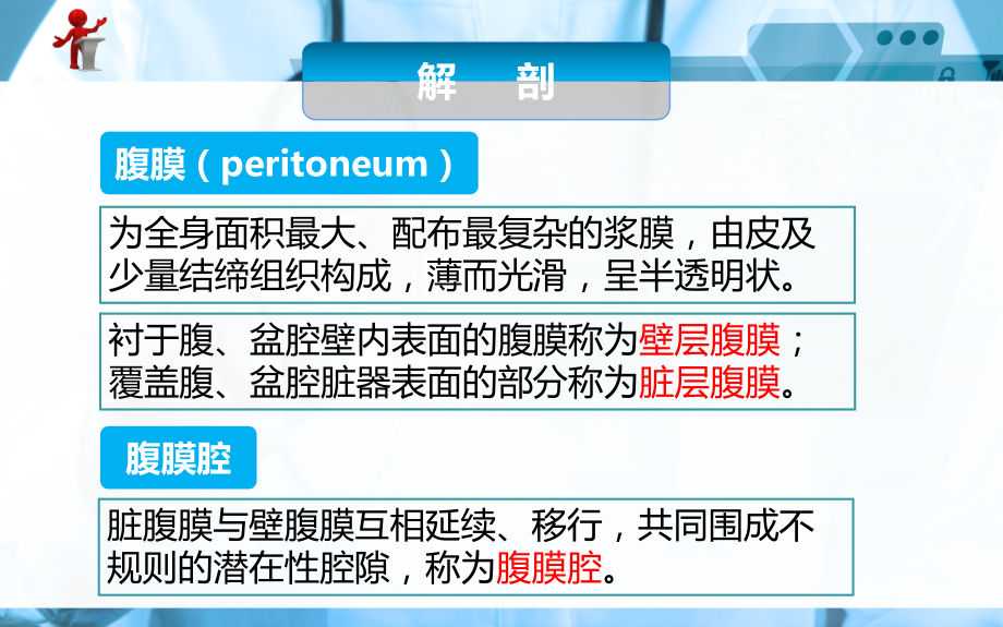 ,第十四章 急性化脓性腹膜炎与腹部损伤病人的护理,第一节 急性化脓性腹膜炎病人的护理,腹膜(peritoneum),为全身面积最大、配布最复杂的浆膜,由皮及少量结缔组织构成,薄而光滑,呈半透明状。,解 剖,衬于腹、盆腔壁内表面的腹膜称为,壁层腹膜,;覆盖腹、盆腔脏器表面的部分称为,脏层腹膜,。,腹膜腔,脏腹膜与壁腹膜互相延续、移行,共同围成不规则的潜在性腔隙,称为,腹膜腔,。,腹膜的生理作用,生 理,润滑,吸收,渗出,防御,修复,急性腹膜炎:是由化脓性细菌感染或受化学、物理等因素刺激而引起的,腹膜的急性炎症,。,发病机制,原发性腹膜炎,继发性腹膜炎,分 类,病 因,细菌性(化脓性)腹膜炎,非细菌性腹膜炎,累及范围,局限性腹膜炎,弥漫性腹膜炎,分 类,临床过程,急,性,腹膜炎,亚急,性,腹膜炎,慢性,腹膜炎,临床上以,急性,、,继发性,、,弥漫性,、,化脓性,腹膜炎最为常见,临床所称的急性腹膜炎多指,继发性的急性化脓性腹膜炎,病 因 及 分 类,继发性腹膜炎,1,是由腹腔内脏器穿孔、破裂、炎症、腹部损伤或手术污染引起的腹膜炎。,最常见,引起继发性腹膜炎的常见致病菌为,大肠埃希杆菌,、厌氧类杆菌、变形杆菌、粪链球菌等,多为,混合感染,。,病 因 及 分 类,(1),腹内脏器的穿孔或破裂,:,最为常见,如急性阑尾炎穿孔,急性胃、十二指肠溃疡穿孔,以及腹部损伤引起腹内空腔脏器破裂等。,(2)腹内脏器感染及扩散:,如急性化脓性阑尾炎、急性化脓性胆囊炎、急性胰腺炎、女性生殖系化脓性炎症等感染扩散而引起。,(3)其他:,腹腔手术污染,胃肠道、胆道及胰管吻合口漏等。,常见病因,病 因 及 分 类,原发性腹膜炎,2,指腹腔内无原发病灶,细菌经血液循环、淋巴途径或女性生殖道等途径侵入腹腔引起。,致病菌多为溶血性链球菌、肺炎双球菌等。,临床上较少见,,多发生于儿童,,尤其是10岁以下的营养不良的女孩常见。,血细菌培养多能培养出病原菌。,原发性腹膜炎感染广泛,一般不需手术治疗。,病 理 生 理,腹膜受刺激,充血、水肿,大量渗出,脓液,白细胞和吞噬细胞的增多,细胞坏死、纤维蛋白的凝固,病 理 生 理,病变严重者,腹膜严重充血水肿并大量渗出可引起严重的,水、电解质代谢紊乱和酸碱平衡失调,,同时细菌入侵和毒素吸收易致,感染性休克,。,腹腔内器官浸泡于脓性渗出液体中,可形成,麻痹性肠梗阻,。,肠腔内大量积液,加之高热、呕吐,引起,血容量明显减少,。,肠管因麻痹扩张使膈肌抬高,从而影响心、肺功能,并加重休克,可,导致病人死亡,。,病 理 生 理,病变轻者,病灶可被大网膜包裹,炎症局限,形成,局限性腹膜炎,,渗液被吸收,炎症消散而痊愈。,若渗出液不能被完全吸收,则形成,腹腔脓肿,。,询问病人既往有无胃、十二指肠溃疡病或阑尾炎等发作史,有无腹部手术史或外伤史,有无嗜烟、酗酒等不良生活习惯史,发病前有无暴饮暴食、剧烈活动等诱因。,护理评估,对成人还要询问有无肝炎、肝硬化病史,对小儿要了解有无肾病、猩红热或营养不良等引起机体抵抗力低下的病史,对女性病人还应了解有无生殖器感染史等。,护理评估,腹痛,1,恶心、呕吐,2,全身感染中毒病状,3,腹部体征,4,急性腹膜炎的并发症,5,护理评估,腹痛,1,腹痛多自原发病变部位开始,随炎症扩散而波及全腹,但仍,以原发病灶部位最为显著,。,腹痛的特点为,持续性剧烈的腹痛,,病人常难以忍受;在深呼吸、咳嗽或变动体位时能使疼痛加重,故病人常不愿活动,呈蜷曲侧卧被动体位。,最主要的症状,护理评估,恶心、呕吐,2,早期为腹膜受到刺激引起反射性恶心、呕吐,呕吐物为胃内容物。,发生麻痹性肠梗阻,呕吐物常含有黄绿色胆汁,甚至粪样肠内容物。,较早出现的常见症状,护理评估,全身感染中毒病状,3,因腹腔内大量细菌毒素及坏死组织分解产物被吸收,病人可出现高热、脉快、大汗、气促、疲乏、食欲下降等,全身感染中毒症状,。,由于大量体液渗出,可导致病人口渴、尿少、皮肤干燥、眼窝内陷、呼吸加深加快等,水、电解质紊乱及代谢性酸中毒的表现,。,严重者可出现面色苍白或发绀,四肢发凉,呼吸急促,脉搏微弱,血压下降,神志不清等,感染性,休克征象,。,护理评估,腹部体征,4,视诊:腹胀,腹式呼吸减弱或消失。,腹胀加重是病情恶化的重要标志。,触诊:腹部压痛、反跳痛和肌紧张,三者合称,腹膜刺激征,,为,腹膜炎的标志性体征,。,叩诊:因胃肠胀气,腹部叩诊多呈,鼓音,;胃肠道穿孔时,,肝浊音界可缩小或消失,;腹腔内渗液较多时可叩出,移动性浊音,。,护理评估,腹部体征,4,听诊:肠鸣音减弱或消失。,直肠指检:急性腹膜炎波及盆腔或并发,盆腔脓肿,时,直肠前窝饱满,直肠前壁有触痛或波动感。,护理评估,急性腹膜炎的并发症,5,急性腹膜炎渗出液不能完全吸收并局限于腹腔的某一部位而形成腹腔脓肿。,腹腔脓肿,脓肿刺激膈肌可引起,呃逆,最常见,主要表现为直肠刺激征或膀胱刺激征,主要有腹痛或肠梗阻的表现,膈下脓肿,盆腔脓肿,肠间脓肿,护理评估,急性腹膜炎的并发症,5,腹膜炎痊愈后,腹腔内因遗有纤维素粘连,使部分肠管扭曲或受压,形成粘连性肠梗阻。,粘连性肠梗阻,护理评估,急性腹膜炎起病急骤,病情重,病人往往表现为焦虑、烦躁、恐惧。,心理-社会状况,当非手术治疗无效而中转手术或因病情严重而决定急诊手术时,病人及家属为手术及愈后感到担忧。,当病人疼痛剧烈,但因