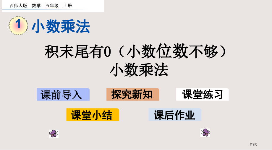 单击此处编辑母版标题样式,单击此处编辑母版文本样式,第二级,第三级,第四级,第五级,2021/10/3,#,西师大版 数学 五年级 上册,积末尾有,0,(小数,位数,不够)小数乘法,课前导入,探究新知,课堂小结,课后作业,小,数乘法,课堂练习,1,第1页,课前导入,怎样计算小数乘小数?,1.,先按照整数乘法算出积;,2.,看两个因数中一共有几位小数,就从积右边起数出几位,点上小数点。,第2页,九折,八五折,探究新知,本月产奶多少吨?,上月产奶,8.35,吨。,本月产奶是上月,1.8,倍。,第3页,8.351.8=,8.3 5,1.8,6 6 8 0,8 3 5,1 5 0 3 0,积末尾有,0,怎么办?,先点上小数点,再把,0,去掉。,.,15.03,(吨),答:本月产奶,15.03,吨。,第4页,计算。,0.560.04=,0.5 6,0.0 4,2 2 4,两位小数,两位小数,四位小数,乘得积小数位数不够,要在前面用,0,补足,再点小数点。,0,.,0,0.0224,第5页,0.250.14=,0.2 5,0.1 4,1 0 0,2 5,3 5 0,0.0,0.035,当积小数位数不够时,用,0,补足,再点小数点。最终去掉末尾,0.,第6页,计算小数乘法时:,先按整数乘法算出积。,再给积点上小数点。,积末尾有,0,,点上小数点后去掉,0,。,积小数位数不够,在前面用,0,补足。,第7页,试一试,0.170.02=0.430.12=,0.1 7,0.0 2,0.0 0 3 4,0.0034,0.4 3,0.1 2,8 6,4 3,0.0 5 1 6,0.0516,第8页,0.050.25=0.370.28=,0.0 5,0.2 5,0.0 1 2 5,0.3 7,0.2 8,2 9 6,7 4,0.0125,0.1 0 3 6,0.1036,第9页,计算并发觉规律。,271.39=270.43=,1.0625=0.0725=,1.823=0.370.4=,两个因数相乘,假如第二个因数大于,1,,那么积一定大于第一个因数。,37.53,11.61,26.5,1.75,41.4,0.148,第10页,填一填,课堂练习,7560.9756,20.942.94,14.251.114.25,31.41.231.4,第11页,选择,1.,以下各式中,结果是,33.12,是()。,A.850.92 B.7.24.6 C.8.94.8,2.0.250.4,积是()。,A.0.1 B.1 C.0.01,3.,两个因数分别扩大,10,倍,它们积扩()倍。,A.100 B.1000 C.10,B,A,A,第12页,竖式计算。,1.0625=0.370.4=,1.0 6,2 5,5 3 0,2 1 2,2 6.5 0,26.5,0.3 7,0.4,0.1 4 8,0.148,第13页,蒙古牛普通体重是,0.326,吨,新培育草原红牛体重是蒙古牛,1.3,倍。草原红牛体重是多少?,0.3261.3=0.4238,(吨),答:草原红牛体重是,0.4238,吨。,第14页,小明妈妈在水果店买了,6.8kg,苹果,单价是,4.85,元,/,千克。你能帮小明妈妈算算应付多少钱吗?,6.84.85=32.98,(元),答:,小明妈妈应付,32.98,元。,第15页,这节课你们都学会了哪些知识?,课堂小结,1.,先按照整数乘法算出积。,2.,看两个因数中一共有几位小数,就从积右边起数出几位,点上小数点。,3.,积末尾有,0,,点上小数点后去掉。,4.,积小数位数不够,在前面用,0,补足。,第16页,1.,从教材课后习题中选取;,2.,从课时练中选取。,课后作业,第17页,