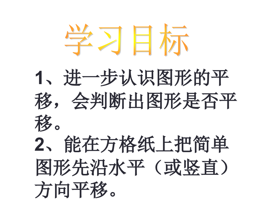 单击此处编辑母版标题样式,单击此处编辑母版文本样式,第二级,第三级,第四级,第五级,*,*,*,单击此处编辑母版标题样式,单击此处编辑母版文本样式,第二级,第三级,第四级,第五级,*,图形的平移,苏教版四年级数学下册,学习目标,1,、进一步认识图形的平移,,会判断出图形是否平移,。,2,、能在方格纸上把简单图形先沿水平(或竖直)方向平移。,大家认真自学书上第一页的例题,并思考下面的问题(,5,分钟),导学问题:,1,、小船图和金鱼图的运动有什么相同点和不同点?,2,、平移之后图形的什么没有变,?,3,、怎样移能做到即快又准?,下面的小船图和金鱼图分别是怎样运动的,?,他们的运动有什么相同点和不同点?,小鱼图和小船图都是向右平移,小船图平移的距离比,小鱼图远一些。,看帆船上的一条线段,这条线段向右平移了,9,格,小船图就向右平移,9,格,看船头的一个点,这个点向右平移了,9,格,小船图就向右平移,9,格,如何数小船和小鱼的平移距离?,9,格,9,格,用这个方法数一数小鱼平移的距离。,7,格,7,格,平行四边形先向下平移,3,格,课本第二页。,3,格,练一练第,1,题,课本第二页。,10,格,独立完成练一练第,1,题,课本第二页。,思考:平行四边形先向右平移,5,格,再向上平移,4,格。,5,格,平行四边形先向右平移,5,格,再向上平移,4,格。,5,格,4,格,把蓝色正方形都向右平移,8,格,分别涂上颜色;把红色正方形向左平移,4,格,涂上颜色。,画一画:梯形先向下平移,2,格,再向左平移,7,格。,将图中的小船向左平移格。,如图,小船平移得到的图形是,(),小船,A,B,C,D,C,当堂训练,课本第,7,页,“,练习一,”,第,1,、,2,题。,图形的旋转,苏教版四年级数学下册,学习目标,1,、,进一步认识图形的旋转,认识按顺时针或逆时针方向旋转,90,的含义。,2,、,能在方格纸上把简单图形旋转,90,,画出旋转后的图形。,3,、掌握旋转的三要素。,大家认真自学书上第,3,页的例,2,,并思考下面的问题(,5,分钟),导学问题:,1,、图中哦你的转杆打开和关闭分别是怎样运动的?有什么相同点和不同点?,2,、转杆的打开和关闭,分别绕哪个点按什么方向旋转的,?,旋转了多少度?,3,、你能完整的描述转杆打开和关闭的过程吗?,转杆打开,转杆关闭,与时针旋转方向相同的是,顺时针,,,与时针旋转方向相反的是,逆时针,。,转杆打开是,逆时针旋转,90,0,转杆关闭是,顺时针旋转,90,0,90,0,90,0,你会把下边的三角板绕着点,A,旋转,90,0,吗?从,113,页剪下和它同样大的三角形,在图上试一试,A,逆时针旋转,A,顺时针旋转,A,如何画三角形,顺时针旋转,90,0,后,的图形?,A,旋转有哪三要素?,1,、旋转中心。(绕某点),2,、旋转方向。(顺时针或逆时针),3,、旋转角度。(旋转,90,度或其它角度),完整描述旋转:,某图形绕某点顺时针(或逆时针)旋转多少度。如:三角形绕点,A,逆时针旋转,90,。,独立完成练一练第,1,题,课本第二页。,A,A,A,A,A,A,A,当堂训练,课本第,7,页,“,练习一,”,第,3,、,4,题。,认识轴对称图形,苏教版四年级数学下册,学习目标,1,、经历长方形、正方形等轴对成图形各有几条对称轴的探索过程。,2,、会画简单的几何图形的对称轴,加深对轴对称图形特征的认识。,大家认真自学书上第,5,页的例,4,,例,5,并思考下面的问题(,5,分钟),导学问题:,1,、长方形、正方形和平行四边形,哪些是轴对称图形?,2,、动手折一折,长方形有几种不同的折法?,3,、什么样的图形是轴对称图形?,4,、如何补全一个轴对称图形,关键先要找出什么?,对称轴是点划线,,画对称轴时要超过原图,。,折一折,正方形有几条对称轴?,当堂训练,课本第,8,页,“,练习一,”,第,5,、,6,题。,练习一,苏教版四年级数学下册,学习目标,1,、熟练掌握平移的方向和距离。,2,、熟练掌握顺时针和逆时针旋转的含义,能画出简单图形旋转,90,后的图形。,3,、会判断轴对称图形,会画出轴对称图形的另一半,会画出对称轴。,出示自学指导。(,5,分钟),导学问题:,1,、在画平移图形需要注意什么,你是如何准确画出平移后的图形?,2,、旋转有哪三个要点决定的,怎样准确画出旋转后的图形,?,你有什么方法?,3,、怎样的图形是轴对称图形?如何准确画出对称轴和轴对称图形的另一半?,自学检测一:,独立完成课本第,8,页第,7,题。,自学检测二:,完成课本第,8,页第,8,题。,自学检测三:,完成课本第,8,页第,9,题;第,11,题。,当堂训练,课本第,9,页,“,练习一,”,第,10,、,12,题。,