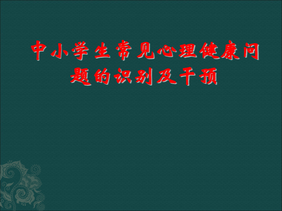 单击此处编辑母版标题样式,单击此处编辑母版文本样式,第二级,第三级,第四级,第五级,*,*,中小学生常见心理健康问题的识别及干预,中国儿童青少年心理不健康状况突出,心理不健康的问题已影响到了中国人才的素质。一项对全国,22,个省市的调查显示,中国儿童,青少年行为问题的检出率为,12.97,,,在人际关系、情绪稳定和学习适应方面的问题尤为突出。,全国第三次精神卫生工作会透露的数据还显示,,有焦虑不安、恐惧、神经衰弱和抑郁情绪等问题的大学生占学生总数的,16,以上。,中国青年报的报道指出,近十几年来,中国社会经济的快速发展、竞争压力的增加等社会因素,导致儿童行为问题、大中学生的心理卫生问题有明显增加的趋势。因心理和行为问题导致的恶性事件屡有发生。,吸烟、吸毒、酗酒、少女怀孕等现象的发生率也呈上升势头。,有专家推算,到,2020,年,中国疾病总负担中精神疾病的负担将从今天的,1,5,上升到,1,4,左右。,中国大陆,17,岁以下未成年人有,3.4,亿。而面对中国现代化进程的急剧加速和与之相伴随的心理问题的明显增长,中国精神卫生工作队伍无论在人才和经费投入上都缺乏足够的准备。,有专家提出,对于儿童青少年心理健康问题,要依靠学校现有的工作队伍和网络,在精神卫生专业人员指导下,有针对性地面向学生开展心理健康教育,使学校心理辅导和心理咨询队伍建设制度化、规范化,逐步实现所有辅导和咨询人员培训后上岗、持证上岗,保证其理论知识和技能水平。,国内外动态,在任何一个国家和地区,儿童都是最重要的自然资源,他们必须处在发展计划的最中心位置,他们的健康、能力、知识和精力都将会决定世界上的农村、城市和国家的将来。,摘自,WHO,文件,新的地平线,国内外动态,据,WHO,估计,全球大约有五分之一的儿童和青少年在成年之前会出现或多或少的情绪或行为问题,主要表现为学习困难、缺乏自信、与同龄人或成人交往困难、吸烟、酗酒、吸毒、过早的性行为、少女怀孕、离家出走、自杀及暴力、犯罪等,其中只有不足,1/5,的人得到了适宜的治疗。,国内外动态,儿童行为问题,-,全球关注的公共卫生问题,WHO,在,1997,年召开的全球心理健康会议上,呼吁重视儿童青少年的心理和行为问题。,国内外动态,儿童行为问题,-,全球关注的公共卫生问题,我国卫生部在,2002-2010,年中国精神卫生工作规划,中明确指出,“要开展重点人群的干预,,应高度重视儿童少年心理行为问题的预防和干预,使学生心理行为问题得到及时的发现和适当的处理。”,国内外动态,2004,年中国精神卫生日是:,关注儿童青少年情绪行为问题,主题,:,快乐心情 健康行为,国内外动态,12-22%,美国儿童有精神障碍,7.5,百万,-1400,万,5-9%,有明显的功能损害,20%,接受精神卫生服务,甚至很少能看儿童精神科医生,而很多孩子是可以各种治疗中,(,药物及其行为治,),得到帮助,.,美国精神卫生中心,一、定义与界限,有些心理学家认为青少年应划分为少年期、青春期、青年期三个阶段,青少年乃是其综合称呼,是儿童与成人间的过渡阶段。一般认为小学生为少年期,中学生为青春期,大学生为青年期。,二、特点,1,、是人生过程的一个重要阶段,2,、发育上的特别过渡阶段,3,、特殊的心理与行为本质:,4,、社会里的特别分子,5,、社会文化影响,三、一般的心理特点,(一)心理内部稳定状态较差,(二)敏感,(三)批判力不足,(四)处在独立意识逐渐形成和最后完成过程中,(五)好胜,(六)韧性差,(七)自控力尚未成熟,(八)涉世不足,人际关系简单化,四、影响青少年心理卫生的常见社会心理因素,(一)文化背景,(二)独生子女问题,(三)家庭的因素,(四)自身个性因素,什么是行为问题呢?,儿童行为问题,(childhood behavior disorders),指在严重程度和持续时间上都超过了相应年龄所允许的正常范围的异常行为,(李雪荣,,1987),,其诊断分类尚未确定,(沈渔村邨,,1995),。,儿童行为问题包括行为和情感两个方面,(,Walton,,,1985,),:行为问题如攻击、不听管教、偷窃、逃学、说谎、离家、纵火等,情感问题如焦虑、恐惧、抑郁和人际关系困难等。,Rutter,的定义,A,行为指反社会行为,即违纪行为,:,经常破坏自己和别人的东西,经常不听管教,时常说谎,欺负别的孩子,偷东西,N,行为指神经症性行为:,肚子疼和呕吐,经常烦恼,对许多事情都烦,害怕新事物和新环境,到学校就哭,或拒绝上学,睡眠障碍,美国教育界常用的定义,学校学习存在问题,人际关系不好,不合适的行为和情感,泛化的抑郁和痛苦,与学校恐怖有关的躯体症状,Kauffman,1981,何种因素导致儿童行为问题呢?,涉及发育因素、气质特点、躯体因素、家庭因素和社会因素等。不同时期的主要危险因素各不相同,母孕和围产期以生物学因素为主,随着年龄增大,在婴幼儿期、特别是学龄期,社会心理因素所起作用越来越大(王玉凤等,,1990,)。,张传芝等(,1996,)研究发现儿童行为问题与家庭生活事件具有伴随关系,且发现父母教育方式不当、家庭气氛不良以及父母角色能力不足等方面与儿童行为问题关系更为密切。,罗学荣等(,1995,)发现与行为问题有关的主要危险因素依次为家庭矛盾冲突多、情感交流差、父母社会经济阶层低、寄养或全托、儿童出生时,(,后,),疾病、精神病家族史和母孕期疾病,亦支持多病因模式。,父母三代家族史:,1.,精神病史(,3.2,),2.,癫痫(,4.7,),3.,多动史(,8.3,),4.M.R.,
