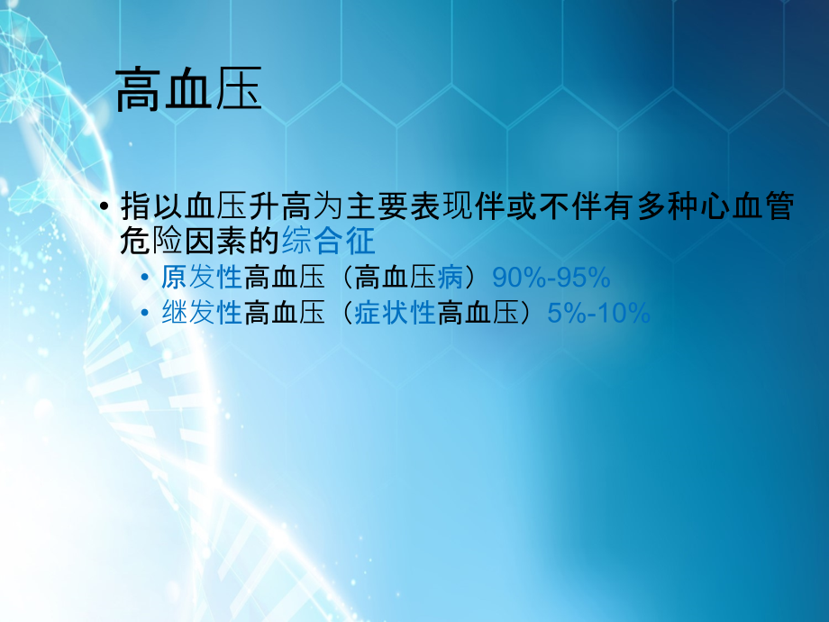 ,原发性高血压,(高血压病),Primary hypertension,高血压,指以血压升高为主要表现伴或不伴有多种心血管危险因素的,综合征,原发性,高血压(高血压,病,),90%-95%,继发性,高血压(,症状性,高血压),5%-10%,一、高血压诊断标准,中国高血压防治指南(20,10),血压分类,SBP(mmHg),DBP(mmHg),正常血压,1,30(90),8,5(60),正常高值,1,30-139,8,5-89,高血压,140,90,诊断标准,1.,诊室血压:,SBP,140,mmHg,或,DBP,90 mmHg,测量,3,次非同日血压均符合上述标准可诊断为高血压,2.24,小时动态血压平均值:全天,1,30/80 mmHg,,,白天,1,35/85 mmHg,,,夜间,1,20/70 mmHg,3.,家庭血压:正确的家庭血压测量每日,2-3,次,建议连续测量,7,天,血压平均值,1,35/85 mmHg,(白大衣高血压(,WCH,)是指有些患者在医生诊室测量血压时血压升高,但在家中自测血压或,24,小时动态血压监测(由患者自身携带测压装置,无医务人员在场)时血压正常。这可能是由于患者见到穿白大衣的医生后精神紧张,血液中出现过多儿茶酚胺,使心跳加快,同时也使外周血管收缩,阻力增加,产生所谓“白大衣效应”,从而导致血压上升),中国高血压防治指南(20,10),血压分类,SBP(mmHg),DBP(mmHg),轻度,(,1级,),140-159,90-99,中度,(,2级,),160-179,100-109,重度,(,3级,),180,110,单纯收缩期,140,90,SBP,与,DBP,不在同一标准时,以,高者,为准,既往有高血压病史,目前正在服用降压药物,现血压虽未达标准,也应诊断高血压,单纯收缩期高血压也可按收缩压水平分为1、2、3级,二、流行病学,原发性高血压是,最常见,的心血管病,长期高血压是多种心、脑血管病的,危险因素,影响,心,、,脑,、,肾,等重要脏器的结构与功能,最终可导致其功能衰竭,三、发病因素,原发性高血压病因尚不清楚,目前认为可能是存在一定的,遗传易感性,(40%),加上多种后天,环境因素,(60%)的相互作用,使正常血压调节机制失代偿所致,9,高血压发病的危险因素,不可改变,的危险因素,可改变,的危险因素,年龄:超重、肥胖者增高,4,倍,男性,55,岁,女性,65,岁 膳食高盐、低钾、低钙,性别:,2.0/1.2mmHg,男性多于女性 长期超量饮酒,3.5/2.1mmHg,遗传因素 缺乏体力活动,长期精神紧张,高血压发病的危险因素,其他因素,避孕药,阻塞性睡眠呼吸暂停综合征(,OSAS),四、发病机制,四、发病机制,一,.,血压的调节神经调节体液调节,二,.,交感神经系统活性亢进,三,.,肾性水钠潴留,四,.,肾素血管紧张素醛固酮系统,五,.,细胞离子转运异常,六,.,胰岛素抵抗,七,.,内皮功能异常,肾素,血管紧张素系统(,RAS,),五、病理改变,动脉,细小动脉硬化玻璃样变,中层平滑肌细胞增殖和纤维化,管壁增厚,管腔狭窄,血管壁重塑或重构,大中动脉粥样硬化,五、病理改变,心脏,左心室肥厚、扩大,心力衰竭,高血压心脏病,五、病理改变,3.,大脑,微小动脉瘤形成、破裂、出血,脑出血,脑动脉粥样硬化,血栓形成,脑梗死,,腔隙性脑梗死,脑出血,脑梗塞,五、病理改变,4.,肾脏,肾小动脉硬化,肾小球纤维化、萎缩,肾功能不全,肾功能衰竭,肾损害,5.,视网膜损害,影响高血压患者心血管预后的重要因素,心血管危险因素水平分层,血压(,mmHg),其他危险因素,1,级,2,级,3,级,和病史,收缩压,140-159,或 收缩压,160-179,或 收缩压 大于,180,或,舒张压,90-99,舒张压,100-109,舒张压,=110,I,无其他危险因素,低危,中危,高危,II 1-2,个危险因素,中危 中危,很高危,III=3,个危险因素 或靶器官损害,高危 高危,很高危,IV,并存临床情况,或糖尿病,很高危 很高危 很高危,一般表现,症状,头昏、头痛、头晕、头胀、眼花、耳鸣、心悸、健忘、易怒、失眠、乏力、注意力不集中等,症状与血压水平不一定成比例,体征,主动脉瓣区第二心音亢进、呈金属音,第四心音,主动脉瓣区收缩期杂音、收缩早期喀喇音,左心室肥大体征,六、临床表现,一般表现,多见于中老年人,起病隐匿,进展缓慢,多无明显症状,常于偶尔体格检查时发现或发生并发症时才发现,2002,年统计,18,岁以上患病率达到,18.8%,七、诊断与鉴别诊断,诊断,确定血压升高,非同日测量血压,2,-3,次达到标准,排除继发性高血压,分级与危险分层量化估计预后,临床病史和家族史,重点了解高血压、糖尿病、血脂紊乱、冠心病、卒中、肾病、心律失常、心力衰竭史,危险因素、靶器官损害、并存临床情况,既往药物治疗,体格检查,测量双上肢血压(必要时测量双下肢血压),体质指数(,BMI,)、,腰围(,WC,),检查眼底,常规实验检查项目,血生化:血钾、空腹血糖、血脂(,TC、LDL-C、HDL-C、TG)、,血尿酸、血肌酐,血红蛋白和红细胞压积,尿液分析:比重、尿蛋白、尿糖和尿沉渣镜检,心电图,进一步实验检查项目,24,h,动态血压监测、超声心动图,、,颈动脉和股动脉超声、空腹及餐后血糖、,C,反应蛋白、微量白蛋白尿、尿蛋白定量、胸片,鉴别诊断,排除继发性高血压,是指由某些确定的疾病或病因引起的动脉血压升高,占所有高血压的5-10%,通过治疗原发病可根治或控制,肾实质性高血压,急性或慢性肾小球肾炎,糖尿病肾病,慢性肾盂肾炎,多囊肾,肾移植后,肾脏损害为主,出现较早,肾血管性高血压,单侧或双侧肾动脉狭窄,肾动脉先天性纤维肌性发育不良,多发性大动脉炎,肾动脉粥样硬化,上腹部或肋脊角可闻及血管杂音,3.,原发性醛固酮增多症,高血压伴,低钾血症,、肌无力、周期性麻痹、烦渴、多尿,血浆醛固酮增多,血浆肾素活性降低,4.,嗜铬细胞瘤,阵发性高血压,伴交感神经兴奋表现、血糖升高、代谢亢进,血和尿儿茶酚胺及其代谢产物3-甲