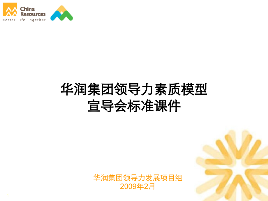 单击此处编辑母版标题样式,单击此处编辑母版文本样式,第二级,第三级,第四级,第五级,*,华润集团领导力发展项目组,2009,年,2,月,华润集团领导力素质模型,宣导会标准课件,1,导入发言,了解领导力发展的基本理论,了解华润集团领导力发展的背景,了解华润集团领导力素质模型及其应用,收集与华润集团领导力素质模型相关的典型故事,制定集团领导力素质模型在本单位的宣传推广计划,研讨会目标,3,研讨会日程,时间,内容,上午,导入发言:介绍会议目标、日程安排,介绍:华润集团领导力发展的背景,介绍:华润集团领导力发展整体思路,介绍:领导力发展基础理论知识,茶歇,介绍:华润集团领导力素质模型及典型故事(中间可安排茶歇休息),下午,介绍:华润集团领导力素质故事征集标准,讨论:对照八项素质各个层级,讲述本行业、本公司的故事,汇报与点评,茶歇,介绍:集团领导力素质模型宣传推广计划,讨论及汇报:领导力素质模型在本单位的宣传推广计划,关闭发言,4,华润集团发展领导力的背景,应对领导者和企业转型的需要,实现战略使命的需要,赢得竞争的需要,持续增长的需要,创造优秀企业文化的需要,成为受人尊重企业的需要,华润集团发展领导力的六大需要,6,领导者转型,从管理一个厂到管理多个厂,到管理一个地区乃至全国性公司的转型,从做好一件工作,搞好一个项目,到做好一盘生意的转型,从创业型经理人到职业型企业家的转型,从主要关注业务,到关注团队和组织能力的转型,从自己亲历亲为,到号召人、凝聚人、引导人、让别人去做的转型,企业转型,从做生意到做企业的转型,从作企业到做行业的转型,从追逐短期盈利到追逐长远企业价值的转型,从传统的生意模式到全价值链增值的创新模式转型,领导者和企业普遍面临快速转型的要求,尽管过去在领导力和组织发展层面做了很多尝试,但尚未发现提升领导力的系统且有效的方法,转型风险无时不在、无处不在,我们能成功转型吗?,应对领导者和企业转型的需要,7,华润要成为优秀的国企,有持续竞争力的国企,要成为基业长青的国企,在主营行业成为领导者是我们的使命,华润目前主营行业已经初步具备了成为行业领先者的条件,成为行业领先者和成功经营一个企业有着本质的不同,我们有无赚钱、赚更多的钱、持续赚更多的钱所必需的人、能力、行为、制度及流程,华润要成为实现经理人价值最大化的平台,面对庄严使命,我们准备好了吗?,实现战略使命的需要,8,面对携先进理念、体系化管理和人才优势的国际巨头,面对机制灵活、速度超常的本土企业,我们在行业领先者的道路上能够走多远?我们在市场领先者的地位上能够停留多久?,赢得竞争的需要,竞争是市场化的最基本的特征,它无时无刻不体现在企业的每个“器官”甚至是“细胞”的残酷竞争,弱肉强食,适(变)者生存,我们的主营行业是高度竞争性行业、过度竞争行业,难度大,中国市场的竞争就是国际化竞争,对手强,成为行业领先者的战略必然成为所有对手关注的焦点,巨大的压力,竞争在市场和产品上展开,更在人才优势和组织能力上展开,文化优势,9,我们普遍走过了开疆拓土、艰苦创业的阶段,正在迈向以企业成熟发展、专业发展、自身能力提升和以内涵式增长为主的另一个崭新阶段,过去我们面临从无到有的矛盾,现在面临从有到卓越的问题,我们现在的很多业务,在这样的规模上,已经超出了我们的领导能力和管理能力的边界。如果不进行能力建设、不培养人才,不仅不能持续发展,连生存都是问题,我们已经进入的行业,持续增长的能力有吗?盈利增长是否伴随营业额的增长而增长?是否回报伴随着营业额的增长而增长?而往往营业额增长而盈利持续不增长,这是一个危险的信号:“企业临界”,当习惯一线作战的经理人,突然面对人才培养、组织发展、核心竞争力打造这些全新的任务,是否还像一线作战那样游刃有余?,持续增长的需要,10,大量的事实证明,从成熟走向卓越的企业其背后真正的原因在于卓越文化的形成,而这种文化才是真正推动企业走向成熟的根本,伴随企业增长,人员增加了,文化却稀释了;亚文化强化,主流文化弱化;同一个华润,不同的文化,一把手是文化的塑造者和传播者,领导风格对组织文化、组织氛围和业绩表现有决定性的影响,一流的企业一定有一流的企业文化,作为文化的塑造和传播者,我们领导人准备好了吗?你是如何做的?,创造优秀企业文化的需要,11,华润走过七十余年光辉历程,历史上我们赢得无数掌声,成为受人尊重的企业是我们新的追求,历史证明,大型企业往往成为推动社会文明的重要力量,未来我们不仅为国家贡献物质财富,更要贡献精神财富,除了经济财富,我们还能拿什么奉献给社会?,成为受人尊重的企业的需要,12,创业家情结,股东代表心态,超级业务经理作风,和谐背后的不坦诚,公司政治,华润集团领导人五大现象,13,华润集团主营行业有今天的市场地位,离不开创业家的拚劲、激情、智慧和胆识。但伴随着业务的成长,“创业家情结”也成为进一步成长的羁绊:,骄傲自满,沾沾自喜,热衷于树立个人权威,股东意识淡漠,将事业成功归为自己的功劳,视经理人队伍为自己的私有财产,当初打天下的同志,搞得不团结,甚至走向分裂,组织氛围差,工作虽富有激情,但作风独断专行,听不进别人的意见,对下属简单粗暴,固步自封,沉湎于