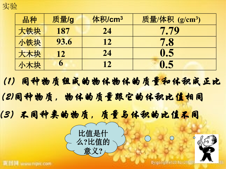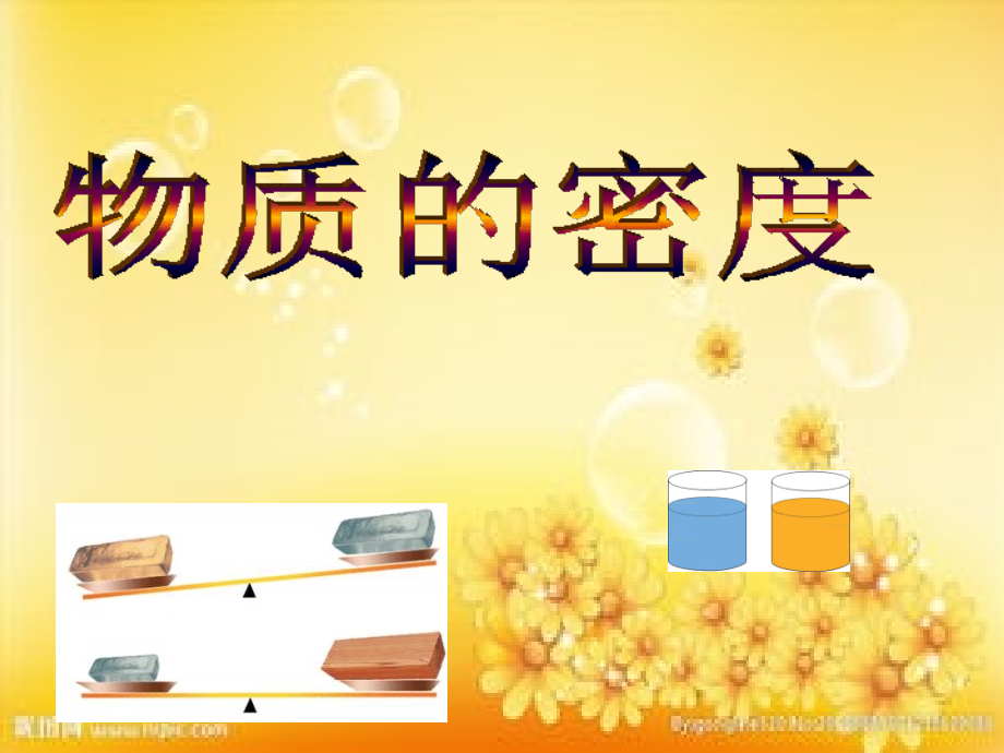 ,*,单击此处编辑母版标题样式,单击此处编辑母版文本样式,第二级,第三级,第四级,第五级,单击此处编辑母版标题样式,单击此处编辑母版文本样式,第二级,第三级,第四级,第五级,*,单击此处编辑母版标题样式,单击此处编辑母版文本样式,第二级,第三级,第四级,第五级,*,物质的密度,品种,质量,/g,体积,/cm,3,大铁块,小铁块,大木块,小木块,(,1,)同种物质组成的物体物体的质量和体积成正比,(,2),同种物质,物体的质量跟它的体积比值相同,(,3,)不同种类的物质,质量与体积的比值不同,质量,/,体积,(g/cm,3,),比值是什么,?,比值的意义,?,187,24,93.6,12,12,12,6,24,实验,7.79,7.8,0.5,0.5,1,密度:单位体积某种物质的质量,叫做这种物质的的密度,公式:,密度,=,质量,体积,=,m,V,单位,:,国际单位,千克,/,米,3,常用单位,克,/,厘米,3,换算关系:,1,克,/,厘米,3,=10,3,千克,/,米,3,水,=_,千克,/,米,3,=_,克,/,厘米,3,110,3,1,2.7,克,/,厘米,3,=,1,1000,千克,1000000,1,米,3,2.7,=2.710,3,千克,/,米,3,水,=110,3,千克,/,米,3,它表示的物理意义?,表示,1,米,3,水的质量是,1000,千克,密度是物质本身的一种属性,它的大小由这种物质本身决定,而与物质的质量,体积等因素无关。,完全免费,无需注册,天天更新!,完全免费,无需注册,天天更新!,例,1.,下面哪几句话是正确的?(),A.,物质的密度与质量成正比,B.,物质的密度与体积成反比,C.,物质的密度等于用该物质组成的物体的质量与体积的比值,D.,同种物质组成的物体,其质量与体积成正比,滑板运动已经成为都市青年最流行、最持久的时尚运动。一块滑板是由板面、滑板支架(滑板桥)和四只滑板轮等部分组成,总质量约为,5,千克,如图,10,所示。其中板面是由一块质量约为,4,千克,体积约为,5,10,3,米,3,的复合材料组成。求:(,1,)组成板面的复合材料密度。,2,为研究物质的某种属性,同学们找来大小不同的蜡块和大小不同的干松木做实验,实验得到如下数据:,(1),请你用图像形象地把两种物质的质量随体积变化的情况表示出来,(,如图,6-10,所示,),。,(2),通过对以上图像的分析,你可以得到什么结论,(,要求写出两条,)?,在物理学上通常用什么物理量来表示物质的这种属性,?,3,如图所示,是某同学测量,AB,两种物质的质量,m,和体积,V,的关系图像,由图可知,,AB,两种物质的密度,A,、,B,之间的关系是(),A.,B,A,水,B.,B,水,A,C.,A,水,B,D.,水,A,B,考点考题聚焦,1,下列有关密度的说法,正确的是(),A,一滴水的密度小于一桶水的密度,B,因为铝比铁轻,所以铝的密度小于铁的密度,C,液体的密度一定小于固体的密度,D,密度是物质的一种特性,2,甲、乙两个物体,质量,之比为,32,,,体积,之比为,13,,那么它们的,密度,之比为(),A,12,B,21,C,29,D,92,3,一只能够容纳,1k,水的瓶子,一定能够容纳得下,1k,的 (),A,白酒,B,食用油,C,盐水,D,煤油,5,如图所示,两只形状相同的烧杯,分别盛有质量相同的水和酒精,试根据图中液面的高低判断,:A,杯盛的是,;B,杯盛的是,.(,已知水的密度大于酒精的密度,),6,工人使用氧气瓶内的氧气进行气焊的过程中,以下有关瓶内氧气的物理量中,不变的是 (),A,质量,B.,体积,C.,密度,D.,内能,4,一个质量为,0.25,的玻璃瓶,盛满水时称得质量是,1.5,,若盛满某液体时称得质量是,1.75,,那么该液体的密度是 (),.1.7510,m,3,.1.210,m,3,.1.1610,m,3,.1.010,m,3,7,如图所示,甲、乙球的体积相同,此时天平平衡,则,甲:,乙为,(),A.2:1 B.1:2 C.3:4 D.4:3,8,如图所示,是常见物质的密度,其中液体酒精的密度为,_,kg/m3,其物理含义,_,是:,,若将一块金属铝切去,2/5,,则剩余部分铝块的密度将,(选填,“,变大,”,、,“,变小,”,或,“,不变,”,),这反映了密度是,一种属性。,9,为了研究物质的某种特性,某同学分别用甲、乙两种不同的液体做实验实验时,他用量筒和天平分别测出甲,(,或乙,),液体在不同体积时的质量下表记录的是实验测得的数据及求得的质量与体积的比值,分析下表中实验序号,1,与,2(2,与,3,、,l,与,3),或,4,与,5(5,与,6,、,4,与,6),的体积与质量变化的倍数关系,可归纳得出的结论是,:_,分析上表中实验序号:,可归纳得出的结论是:体积相同的甲、乙两种液体,它们的质量不相同,同种物质,质量与体积成正比,1,与,4,、,2,与,5,、,3,与,6,9,为了研究物质的某种特性,某同学分别用甲、乙两种不同的液体做实验实验时,他用量筒和天平分别测出甲,(,或乙,),液体在不同体积时的质量下表记录的是实验测得的数据及求得的质量与体积的比值,分析上表中甲、乙两种液体的质量与体积的比值关系,可归纳得出的结论是:,_,_,同种物质组成的物体,其质量与体积的比值相同,不同种物质组成的物体,其质量与体积的比值不相同,例,2,如图所示,一副铜合金架的质量为,2,10,-2,kg,若以钛合金代替铜合金,求一副以钛合金镜架的质量,求一块体积为,410,-6,m,3,玻璃镜片的质量为多少,?,三星学科,教师助手,学生帮手,家长朋友!,m,2,m,1,m,0,水,液体,例,3,一玻璃瓶的质量为,300,克,装满水时总质量为,800,克,装满另一种液体时总质量为,700,克,问,(,1,)这个瓶子的容积是多少?,(,2,)另一种液体的密度是多大?,例,4,质量是,9,千克的冰水混合物,一半质量是水,另一半是冰,它们的总体积是多大,?,若冰全部化成水,总体积是多大,?,若水全部结成冰总体积多大,?(,冰,=0.9,10,3,千克,/,米,3,),一卷铜线的横截面积是,2,毫米,2,质量是,267,千克,这卷铜线的长度是多少米,?(,铜,=8.910,3,千克,/,米,3,),S,h,例,6,一个铜球体积是,1000,厘米,3,,质量是,7000,克,问这是实心球还是