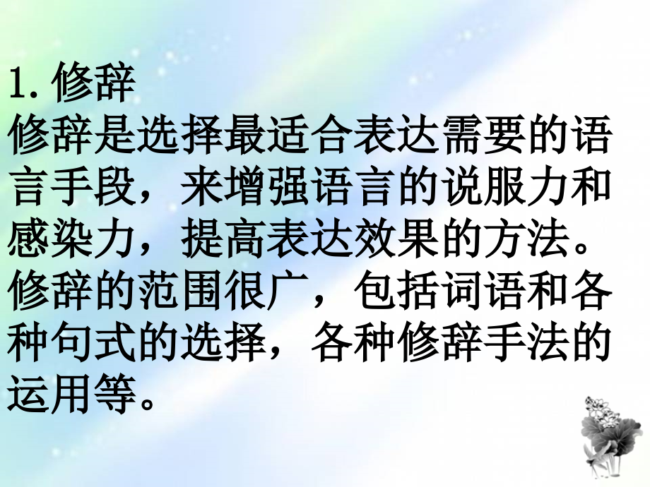单击此处编辑母版标题样式,单击此处编辑母版文本样式,第二级,第三级,第四级,第五级,*,*,单击此处编辑母版标题样式,单击此处编辑母版文本样式,第二级,第三级,第四级,第五级,*,*,单击此处编辑母版标题样式,单击此处编辑母版文本样式,第二级,第三级,第四级,第五级,*,*,单击此处编辑母版标题样式,单击此处编辑母版文本样式,第二级,第三级,第四级,第五级,*,*,单击此处编辑母版标题样式,单击此处编辑母版文本样式,第二级,第三级,第四级,第五级,*,*,单击此处编辑母版标题样式,单击此处编辑母版文本样式,第二级,第三级,第四级,第五级,*,*,单击此处编辑母版标题样式,单击此处编辑母版文本样式,第二级,第三级,第四级,第五级,*,*,高中修辞手法总结,1.,修辞,修辞是选择最适合表达需要的语言手段,来增强语言的说服力和感染力,提高表达效果的方法。修辞的范围很广,包括词语和各种句式的选择,各种修辞手法的运用等。,修辞手法又叫做修辞方式或修辞格。它是人们艺术地使用语言的比较固定的格式。常用的修辞手法有比喻,通感,比拟,借代,夸张,对偶,对比,排比,设问,反问,反复,反语,引用,顶真,双关等。,2.,修辞手法,【,比喻,】,比喻是用相似的事物打比方,即抓住两种不同性质的事物的相似点,用一事物来比类另一事物,也就是用具体的、浅显的、熟知的事物来说明或描述抽象的、深奥的、生疏的事物的一种修辞手法。,下面将对每种修辞手法进行具体讲解,比喻的作用:化平淡为生动,化深奥为浅显,化抽象为具体,化冗长为简洁。,比喻的分类:明喻、暗喻、借喻,明喻:非常明显的比喻,本体与喻体是相似关系。,典型格式:甲像乙,比喻词:像、似、若、好像、如同、仿佛、像,一样、如,一般,例子:月光如流水一般,静静地泻在这一片叶子和花上。,用比喻的修辞手法,描绘了荷塘上月光的清纯柔和。,明喻修辞手法比较多的保留在成语中,如:,如花似玉、度日如年、寥若晨星、门庭若市、归心似箭、情深似海,暗喻,:,暗喻又叫隐喻,是一种不太明显的比喻,本体与喻体是相同关系。,典型格式,:,甲是乙,甲变成乙,常用喻词:变成,成为是,等于,化为,例子:翠湖的茶花多,开得也好,红彤彤的一大片,简直就是那一段彩云落到湖岸上。,“,茶花就是云彩,”,,实际是用,“,彩云,”,比喻,“,茶花,”,。,成语中用到暗喻的有:,一言九鼎,人老珠黄,犬马之劳,草木皆兵,鱼贯而入,有口皆碑,唇枪舌剑,借喻:借喻是不说本体,而把喻体直接用在本体应该出现的地方,句中也没有比喻词出现。,例子:我必须把我放在炉火里,看看我是不是钢铁。,用喻体,“,炉火,”,来比喻,“,极其艰苦的战斗环境,”,,但在句子中只出现了喻体。,辨析比喻的修辞手法时还要注意:,A.,同类事物的具体比较不是比喻。,B.,猜测不是比喻。,C.,单一想象不是比喻。,D.,表举例,列举不是比喻。,E.,表示否定不是比喻。,把各种感觉(听觉,视觉,嗅觉,味觉,触觉等)沟通起来,用甲感觉去写乙感觉,又叫移觉。,例子,塘中的月色并不均匀,但光与影有着和谐的旋律,如 梵婀玲上奏着的名曲。,这是视觉移植为听觉,月的光华和阴影,朦胧婆娑,相互衬映,以小提琴演奏的,“,名曲,”,的旋律来形容它们的和谐声响,来表现月光树影组合的协调,给人一种悠扬,优美柔和的感觉,同时烘托出一种温馨、幽雅的氛围,将读者带入一种美好的幻境。,【,通感,】,比拟是根据本体事物和拟作事物之间的可拟性,借助联想和想象而形成的辞格,把物当成人来写,或把人当成物来写,或把甲物当成乙物来写。,比拟的方式:拟人和拟物,【,比拟,】,即把事物当成人来写,赋予人的思想,感情,活动。可以将物体描写得具体,生动形象,使人感到亲切,更易受到感染。,例子,油蛉在这里低唱,蟋蟀们在这里弹琴。,句子以动物拟人,赋予它们以人的特性,说它们,“,唱歌,”“,弹琴,”,,写出了自由欢乐的情景。,【,拟人,】,一是把人当作动物,植物或非生物来描写,赋予人以动物、植物或非生物的某些特征;二是将物拟作物。,例子,那肥大的荷叶下面,有一个人的脸,下半截身子长在水里。荷花变成了人,那不是我们的水生吗?又往左右看去,不久,各人便找到了各人丈夫的脸,啊,原来是他们!,将人拟为荷,将隐蔽荷叶下面的人物化了,显得那么清新,美丽,可爱,!,【,拟物,】,【,借代,】,说话或写文章时不直接说出或写出所要描绘的人或物,而是借用这个人或物密切相关的人或物来代替,也叫换名。被替代的叫本体,替代的叫借体,本体不出现用借体来代替。,作用,突出事物的本质特征,增强语言的形象性,使文笔简洁精炼,语言赋予变化和幽默感。,引入联想使表达收到形象突出,特点鲜明,具体生动的效果。,把名字刻入石头的,名字比尸首烂得更早。,这里的,“,石头,”,代指纪念碑,含蓄的揭示出与人民为敌的反动统治者想名垂后世的美梦终将破灭。,例子,为了表达强烈的思想感情,更突出,更鲜明的表达某一事物的本质特征,运用丰富的想象力,对事物的形象,特征,程度等做扩大或缩小的描述,也叫夸饰。,有三种形式:扩大夸张,缩小夸张,超前夸张,。,【,夸张,】,扩大夸张:蜀道之难,难于上青天。,缩小夸张:五岭逶迤腾细浪,乌蒙磅礴走泥丸,。,超前夸张:看看这样绿油油的麦苗,张老汉就似乎闻到了白馒头的香味。,【,对偶,】,对偶俗称,“,对对子,”,诗歌中叫,“,对仗,”,,是把结构相同或相似、字数相