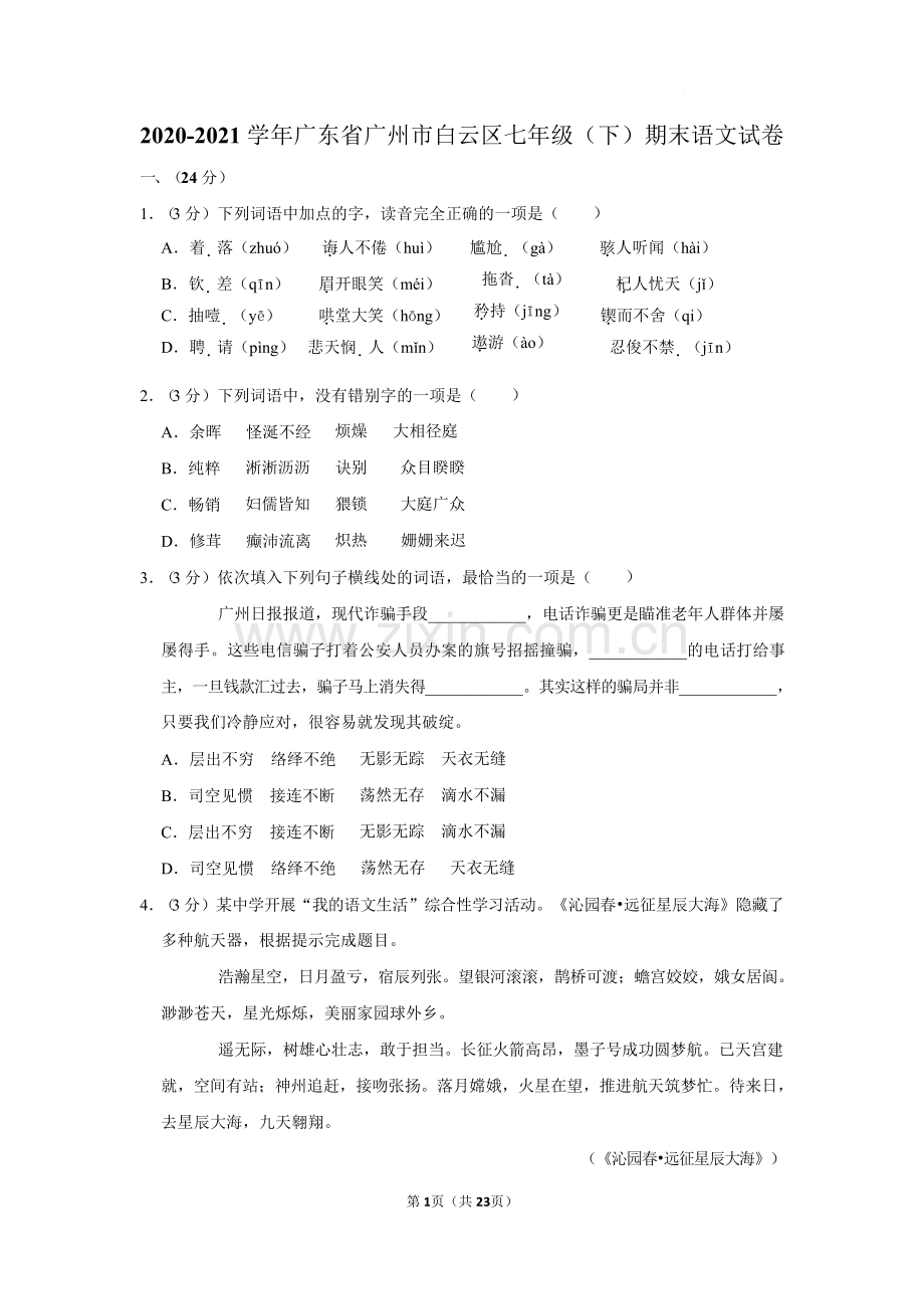 020-2021 学年广东省广州市白云区七年级(下)期末语文试卷