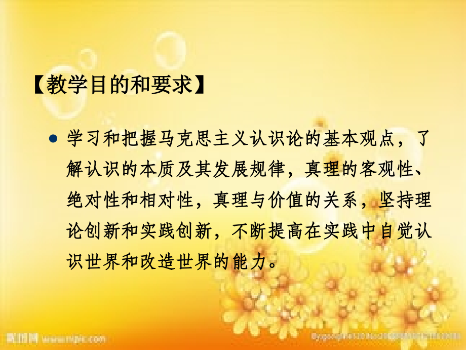 单击此处编辑母版标题样式,单击此处编辑母版文本样式,第二级,第三级,第四级,第五级,*,单击此处编辑母版标题样式,单击此处编辑母版文本样式,第二级,第三级,第四级,第五级,*,单击此处编辑母版标题样式,单击此处编辑母版文本样式,第二级,第三级,第四级,第五级,*,单击此处编辑母版标题样式,单击此处编辑母版文本样式,第二级,第三级,第四级,第五级,*,单击此处编辑母版文本样式,第二级,第三级,第四级,第五级,*,单击此处编辑母版标题样式,单击此处编辑母版标题样式,单击此处编辑母版文本样式,第二级,第三级,第四级,第五级,*,单击此处编辑母版标题样式,单击此处编辑母版文本样式,第二级,第三级,第四级,第五级,*,单击此处编辑母版标题样式,单击此处编辑母版文本样式,第二级,第三级,第四级,第五级,*,*,单击此处编辑母版标题样式,单击此处编辑母版文本样式,第二级,第三级,第四级,第五级,单击此处编辑母版标题样式,单击此处编辑母版文本样式,第二级,第三级,第四级,第五级,*,单击此处编辑母版标题样式,单击此处编辑母版文本样式,第二级,第三级,第四级,第五级,*,单击此处编辑母版标题样式,单击此处编辑母版文本样式,第二级,第三级,第四级,第五级,*,第二章 认识世界和改造世界,【教学目的和要求,】,学习和把握马克思主义认识论的基本观点,了解认识的本质及其发展规律,真理的客观性、绝对性和相对性,真理与价值的关系,坚持理论创新和实践创新,不断提高在实践中自觉认识世界和改造世界的能力。,【教学要点,】,辩证唯物主义认识论是能动的反映论,实践的观点是辩证唯物主义认识论首要的基本的观点,人类认识的本质及其发展规律,真理的客观性、绝对性和相对性,真理与价值的关系,正确认识世界和改造世界,【教学内容,】,第二章认识世界和改造世界,第一节认识的本质及规律,第二节真理与价值,第三节认识与实践的统一,第一节,认识的本质及规律,一、实践是认识的基础,(一)实践的构成要素,从实践活动的机制看,实践是主体与客体之间通过一定的中介发生相互作用的过程。,实践的构成要素:,实践,主体,中介,客体,1.,主体,主体,是指具有思维能力、从事实践活动和认识活动的人。,基本形式:个人主体、集团主体和社会主体。,属性:自然性、社会性、意识性、实践性。,2.,客体,客体,是指主体的实践活动和认识活动所指向的对象。,基本形式:自然客体、社会客体和精神客体。,属性:客观性、对象性、社会历史性。,客体与客观事物的,区别,:,客观事物是指不以人的意识为转移的一切事物,当客观事物尚未进入到人的实践和认识领域时,它还只是自在的客观实在。只有与主体发生一定的实践和认识关系的客观事物,才属于客体。,3.,中介,中介,是指各种形式的工具、手段以及应用操作这些工具的程序和方法。,在认识过程中,中介系统由物质性认识工具、观念性认识工具和作为感性符号系统的语言工具组成。,(二)主体和客体的关系,1.,主体和客体之间的关系,实践关系,:,改造与被改造的关系,认识关系,:,反映与被反映的关系,价值关系,:,客体满足主体需要的利益关系,审美关系,:,主体在改造和认识客体中得到的美感,2.,主体和客体的相互作用,一方面是主体客体化;另一方面是客体主体化。,“人创造环境,同样环境也创造人。,”,马克思,(三)实践的环节,1.,确立实践目的和实践方案,实践目的是指实践主体根据自身的需要和对实践客体的认识而对实践结果的构想,是实践主体对未来的实践结果的预测和预见。实践方案是指人们为了实现实践目的而制定的实践活动的规则、程序和步骤。,2.,实践方案的实施,实践主体按照实践目的和实践方案实际的作用与实践客体,通过一定的实践手段,把实践方案变成实际的实践活动。,3.,反馈调节,通过反馈和调节,使实践目的、手段和结果按一定方向运行。正是通过这些环节,实践活动过程在主体的自觉意识支配下,带能动的变革着客观世界的同时也能动的改造着自身的实践能力。,(四)实践在认识中的决定作用,1.,实践是认识的来源,毛泽东:,“,人的正确思想是从哪里来的?是从天上掉下来的吗?不是。是自己头脑里固有的吗?不是。人的正确思想,只能从社会实践中来,”,。,为什么说实践是认识的来源?,第一,认识产生于实践的需要。例如:,农牧业生产天文学,丈量土地数学,建筑业、手工业力学,无产阶级革命斗争马克思列宁主义,改革开放中国特色社会主义理论体系,恩格斯:,“,社会一旦有技术上的需要,这种需要就会比十所大学更能把科学推向前进。,”,1820,1895,第二,,认识是在实践活动中产生的。,人们在实践活动中才能更真切地接触认识对象,从而产生感性认识,并在此基础上进一步形成理性认识,即对事物本质的认识。,第三,一切真知都来自于实践。,人的知识来源包括直接经验和间接经验。一个人的知识,绝大部分来自间接经验。因此,要重视读书、重视向他人请教。间接经验是,“,流,”,,直接经验才是,“,源,”,。马克思主义强调直接经验的重要性,是因为一切真知最终来源于实践。很多问题必须亲身实践、亲自体会,才会理解得深刻。,“,纸上得来终觉浅,绝知此事要躬行,”,。,2.,实践是认识发展的动力,对于个人来说,,“,好奇心,”,、,“,求知欲,”,、,“,理论兴趣,”,对于认识发展都有一定的推动作用。但就整