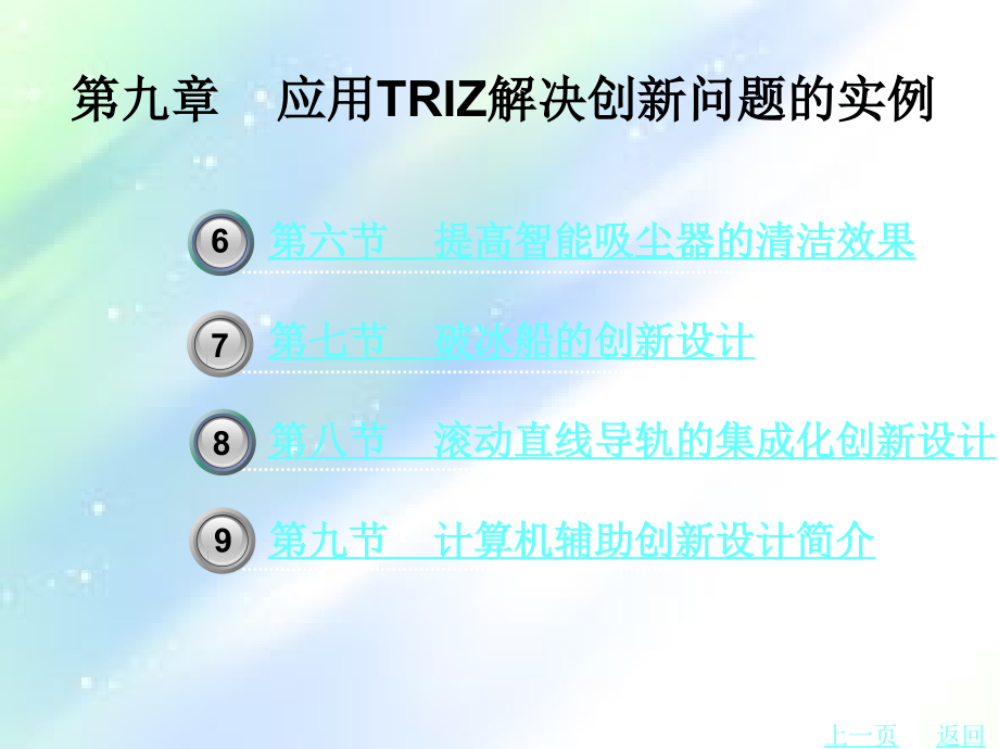 单击此处编辑母版标题样式,单击此处编辑母版文本样式,第二级,*,第九章 应用,TRIZ,解决创新问题的实例,1,2,4,3,3,5,第一节 污水管材的创新设计,第二节 薄板玻璃的加工,第三节 减少热处理过程中的烟雾污染,第四节 宝马汽车的外形设计,第五节 飞机机翼的进化,下一页,返回,第九章 应用,TRIZ,解决创新问题的实例,6,7,9,3,8,第六节 提高智能吸尘器的清洁效果,第七节 破冰船的创新设计,第八节,滚动直线导轨的集成化创新设计,第九节,计算机辅助创新设计简介,上一页,返回,第九章 应用,TRIZ,解决创新问题的实例,利用,TRIZ,理论解决发明问题时,可能使用到该理论的一个或多个工具,,图,9-1,所示为利用,TRIZ,理论解决问题的流程图,该图不仅描述了,TRIZ,理论各工具之间的关系,也描述了产品创新设计问题的解决方法。在解决发明问题时,首先是对给定的问题进行分析,包括系统的功能分析、理想化目标分析以及可用资源分析等。若发现系统存在技术冲突,则利用,TRIZ,理论提供的技术冲突矩阵加以解决,;,若所需解决的问题明确,但不知道如何进行处理,则可通过功能分析应用效应知识库直接来解决,;,也可对需要创新的技术系统进行进化过程的预测,并应用物场理论和,76,个标准解法找到进化途径。当利用,TRIZ,理论的工具获得问题的解决方案后,需对候选方案进行评估,包括理想化评估和系统特性评估,检验候选方案是否满足系统目标要求,是否符合进化模式要求。,下一页,返回,第九章 应用,TRIZ,解决创新问题的实例,在对候选方案进行评估后,若候选方案达到满意的要求,则进行后续的设计工作,;,反之,需要利用,TRIZ,对问题进行反复循环的分析,直到找出解决问题的最终可行方案。由此可见,利用,TRIZ,理论解决问题的关键是应用之前的前处理和应用之后的后处理。,TRIZ,作为解决发明问题的比较实用的创新理论,更应强调其在科研和生产实践中的应用,强调由应用而给企业带来的实际效益。下面通过一些实例,介绍,TRIZ,理论在科研和生产中的应用情况。,上一页,返回,第一节 污水管材的创新设计,一、应用背景,随着国家对环境保护力度的加大,传统的水泥管正在逐步退出市场。,20,世纪,90,年代后期,新型替代产品,各类环保排水管材开始在工程上应用。,在排污管道领域,应用较多的是塑料管,如,PV C,双壁波纹管、,PE,双壁波纹管、高密度聚乙烯,(HDPE),缠绕结构壁管等。近年来,采用欧洲瑞士与美国技术制作的镀锌螺旋钢管开始进入国内市场,广泛应用于通风、雨水管道系统中,由于受防腐性能的限制,还没有大量在污水管道工程中使用。,二、问题描述,下一页,返回,第一节 污水管材的创新设计,污水管道系统要求管材具有较高的可靠性,由于管材既要求承受静载荷又要求承受动载荷,所以要求管材必须具有较高的环刚度。由于污水具有一定的酸碱度并伴有沙土等,所以要求管材既要耐腐蚀,又要耐磨损。,分析塑料管及镀锌螺旋钢管的性能差别,主要是由于材质不同,而造成两类管材性能上具有的优势不同。镀锌螺旋钢管的优点是环刚度较大,耗材较少,不足是防腐性能一般,并且不耐磨损,;,塑料管的优点是耐腐蚀、耐磨损,但是环刚度的提高受到限制,耗材较多。,三、问题分析,根据以上对问题的描述,从承受载荷、提高刚度的角度讲,镀锌螺旋钢管本身强度好,使用镀锌螺旋钢管具有明显的优势,但其本身不耐腐蚀、不耐磨损,可靠性下降,致使其使用寿命降低。,上一页,下一页,返回,第一节 污水管材的创新设计,因此,若要改善镀锌螺旋钢管的耐腐蚀、耐磨损性能,提高其可靠性,就要增加镀锌层的钢板厚度,使运动物体重量增加,提高刚度与消耗钢材之间形成一对明显冲突,;,从耐腐蚀、耐磨损角度讲,使用塑料管有一定的优势,但当管道直径超过一定值时,塑料管承受载荷加大,其工作可靠性降低,提高刚度与消耗管材之间也形成一对明显冲突。,在提高管材可靠性的同时,应降低材料消耗,减轻介质对管道内壁的流动磨损和减少有害介质的浓度。从材料力学的角度考虑,当通过提高材料弹性模量受限时,只能另辟新径采用增强设计,但增强设计只是一个实现理想化的命题,究竟应采用怎样的设计方案能够解决提高刚度与减少材料之间的冲突,从而设计生产出一种新型管材,使其既具有钢管的高刚度性能,又具有塑料管的耐腐蚀、耐酸碱性能呢,?,上一页,下一页,返回,第一节 污水管材的创新设计,四、问题解决,1.,将一般领域间题描述转换成,39,项工程参数中的两项,即转换为,TRIZ,标准间题,无论是塑料管还是镀锌螺旋钢管,若要提高其环刚度,就要增加耗材,技术冲突是既要提高管材强度,同时管材的单位重量还要下降。根据对技术冲突的描述,将该技术冲突转换为,39,项工程参数中的两项,:,(1),工程参数,14,号强度,:,强度指物体受到外力作用时,抵制使其发生变化的能力,;,或者在外部影响下的抵抗破坏,(,分裂,),和不发生形变的性质。在此问题中,管材强度要提高,为改善的参数。,(2),工程参数,1,号运动物体的重量,:,运动物体的重量指重力场中的运动物体作用在阻止其自由下落的支撑物上的力,重量也常常表示物体的质量。,上一页,下一页,返回,第一节 污水管材的创新设计,在此问题中,管材的单位重量要提高,为恶化的参数。,2.,根据得到的工程参数,确定解决间题需要的发明原理,根据得到的两个工程参数,改善参