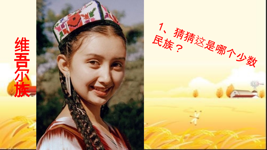 单击此处编辑母版标题样式,编辑母版文本样式,第二级,第三级,第四级,第五级,少数民族,1,、猜猜这是哪个少数民族?,维吾尔族,服饰,:,维吾尔族男性-讲究黑白效果,这样粗犷奔放。维吾尔族妇女-喜用对比色彩,使红得更亮,绿得更翠。因为维吾尔族是个爱花的民族,所以人们戴的是绣花帽,着的是绣花衣,穿的是 绣花鞋,扎的是绣花巾,背的是绣花袋,衣着服饰无不与鲜花息息相关。,维吾尔族舞蹈的特点是与民间音乐结合得十分紧密。舞蹈时,头、肩、腰、臂、肘、膝、脚都有动作,还有“动脖”、“打指头”、“翻腕子”等一系列小动作,眼睛尤其传神。这一切形成了维吾尔族舞蹈的鲜明特点。,舞 蹈,美食,2,、猜猜这是哪个少数民族?,藏族,藏袍是藏族人民的平常衣着,也是区别于其他民族最显著的特征。藏族服饰的基本特征是长袖、宽腰、长裙、长靴。这较大程度上取决于藏族人民所处生态环境和在此基础上形成的生产、生活方式。穿用这种结构肥大的服装夜间和衣而眠可以当作棉被抵御风寒;袍袖宽敞,臂膀伸缩自如,白天气温上升更可脱出一个臂膀,方便散热,调节体温。所以,脱掉一只袖子的装束便形成了藏族服装特有的风格,服饰,标题数字等都可以通过点击和重新输入进行更改,顶部“开始”面板中可以对字体、字号、颜色、行距等进行修改。,标题数字等都可以通过点击和重新输入进行更改,顶部“开始”面板中可以对字体、字号、颜色、行距等进行修改。,标题数字等都可以通过点击和重新输入进行更改,顶部“开始”面板中可以对字体、字号、颜色、行距等进行修改。,YOUR TITLE HERE,舞 蹈,美食:,糌粑,美食,3,、猜猜这是哪个民族?,蒙古族,蒙古族服饰也称为蒙古袍,主要包括长袍、腰带、靴子、首饰等。但因地区不同在式样上有所差异。蒙古族服饰具有浓郁的草原风格特色,以袍服为主,便于鞍马骑乘。因为蒙古族长期生活在塞北草原,蒙古族人民不论男女都爱穿长袍。牧区冬装多为光板皮衣,也有绸缎、棉布衣面者。夏装多布类。长袍身端肥大,袖长,多红、黄、深蓝色。男女长袍下摆均不开衩。红、绿绸缎做腰带。,服饰,舞蹈,蒙古族是能歌善舞的民族。蒙古族舞蹈的特点是节奏明快,热情奔放,语汇新颖,风格独特。动作多以抖肩、翻腕来表现蒙古族姑娘欢快优美,热情开朗的性格。男子的舞姿造型挺拔豪迈,步伐轻捷洒脱,表现出蒙古族男性剽悍英武,刚劲有力之美。保留节目有筷子舞、马刀舞、驯马舞、盅碗舞、挤奶员舞、鹰舞、牧民的喜悦、祝福鼓舞等。,饮食,蒙古族原本是草原游牧民族,不事农业种植,饮食食谱以牛羊肉和奶类为主,为助消化,善饮红茶。不仅喝鲜奶,也做奶酪,酸奶,奶豆腐等奶类食品。肉类则有烤肉,肉干等,这与中原汉族不同,蒙古族不善于做各种肉类烹调,不会炖肉或者红烧。,手扒肉,马奶酒,美 食,4,、猜猜我是哪个少数民族?,苗 族,服饰:,苗族服饰是我国所有民族服饰中最为华丽的服饰,苗族服饰样式繁多,据不完全统计多达200多种样式,年代跨度大。湘西方言苗区和黔东方言苗区喜好银饰,黔南某些地区喜好贝饰,而西部方言区苗族服饰则少银饰。银饰、苗绣、蜡染是苗族服饰的主要特色。苗族妇女的腊染技艺水平很高,能染出有各种精美图案和花鸟的衣裙、手帕和巾帽,因而苗族妇女的头饰是一件精美的艺术品。,吊 脚 楼,苗族大多居住在山区,山高坡陡,开挖地基极不容易,加上天气阴雨多变,潮湿多雾,砖屋底层地气很重,不宜起居。因而,苗族历来依山傍水,构筑一种通风性能好的干爽的木楼,叫吊脚楼。,苗族的吊脚楼通常建造在斜坡上,分两层或三层。最上层很矮,只放粮食不住人。楼下堆放杂物或作牲口圈。两层者则不盖顶层。一般以竹编糊泥作墙,以草盖顶。现多以改为瓦顶。,舞蹈,苗族是一个能歌善舞的民族,人人会唱歌、跳舞,几千年来,歌舞伴随着苗族的历史,生动地反映出苗族人民的生活。苗族的歌舞,最富有山野味,古朴、粗犷的风格,最能表达他们真挚、纯朴的思想情操,也最能使人感受到民间艺术的真、善、美。,饮食,苗族半数以上居住在贵州,其余分布在湖南、云南、广西、四川等地。苗族人食物以大米为主,辅以包谷、小米、高粱、小麦和薯类等杂粮。苗族人最喜食糯米。苗族人口味以酸、辣为主,尤其喜食辣椒。日常菜肴主要是酸辣味汤菜。酸菜味鲜可口,制作方便,可生食,也可熟食。苗家的酸汤煮鱼是风味名菜。苗家男女都喜欢酒,大部分人家都能自己酿酒。,三色饭,烧糍粑,美 食,酸汤鱼,竹筒饭,猜猜我是哪个少数民族?,壮族,服饰:,壮族服饰简称壮服主要有蓝、黑、棕三种颜色。壮族妇女有植棉纺纱的习惯,纺纱、织布、染布是一项家庭手工业。男子礼服惯穿长袍,外面套上一件短褂,通称长衫配马褂,起先是头戴顶圆帽,后来改戴礼帽。男女都穿布鞋。,壮族舞蹈源于对狩猎的模仿,但它常与巫师酬神的活动密切联系。巫师敬神总是边跳边唱,乐神消灾祈福。这种舞姿的形状是两臂张开弯肘上举,两腿蹲成弓步,动作粗犷有力,赋有特色,被称为蛙形舞姿。壮族民间其它舞蹈,多模仿劳动动作。据统计,表现劳动和爱情生活的舞蹈多达几十种。著名的有舂堂舞、扁担舞、蜂鼓舞、采茶舞、戽斗舞、绣球舞、捞虾舞、桃叶舞、斑鸠舞等。,舞,蹈,美食,壮族的饮食,在种植稻米的地区,喜食大米饭、大米粥,喜欢