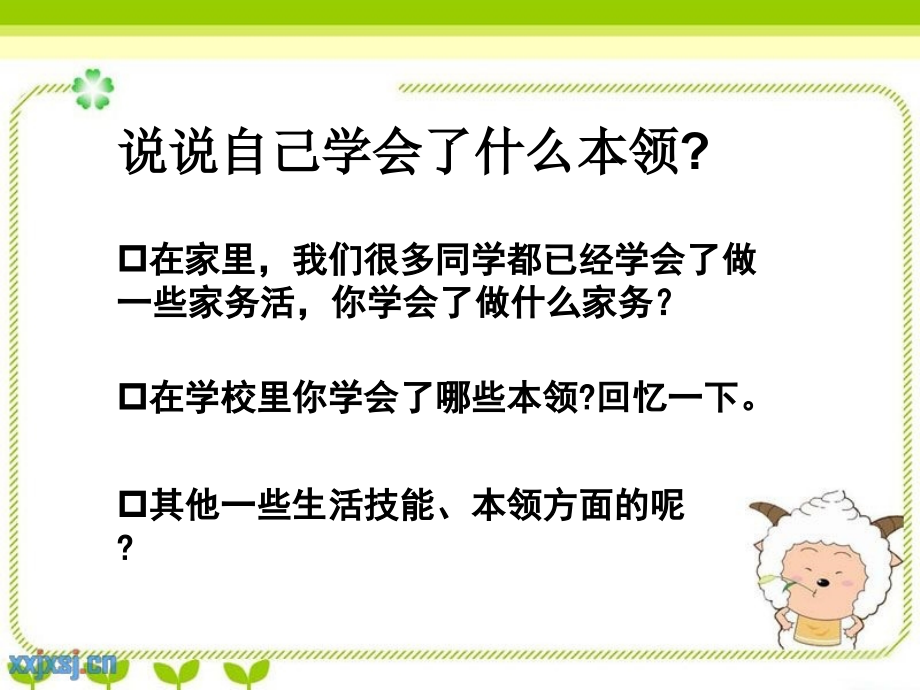 单击此处编辑母版标题样式,单击此处编辑母版文本样式,第二级,第三级,第四级,第五级,*,我学会了,说说自己学会了什么本领,?,在学校里你学会了哪些本领,?,回忆一下。,在家里,我们很多同学都已经学会了做一些家务活,你学会了做什么家务?,其他一些生活技能、本领方面的呢,?,劳动方面,:,洗衣服、做饭、洗碗、洗菜、生火、包饺子、包粽子、系鞋带、整理房间,学校文艺、体育方面,:,唱歌、跳舞、弹钢琴、跳绳、打乒乓球、下象棋、踢足球,学习方面,:,做实验、观察、打字,生活技能方面,:,游泳、骑自行车、搞小制作、摄影等,1,、,你学本领过程中遇到什么困难?,如:为了学会骑自行车,你摔倒过无数次;为了练书法,你累得胳膊都发疼了;为了学会弹琴,你的手都酸了,枯燥的练习,使你几次落泪了,打开记忆之门,2,、遇到困难时,你是怎么想的、怎么做的?谁在你最灰心的时候给了你帮助、鼓励?他说了些什么呢,?,是怎么说的,?,你又是怎么想的,?,这些帮助对你起什么作用,?,你自己又是怎么克服困难去学会这一本领的,?,体验细节,3,、还要写上自己的真实感受。,如,:,学习过程中,面对困难时有了战胜困难的勇气;意志得到了锻炼,变得越来越坚强了。,如:,学会了游泳,磨炼了意志,锻炼了身体,增强了体质;学会了下棋,懂得如何去面对困难,也学会了用耐心和智慧去战胜困难等。,这些点题的话可以在文章中间写,也可以写在文章最后。,智慧启迪,我学会了,*,为什么学(起因),怎么学会的(经过),学会以后的事(结果),顺序,动作,语言,神态,心理,心情,我学会了游泳,因为我怕水,所以我决定去学游泳。(原因:为什么学游泳),今年暑假期间,我参加了游泳培训班,每天早上九点去游泳馆训练。,第一次去游泳馆,我心里想,这么深的水,我踩不到底沉下去可怎么办呢?,正在这时,刘教练开始教我们做游泳前的准备活动了,之后又教我蛙泳的腿部动作。他让我趴在岸边练习:第一,小腿向上翻;第二,脚掌翻起来朝天;第三,双腿向后弧形蹬开;第四,合拢双腿。四个动作中,我觉得第二个是最难学的。当我对所有动作熟练了一些,教练就让我背着救生板在水里练习,同时训练在水中憋气。在随后的几天里,我身上的背板越来越少,当背板全部摘掉的时候,刘教练又让我从岸上跳到水里游,我心里非常害怕,不敢往下跳,结果刘教练把我当成球一样,“,踢,”,了下去!我不小心喝了两口水,心里很紧张,但是我的情绪很快的稳定下来,两腿用力向后一蹬,我顺利的游了出去,我成功了!(经过:我是怎么学会的。),“,世上无难事,只要肯登攀。,”,十天过去了,我已经掌握了蛙泳和仰泳的基本动作。当妈妈带我来到游泳池时,我像条小泥鳅似的在水里自由自在地游来游去,甚至比妈妈游得还快呢!(结果:懂得成功的道理。),开始洗碗了,.,做让妈妈欣慰的事,第一步,:,倒入洗洁精,第二步,:,擦洗碗筷,第二步:擦洗碗筷,第三步:清洗真干净,学会洗碗好开心!,我虽然只是三年级的学生,但已经学会了不少本领。如滑滑板、打羽毛球、打篮球,每到周末,我写完作业就会去篮球场滑滑板。想起我刚开始学滑板的时候我可吃了不少苦头。刚上一年级,我看见小伙伴们踩着滑板快活地滑来滑去真羡慕。就吵着妈妈买了一块滑板。刚开始学的时候,我站在滑板上只摇晃,我踩在滑板上,只好扶着墙,用心地看见小伙伴是怎样滑的。只见他们轻轻地摆动后脚滑板才可以向前滑去,于是我模仿别人的动作,慢慢地向前滑去,果然可以向前前去了。但是滑到了一个转弯的地方,我不会转弯,吓得我连忙跳下来。后来我又仔细看别人怎么转弯,只见他们在转弯的时候动了一下前脚就把滑板转个弯了。我又学他们转弯的动作,果然可以转弯了。,虽然我摔了几次,但是我学会了滑滑板,真高兴。,我学会了滑滑板,题目:我学会了(),1.,(),我学会了()。,2.,刚开始时,我()。后来,我(),经过(包括经历的趣事、困难,如何克服困难,得到了谁的帮助或鼓励),开头:点明主题,学会了什么?,中间:按事情发展顺序写,自己是怎么学的。,结尾:学会之后的感想、体会。,3.,我学会了(),通过学习(),我明白了()。,每当我看见商场里的那辆自行车,就很想叫爸爸妈妈买。今天,我生日了,妈妈把那辆漂亮的自行车送给了我。,我怀着一颗怦怦直跳的心跨上了自行车,紧张地把脚踏在脚踏板上,就在这时,发生了一件让我措手不及的事:车子先是摇晃了几下,然后连人带车往一边倒下去。“哎呀,膝盖怎么这么疼呀!”我的心里不禁埋怨起来:早知道就不学自行车了,这么难学,干脆就不学了。想着想着,我不禁抽泣起来。,(初学骑车,遇到挫折有点灰心。),忽然,一句话在我的耳边回响着:孩子,无论做什么事都要坚持到底,不能半途而废。这是妈妈经常叮嘱我的话。经过第一次的失败,我又重新站起来,不慌不忙地坐在自行车上,左脚踏在脚踏板上,右脚使劲地蹬地,自行车像是被我驯服的野马一样平稳地走着,渐渐地,我把右脚脚踏板上,自行车稳稳当当的走着,我喜出望外,我终于成功了!(坚持不懈,终获成功。),今天,我不仅学会了骑自行车,还懂得了个道理:我们无论做什么事都要坚持,不能半途而废。(明理懂事。),我学会了骑自行车,回忆一下,你的本领是怎样学会的。,在学习的过程中,酸、甜、苦、辣的滋味可能都尝过,其中有些事,可能是你终生难忘的。在这些经历、体验中,选一件感触最深的写下来。写的时