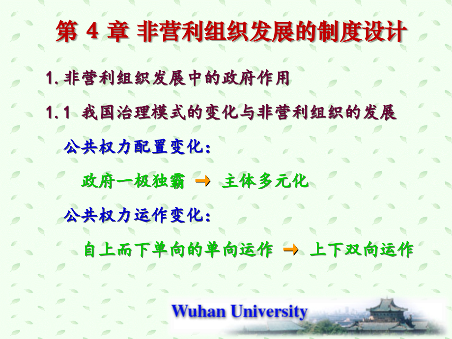 单击此处编辑母版标题样式,单击此处编辑母版文本样式,第二级,第三级,第四级,第五级,*,*,单击此处编辑母版标题样式,单击此处编辑母版文本样式,第二级,第三级,第四级,第五级,*,*,第,4,章 非营利组织发展的制度设计,1.,非营利组织发展中的政府作用,1.1,我国治理模式的变化与非营利组织的发展,公共权力配置变化:,政府一极独霸,主体多元化,公共权力运作变化:,自上而下单向的单向运作,上下双向运作,第,4,章 非营利组织发展的制度设计,公共权力主体与管理主体的多元化对于现阶段中国的意义非同小可,多元化能够防范国家权力扩张和无节制运用。在中国,非营利组织的发展已成为新时代的潮流,非营利组织也有望成为继政府,企业之后的第三股力量。,第,4,章 非营利组织发展的制度设计,目前,由于民主的制度化程度不高和法治体制的不健全,使多元的利益和分化的公共权力得不到有机的整合。一些利益难以通过体制加以表达和整合的社会群体就有可能通过,民间组织,与正式权威对立,造成新的社会冲突。,所以,在强调多元竞争的同时还要注意多元合作,这对于我国政治社会发展和治理模式的转型有重要意义。,第,4,章 非营利组织发展的制度设计,治理模式的转型一方面要求多元竞争,权力分化,另一方面又强调多元合作,权力整合,其实西方国家的治理模式也基本如此。西方非营利组织的基本运作模式是非营利组织与政府相互依赖,相互支持。,第,4,章 非营利组织发展的制度设计,1.2,我国政府在非营利组织发展中的作用,1.2.1,对非营利组织进行扶植和培育,政策上倾斜:如税收优惠,认识上引导:如肯定非营利组织的作用,资金上支持:如国民待遇,第,4,章 非营利组织发展的制度设计,1.2.2,加强对非营利组织的监督,我国对非营利组织的登记环节监督较严,但登记之后的控制却较为松散,使不少非营利组织逐渐蜕化变质而得不到有效的纠正。,第,4,章 非营利组织发展的制度设计,1.2.3,建立政府、企业与非营利组织的竞争,合作关系,政府,的职责主要是制定政策与监控;,营利部门,的主要职责是提供私人产品与服务;,非营利部门,的职责则是提供一定的公共服务,实现民间自治。,这三者之间的关系可以称之为,“,伙伴关系,”,,,第,4,章 非营利组织发展的制度设计,即密切合作,相互有所分工和协调的关系,社会的发展需要政府、营利组织与非营利组织这三种机构的共同努力。,政府在,“,伙伴关系,”,中扮演的角色从手段来看一是立法和制定政策,二是在必要时给以财政方面的资助,以调控非营利事业的发展方向,这也成为政府实现社会稳定与发展的有效手段和途径。,第,4,章 非营利组织发展的制度设计,1.3,正确处理非营利组织发展与政府发挥作用之间的关系应注意的几个原则,(1),投资和举办的多元化,多渠道原则,(2),社会化,市场化原则,(3),现代化、科学化原则,一是合理布局,;,二是科学管理,;,三是机构人员精干化。,第,4,章 非营利组织发展的制度设计,(4),法制化原则,法制化是指确立非营利组织的法人地位,加强非营利组织的立法。,第,4,章 非营利组织发展的制度设计,2.,非营利组织的行政管理体制,2.1,公共事务管理模式与非营利组织,2.1.1,公共事务管理权利义务的分担,公共事务管理权利义务的分担,取决于政府职能的转换,即把一贯由政府直接承担的公共事务转移给政府外的非营利组织。其目的就是打破公共,第,4,章 非营利组织发展的制度设计,事务管理中政府作为唯一主体,包揽一切的格局,逐步实现公共事务管理社会化与分散化。,政府职能的转移,不意味着责任的放弃。政府依然承担着公共事务的政治责任和经济责任,政府有责任培育非营利组织的发展,为非营利组织提供财政支持和税收优惠。,第,4,章 非营利组织发展的制度设计,2.1.2,政府职能转变的作用,(,1,)能以监察者和指导者身份审视公共管理质量和效益,促进公众权益和福利的扩大。,(,2,)有利于政府克服官僚主义倾向,减少政府官员权力腐败的机会,而且可以监督和纠正非营利部门可能出现的,“,政府化,”,及成员的,“,官僚化,”,倾向;,第,4,章 非营利组织发展的制度设计,(,3,)降低了公共事务管理的成本,降低了政府的财政压力;,(,4,)可以较有效地医治与市场经济相伴生的市场失灵,政府失灵,“,综合症,”,;,(,5,)可以吸收进入第一,二产业的剩余人员从事第三产业,(,服务业,),的非营利组织,有利于我国产业结构的优化;,第,4,章 非营利组织发展的制度设计,(,6,)在市场经济条件下,许多事务政府不宜直接插手干预,或者干预成本过高,而交给非营利组织去做,会收到事半功倍的效果。,2.1.3,公共事务的利益共享,在公共事务中,个人的权利、非政府的社会组织的权利与政府的权利是平等的,作用是互惠的,利益是共享的。,第,4,章 非营利组织发展的制度设计,2.1.4,在公共事务管理中引入竞争机制,市场竞争,可以带来资源的优化配置,带来公共物品和公共服务的多样化。但是,公共事务不能像经济事务那样直接通过市场竞争,实现最优化目标,而政府独家垄断公共事务,无论从质还是从量方面衡量,也无法满足公众的普遍需求和特殊需求。,第,4,章 非营利组织发展的制度设计,公共事务管理社会化,承担公共事务的非营利推进组织就可以打破禁区,合情、合理、合法地实现公共管理与市场竞争的有机结合。,首先,营利组织中,“,顾客导向,