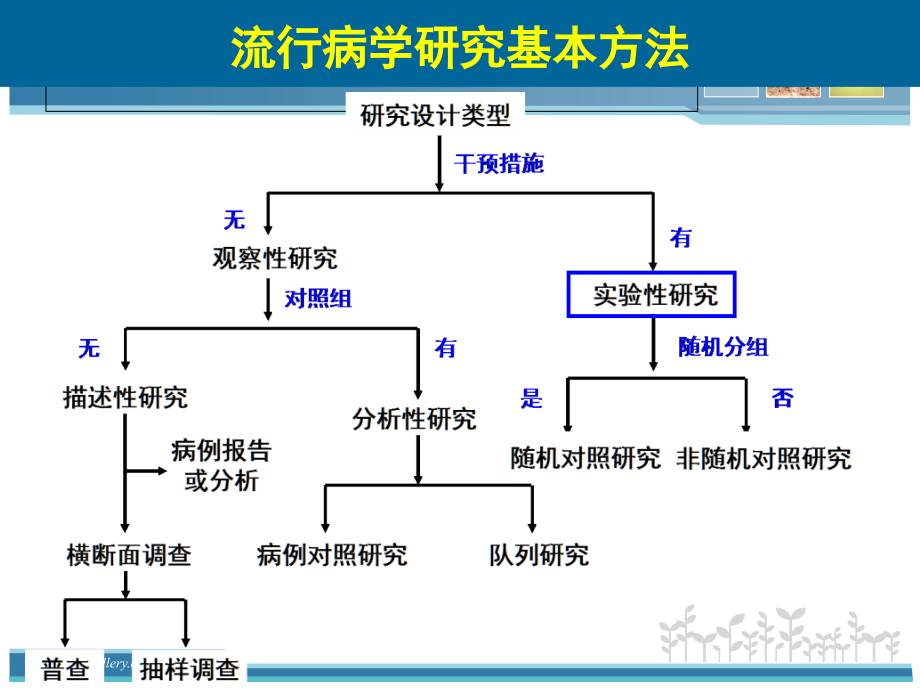 单击此处编辑母版标题样式,单击此处编辑母版文本样式,第二级,第三级,第四级,第五级,*,实 验 性 研 究,experimental study,流行病学研究基本方法,采用随机化分配的方法,将研究对象分配到实验组和对照组,然后接受相应的试验措施,在相同条件下进行随访,观察试验的效应,用客观效应指标进行比较分析,评价试验措施的效果。,一、基本原理,干预因素,对照措施,研究模式,随机分组,A,B,C,D,A/(A+B),C/(C+D),研究对象,分组方法,实验组,对照组,干预,结局,实验性研究,有干预措施,平行对照,随机化分组,基本特征,观察性流行病学,:,自然条件下,人群中事件分布规律和决定因素,实验性流行病学,:,以人群为研究对象的实验研究。,人为条件下,人群中事件分布规律和决定因素。,观察和实验,实验性研究与队列研究的区别和联系?,二、,实验性研究设计的基本原则,随机化,设立对照,盲法观察,重复,目标人群,样本,随机化抽样,(randomized sampling),:总体中的每一个个体都有相同的可能性被抽中作为样本。,增加样本的代表性,1,、随机化的原则,平均数、标准差,发病率、死亡率等,研究结果,抽样,推论,随机化分组,(randomized grouping),:每个研究对象都有相同可能性分在各个研究组中。增加研究组间的可比性,排除非研究因素的影响。,完全随机化分组 抽签法,随机数字、随机排列表,区组随机化分组,分层随机化分组,整群随机化分组,用随机数字法进行完全随机化分组,给每个对象编号,确定一个随机数字,预先确定选择方法,根据随机数字进行分组,特点:设计简单、统计分析简单,要求:研究对象具有较好的同质性;,在小样本时,各组的差别仍可能较大,多组样本的完全随机设计方法,(,complete randomization,),将,15,只小白鼠随机分配到,A,、,B,、,C,三组。,步骤:,1,、编号:将,15,只小白鼠按体重从小到大编号;,2,、从随机数字表中,随机指定某行,抄录,0-14,的随机数字,依次记录于编号下。,3,、按预先规定,余数,0,入,A,组,,1,入,B,组,,2,入,C,组。,编号,1,2,3,4,5,6,7,8,9,10,11,12,13,14,15,随机,数字,56,35,64,38,54,82,46,22,31,62,43,09,90,06,18,除,3,余数,2,2,1,2,0,1,1,1,1,2,1,0,0,0,0,组别,C,C,B,C,A,B,B,B,B,C,B,A,A,A,A,区组,(blocked),随机化分组方法按照一定的条件,将条件相同的研究对象分成若干区组或配伍组,然后在每个区组内按随机化分配的原则,将各个研究对象分到各个组中。,区组,1,区组,2,区组,3,区组,4,按体重高低排序,1,2,3,4,5,6,7,8,9,10,11,12,分配随机数字,31,57,24,55,6,88,77,4,74,47,67,21,按随机数字大小分组,乙,甲,丙,乙,丙,甲,甲,丙,乙,乙,甲,丙,第一层,实验组,1,第二层,第三层,分层随机化分组,研究对象,对照组,1,实验组,2,对照组,2,实验组,2,对照组,2,实验组,对照组,整群随机分组,(,cluster randomization,),按社区或团体分配,即以一个家庭、一个学校、一个医院、一个村庄或居民区等为单位随机分组。这种方法比较方便,但必须保证两组资料的可比性。,2,、设立对照,对照的意义:,排除非研究因素对结果的影响,反映研究因素的真实效应。对可自然痊愈及变化的疾病,有季节变化的慢性病,在以主观感觉或心理效应作为主要观察指标时,都要有相应的对照。,干预实验的效应受以下几方面因素的影响:,不可预知的结局,(,unpredictable outcome),霍桑效应,(,Howthorne effect),向均数回归,(,regression to the mean),安慰剂效应,(,placebo effects),潜在的未知因素的影响,实验组:,F+F11+F12+,F1n,Y1,对照组:,F+F21+F22+,F2n,Y2,F,因素的效应:,Y=Y1-Y2,条件是:,F11=F21,且,F12=F22,.F1n=F2n,有效的对照,比较的两组除了研究因素外,非研究因素的分布在实验组和对照组相同。,对照的形式,空白对照,安慰剂对照,:安慰剂(,placebo,)是一种在外形(剂型、颜色、大小、气味、味道)与实验药物完全相同,但又不具有特异有效成分的制剂。通常以淀粉、乳糖、生理盐水等制成。,对照组使用安慰剂也有一定的,“,疗效,”,甚至有时出现副作用,称之为安慰剂效应。安慰剂效应可能使观察组和对照组的组间差异缩小。安慰剂效应与心理作用有关。,标准对照,自身对照,3.,盲法观察,试验的研究者或受试者一方或双方都不知道试验对象分配在哪一组,接受的是何种处理因素,这种试验的方法,称盲法试验,其目的是为了有效地避免受试者或研究者的偏倚和主观偏见。,盲法,设盲对象,受试者,观察者,结局评估或,数据分析者,不盲,单盲,双盲,三盲,开放性实验(,open trial,),研究对象和研究者均知道试验组和对照组的分组情况,试验公开进行。这多适用于有客观观察指标的试验,例如,改变生活习惯(包括饮食、锻炼、吸烟等)的干预效果的观察。优点,:,易于设计和实施,研究者了解分组情况,便于对研究对象及时作出处理缺点,:,容易产生偏倚,不可能实现盲法:外科手术、锻炼、饮食、健康教育,三、实验性研究类型,类试验,(,quasi-trial),又称半试验,(,semi-trial):,一个完全的流行病学实验必须具备上述四个基本特征,如果一项实验研究缺少一个或几个基本特征,这种实验研究叫类试验。根据是否设立对照组可将类试验分为两类:,1.,不设对照组的类试验,一是自身的前后对照,即同一受试对象在接受干预措施前后进行比较。,二是与已知的不给干预措施的结果进行比较。,2.,设对照组的类试验:有些试验虽然设立了对照组,但研究对象的分组不是随机的。,四、现场试验,(,field trial,),以尚未患病的人群作为研究对象,按随机分配原则将研究对象分为实验组和