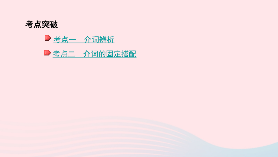 专题五介词,考点一介词辨析,考点突破,考点二介词的固定搭配,考点一介词辨析,考点突破,一、时间介词,1.at 多用于具体的钟点时刻前,如:at seven,at a quarter to one;也可用于固定搭配,中,如:at noon,at night。,2.in 表示一段时间,用于年、月、世纪、四季或泛指的一天的上午、下午、晚,上等前。如:in the twenty-first century 在21世纪,in autumn 在秋天,in the morning,在早上;还可用于表示“从现在起,多长时间以后或多久之后”的短语中。,3.on 主要用在星期几、具体某一天或某一天的早、中、晚或节日前。如:,on June 1st 在6月1日,4.since,from和for,(1)since指从某时一直延续至今,后接时间点,句子用完成时。如:,He has lived here since 1993.从1993年开始他一直住在这里。,(2)from说明开始的时间,谓语可用过去、现在、将来的某种时态。如:,From now on,I will learn English in the mornings.,从今以后,我将在早晨学英语。,(3)for指动作延续贯穿整个过程,后接时间段,句子用完成时。如:,I have studied English for six years.我已经学英语六年了。,5.after,(1)after 表示以过去为起点的某一段时间之后,可用于一般过去时。如:,They finished the work after two years.,他们两年后完成了这项工作。,(2)after与时间点连用表示过去或将来的某个时间之后。如:,I,ll ring you up after two o,clock.,我会在两点后打电话给你。,6.“by+时间点”表示“到,为止”,如果by后跟一个过去的时间点,句子谓,语动词应用过去完成时。如:,We had learned 1,000 English words by the end of last term.,到上个学期末,我们已经学了1,000个英语单词。,7.“during+时间段”与延续性动词连用表示一段时间内的动作。如:,He lives with us during these years.,这些年他跟我们一起住。,8.until用于否定句中,意为“直到,才”,其前的谓语动词需用瞬间性动词;用,在肯定句中,意为“直到,为止”,其前的谓语动词需用延续性动词。如:,I didn,t leave until my mother came home.,直到我妈妈回家我才离开。,I waited for my mother until she came home.,我一直等到妈妈回家。,9.before和after表示时间,分别意为“在,之前”和“在,之后”。如:,Please bring your homework before ten o,clock.,请于十点前把你们的作业带来。,介词,用法,例句,in,表示在某一范围之内的某方位(属于该范围),Guangzhou is in the south of China.广州位于中,国的南部。,on,表示与某地是毗邻关系,Vietnam is on the south of China.越南位于中国,的南部。,to,表示在某一范围之外的某方位(不属于该范围),Japan lies to the east of China.日本位于中国的,东部。,二、方位介词,1.表示方位的in,on,to,2.over,above和on的用法区别,介词,用法,例句,over,指在,的正上方,表示垂直在上,There is a bridge over the river.河上有座桥。,above,泛指在上方,表面不接触,Raise your arms above your head.把你的手臂举,过你的头。,on,指在上面,表示两个物体接触,There is a plate on the table.桌子上有一个盘,子。,介词,用法,例句,at,表示较小的地点,They arrived late at the bus stop.他们晚到了车,站。,in,表示较大的地点,He lives in China.他住在中国。,on,表示在一个平面上,They are working on the farm.他们正在农场干,活。,3.at,in和on的用法区别,4.in front of,in the front of和before,介词,用法,例句,in front of,表示“在,前面”(范围外),There are some trees in front of the classroom.教,室前面有一些树。,in the front of,表示“在,的前部”(范围内),There is a desk in the front of the classroom.在教,室的前面有一张课桌。,before,所表示的位置关系和in front of相同,表示“在,前,在,前面”,He sits before me.他坐在我前面。,介词,用法,例句,below,表示“在下方或位置低于,”,不一定有垂,直在下之意,The coat reaches below the knees.这件外套到了,膝盖下面。,under,表示“在,正下方”,There are many bikes under the trees.树下有许,多自行车。,5.below和under,三、其他介词,1.by,in和on表出行方式,by:不涉及表示交通工具的名词时用by。如:by sea,by air;涉及表示交通工,具的名词,且该名词为单数形式,前面没有冠词或任何修饰语时用by。如:by,ship,by plane。,on或in:当出行方式涉及特定的交通工具时用on或in,交通工具前应有冠词、形,容词性物主代词、指示代词等修饰语。在开放型或半开放型工具前用on,在封,闭型工具前用in。如:on my bike,in a car。,2.in,with和by表示“用”时的区别,in主要表示“用语言、声音、原材料等”;with表示“用具体有形的东西”;by,表示“用,手段或方式”,后常接动名词。如:,Can you sing this song in English?,你能用英语唱这首歌吗?,I write my homework with a pen.,我用钢笔写作业。,The girl made money by selling flowers.,这个女孩通过卖花赚钱。,3.but,besides和except的区别,but表示“除,之外”,常与含否定意义的词连用;except表示“除,之外,(不再有)”,指从整体中排除except所接的人或物,前面常有all,every,any,no等,但,在否定句中,except却没有排斥性;besides表示“除,之外(还有)”,它的意思,是在原来的基础上加上besides除外的人或物,其前常有other,another,any other,a,few等词。如:,We,ve had nothing but trouble with this car.,我们这辆车净出毛病。,All the students went to the zoo except Jim.,除了吉姆,所有的学生都去动物园了。,I have a few good friends besides you.,除了你之外,我还有几个好朋友。,4.with与without的区别,with意为“和,对,附带,带有”,常用搭配有:with the help of.,play with,talk,with。,without意为“没有”,常用搭配有:without saying a word,without breakfast。,5.of sb.与for sb.的区别,of sb.