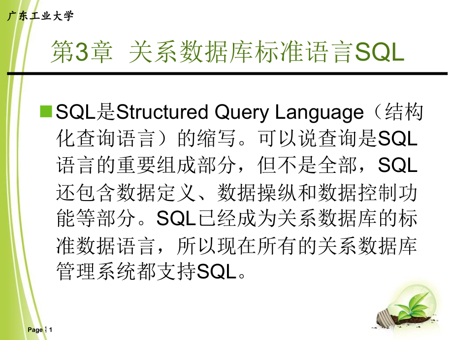Page,*,单击此处编辑母版标题样式,单击此处编辑母版文本样式,第二级,第三级,第四级,第五级,广东工业大学,第,3,章,关系数据库标准语言,SQL,SQL,是,Structured Query Language,(结构化查询语言)的缩写。可以说查询是,SQL,语言的重要组成部分,但不是全部,,SQL,还包含数据定义、数据操纵和数据控制功能等部分。,SQL,已经成为关系数据库的标准数据语言,所以现在所有的关系数据库管理系统都支持,SQL,。,Page,1,学习目标,了解,SQL,的发展过程和主要功能;,熟练掌握,SQL,的,CREATE TABLE,语句和数据完整性约束的定义方法;,熟练掌握,SQL,的数据操作语句,深刻理解数据完整性约束的作用;,熟练掌握,SQL SELECT,语句,能够运用该语句完成关系数据库上的各种查询;,理解关系数据库的视图概念,掌握视图的定义和使用方法。,Page,2,重点难点,SQL,语言本身就是学习数据库的重点,所以要求学生要熟练掌握,具体就是要熟练掌握,SQL CREATE TABLE,语句、,SQL INSERT,语句、,SQL DELETE,语句、,SQL UPDATE,语句和,SQL SELECT,语句。,本章学习的难点是,CREATE TABLE,语句中有关数据完整性约束的定义,以及,SQL SELECT,中复杂的连接和嵌套查询。,Page,3,3.1 SQL,语言,概述,SQL,(,Structured Query Language,)结构化查询语言,是关系数据库的标准语言,SQL,是一个通用的、功能极强的关系数据库语言,Page,4,SQL,的产生与发展,1974,年,,IBM,的,Ray Boyce,和,Don Chamberlin,研制了,SQL,语言,Page,5,SQL,的产生与发展,Don Chamberlin,Page,6,SQL,的产生与发展,1974,年,,IBM,的,Ray Boyce,和,Don Chamberlin,研制了,SQL,语言,1979,年,ORACLE,公司首先提供商用的,SQL,1986,年,10,月,,ANSI,把,SQL,作为关系数据库语言的美国标准,1987,年,,ISO,也通过了,SQL,标准,Page,7,SQL,语言的主要特点,SQL,是一种一体化的语言,SQL,语言是一种高度非过程化的语言,SQL,语言非常简洁,SQL,语言可以直接以命令方式交互使用,也可以嵌入到程序设计语言中以程序方式使用,Page,8,SQL,的特点,综合统一,集数据定义语言(,DDL,),数据操纵语言(,DML,),数据控制语言(,DCL,)功能于一体。,可以独立完成数据库生命周期中的全部活动。,用户数据库投入运行后,可根据需要随时逐步修改模式,不影响数据的运行。,数据操作符统一。,Page,9,SQL,的特点,高度非过程化,SQL,只要提出“做什么”,无须指明“怎么做”。,存取路径的选择以及,SQL,的操作过程由系统自动完成。,Page,10,SQL,的特点,面向集合的操作方式,操作对象、查找结果是元组的集合,插入、删除、更新操作的对象是元组的集合,Page,11,SQL,的特点,以同一种语法结构提供多种使用方式,SQL,是独立的语言,能够独立地用于联机交互的使用方式。,SQL,又是嵌入式语言,能够嵌入到高级语言(例如,C,,,C+,,,Java,)程序中,供程序员设计程序时使用。,Page,12,SQL,的特点,语言简洁,易学易用,SQL,功能极强,完成核心功能只用了,9,个动词。,Page,13,SQL,的基本概念,SQL,支持关系数据库三级模式结构,SQL,视图,2,视图,1,基本表,2,基本表,1,基本表,3,基本表,4,存储文件,2,存储文件,1,外模式,模 式,内模式,Page,14,SQL,的基本概念,基本表,本身独立存在的表,SQL,中一个关系就对应一个基本表,一个,(,或多个,),基本表对应一个存储文件,一个表可以带若干索引,Page,15,SQL,的基本概念,视图,从一个或几个基本表导出的表,数据库中只存放视图的定义而不存放视图对应的数据,视图是一个虚表,用户可以在视图上再定义视图,Page,16,样本数据库,图3-1 样本数据库,Page,17,数据定义,SQL,的数据定义功能,:,模式定义、表定义、视图和索引的定义,Page,18,SQL,中的模式,(Schema),组织数据库对象的一种逻辑结构,把一个数据库中的所有对象按用途划分为若干集合,默认模式是,DBO,Page,19,模式组织举例,产品模式,订购模式,销售模式,Page,20,模式的定义与删除,定义模式,CREATE SCHEMA AUTHORIZATION,如果没有指定,,那么,隐含为,要创建模式,用户必须拥有,DBA,权限或被,DBA,授权,Page,21,模式的定义与删除,定义模式,例,1,定义一个学生,-,课程模式,S-T,CREATE SCHEMA“S-T”AUTHORIZATION WANG;,为用户,WANG,定义了一个模式,S-T,Page,22,模式的定义与删除,定义模式,例,2,CREATE SCHEMA AUTHORIZATION WANG,隐含为用户名,WANG,Page,23,模式的定义与删除,定义模式实际上定义了一个,命名空间,。,在这个空间中可以定义该模式包含的数据库对象,例如基本表、视图、索引等。,Page,24,模式的定义与删除,CREATE SCHEMA AUTHORIZATION,|,在CREATE SCHEMA中可以接受CREATE TABLE,CREATE VIEW和GRANT子句。,Page,25,模式的定义与删除,定义模式,例,3,CREATE SCHEMA TEST AUTHORIZATION ZHANG,CREATE TABLE TAB1(COL1,SMALLINT,,,COL2 INT,,,COL3 CHAR(20),,,COL4 NUMERIC(10,,,3),,,COL5 DECIMAL(5,,,2),;,为用户,ZHANG,创建了一个模式,TEST,,并在其中定义了一个表,TAB1,。,Page,26,模式的定义与删除,删除模式,DROP SCHEMA ,CASCADE,和,RESTRICT,两者必选其一。,CASCADE(级联)删除模式的同时把该模式中所有的数据库对象全部删除,RESTRICT(限制)如果该模式中定义了下属的数据库对象(如表、视图等),则拒绝该删除语句的执行。当该模式中没有任何下属的对象时才能执行。,Page,27,模式的定义与删除,删除模式,例,4,DROP SCHEMA ZHANG CASCADE,;,删除模式,ZHANG,,同时该模式中定义的表,TAB1,也被删除,Page,28,表的定义,一个表由若干列构成,自,SQL Server 2005,不仅可以定义实列,(,简称列,,column_definition),而且还可以定义虚列,(,即计算列,,computed_column_definition),理解:,CREATE TABLE schema_name.table_name,(|,.n ),Page,29,表的定义,定义基本表,CREATE TA