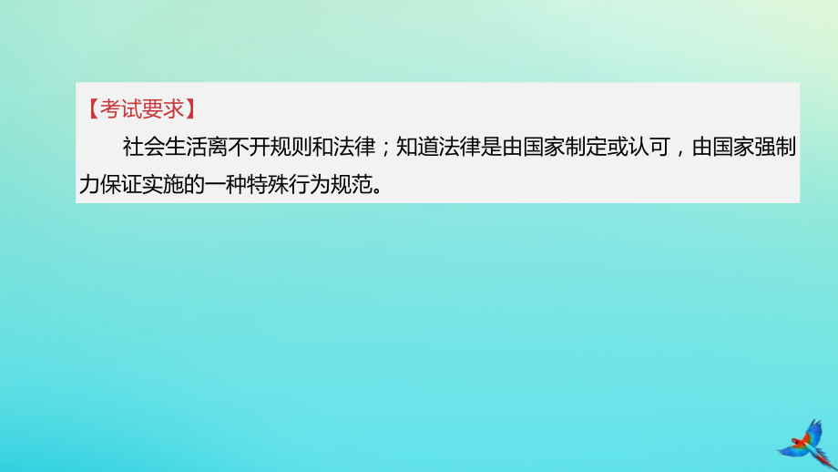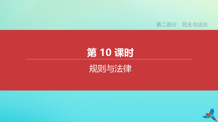 单击此处编辑母版标题样式,编辑母版文本样式,第二级,第三级,第四级,第五级,2020/5/30,#,第,10,课时,规则与法律,第二部分,民主与法治,【,考试要求,】,社会生活离不开规则和法律;知道法律是由国家制定或认可,由国家强制力保证实施的一种特殊行为规范。,核心考点梳理,中考考向探究,知识思维导图,考点一,规则,1.,什么是社会规则,?,社会规则的种类有哪些,?,(,1,)含义:是人们为了维护有秩序的社会环境,在逐渐达成默契与共识的基础上形成的。,(,2,)种类:调节我们行为的规则有很多,如道德、纪律、法律等。,知识思维导图,核心考点梳理,中考考向探究,2.,为什么说维护秩序要靠规则,?,(,1,)社会规则明确社会秩序的内容,从而使大家各司其职,各安其位,各尽其责,各得其所。,(,2,)社会规则保障社会秩序的实现,从而保障社会的良性运行。,知识思维导图,核心考点梳理,中考考向探究,【,特别提醒,】,自律就是严于律己,不断自我反省,克服已经发现的不良行为,做到自觉遵守规则。,3.,怎样自觉遵守规则,?,(,1,)遵守社会规则需要他律和自律。遵守社会规则,既需要监督、提醒、奖惩等外在约束,即他律,又需要自我约束,即自律。,(,2,)遵守社会规则,需要我们发自内心地敬畏规则,将规则作为自己行动的准绳。,知识思维导图,核心考点梳理,中考考向探究,4.,如何维护与改进规则,?,(,1,)我们要坚定维护规则。一方面要从自己做起,自觉遵守规则;另一方面要在保证自身安全的前提下,提醒、监督、帮助他人遵守规则。,(,2,)我们要积极改进规则。我们要积极参与规则的改进和完善,善于与他人沟通交流、寻求共识,积极为新规则的形成建言献策,使之更加符合人民的利益和社会发展的要求。,考点二法律,1.,法律的含义是什么,?,法律是由国家制定或认可的,由国家强制力保证实施的一种特殊行为规范。,知识思维导图,核心考点梳理,中考考向探究,2.,法律的本质是什么,?,(,1,)法律是统治阶级意志的体现。,(,2,)法律是用来统治国家、管理社会的工具。,(,3,)法律是调整社会关系、判断是非曲直、处理矛盾和纠纷的标尺。,知识思维导图,核心考点梳理,中考考向探究,3.,法律的基本特征是什么,?,(,1,)法律是由国家制定或认可的。经过一定的法律程序制定和认可,是国家创制法律的两种基本形式。,(,2,)法律是由国家强制力保证实施的。法律的实施以强大的国家力量做后盾。,(,3,)法律对全体社会成员具有普遍约束力。,知识思维导图,核心考点梳理,中考考向探究,4.,怎样理解我国公民在法律面前一律平等,?,(,1,)在法治社会里,公民在法律面前一律平等,任何人都没有超越法律的特权。,(,2,)每个公民都平等地受到法律的保护,平等地享有权利和履行义务。,(,3,)任何人不论职务高低、功劳大小,只要触犯国家法律,都必须承担相应的法律责任。,知识思维导图,核心考点梳理,中考考向探究,5.,法律有何作用,?,(,1,)规范作用:,法律规定我们应该享有的权利,应该履行的义务;,法律让我们懂得在社会生活中可以做什么,应该做什么、不应该做什么,应该怎样做、不应该怎样做;,法律为我们评判、预测自己和他人的行为提供了准绳,指引、教育人向善。,(,2,)保护作用:法律通过解决纠纷和制裁违法犯罪,惩恶扬善、伸张正义,维护我们的合法权益。,探究一,规则,例,1,2019,大庆,元史,许衡传,中记载:夏日外出时,众人争相摘取路边的梨解渴,唯独许衡不为所动。有人劝他:“乱世之时,这梨是没有主人的。”许衡正色道:“梨无主人,难道我心中也无主吗,?,”这个故事告诉我们,(),A.,遵守社会规则需要监督、奖惩等外在约束,B.,遵守规则需要我们自律,将规则作为自己行动的准绳,C.,要积极改进和完善规则,D.,不遵守规则一定会受到法律的制裁,知识思维导图,核心考点梳理,中考考向探究,【,思路点拨,】,分析材料,众人摘梨,许衡不为所动,因为心中有主。这是许衡具有很强的原则性,没有外在约束也能自觉自律遵守规则,不取不属于自己的东西,,B,符合题意;,A,、,C,表述正确,但没有从材料上体现出来,不符合题意;,D,错误,不守规则要受到规则的惩罚,规则不仅指法律。故选,B,。,【,参考答案,】,B,知识思维导图,核心考点梳理,中考考向探究,【,变式,】,2019,年,3,月,1,日起,,济南市文明行为促进条例,(以下简称,条例,)正式施行。,条例,为文明行为立规矩、树导向、定红线,给不文明者设立了一道规则边界。今后,我们有了向不文明行为说“不”的法律武器。对此认识正确的是,(),社会中处处有规则,社会秩序离不开规则,法律规范人们的行为,保障着社会生活,让规则意识深入人心,提升城市文明形象,法治标定了自由的界限,限制了人们的自由,A.B.,C.D.,知识思维导图,核心考点梳理,中考考向探究,A,【,解析,】,法治标定了自由的界限,但是没有限制人们的自由。故选,A,。,探究二,法律,例,2,2019,湖州,在“扫黑除恶”专项斗争中,各地依法摧毁了一批涉黑犯罪组织和恶势力犯罪集团,“黑恶势力”人人喊打的舆论氛围加速形成,和谐法治的社会风气更加清朗。这体现了我国法律,(),是维护社会正义的有力保障,是由国家制定或认可的行为规范,依靠社会舆论力量保障实施,为我们创造安全有序的社会环境,A.B.,C.D.,知识思维导图,核心考点梳理,中考考向探究,【,思路点拨,】,依法摧毁了一批涉黑犯罪组织和恶势力犯罪集团,形成“黑恶势力”人人喊打的舆