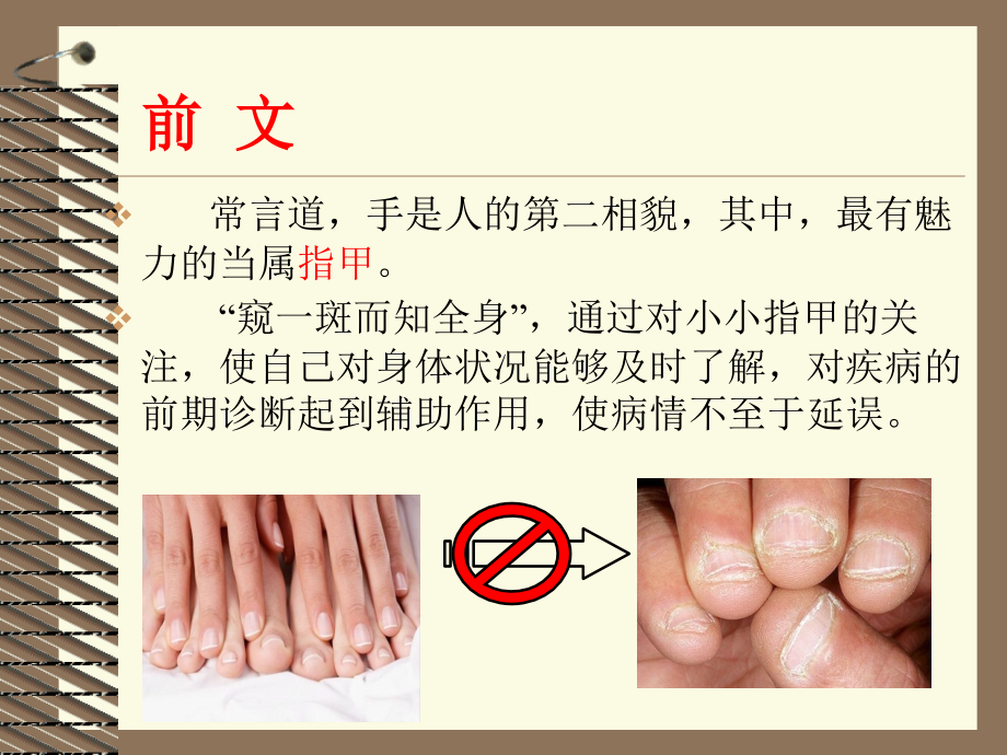 单击此处编辑母版标题样式,单击此处编辑母版文本样式,第二级,第三级,第四级,第五级,单击此处编辑母版标题样式,单击此处编辑母版文本样式,第二级,第三级,第四级,第五级,*,单击此处编辑母版标题样式,单击此处编辑母版文本样式,第二级,第三级,第四级,第五级,*,指甲上的秘密,清水河中学 何 弢,前 文,常言道,手是人的第二相貌,其中,最有魅力的当属,指甲,。,“窥一斑而知全身”,通过对小小指甲的关注,使自己对身体状况能够及时了解,对疾病的前期诊断起到辅助作用,使病情不至于延误。,指甲的形态,健康的指甲应该是,平滑、红润、有光泽,厚薄适中的,,并且对称、不偏斜、坚韧不脆,甲面没有纵横沟纹,指甲根部的,甲半月呈灰白色,,指甲形状呈正常的,弧形,弯曲,4,二 指甲的构造与正常指甲,1甲色均匀、淡粉红色,无颜其他,色或斑点、带(纹)的出现。,2甲泽光滑,厚薄适当,3甲缘整齐,无缺损变化,4皮带有光泽,大小一致。,无分层表现,和甲紧密粘连。,5甲周软组织皮肤完整而柔软,,无角化、撕裂、倒刺等现象。,指甲体,半月痕,甲上皮,甲壁,皮带,一般常识,指甲含有,10%,的水份。手指甲,1,个星期平均生长,0.7,1.2,毫米,大约是脚趾甲生长速度的,4,倍。手指越长,指甲生长的速度越快。,较高的温度有利于加速指甲生长。这样,夏天指甲的生长更快一些,生活在南方的人比生活在北方的人的指甲生长更快一些。,同时,对于那些习惯用右手的人来说,其右手指甲生长快于左手,而对左撇子来说,则情况正好相反。,指甲与疾病的联系,很多疾病的早期、中期和晚期都能引起指甲的变化,特别是一些,营养障碍、微循环或微量元素代谢失调,的疾病患者,指甲上常表现出一些肉眼能看到的改变。,2、半月痕过小,有,胃肠道疾病,,应提防十二指肠溃疡。,3.半月痕的颜色,奶白,表示正常,这类人精力强壮,体质好,,身 心健康。,灰色,表示精弱,影响脾胃消化吸收功能的,运行,容易引起贫血,疲倦乏力。,粉红,与甲体颜色分不清,表示脏腑功能下降,,体力消耗过大,易引起糖尿病、甲亢等病。,紫色,易引起心脑血管血液循环不良,供血供氧,不足,头晕、头痛、脑动脉硬化。,黑色,多见于严重的心脏病、肿瘤或长期服药引,起药物和重金属中毒。,4,.蓝新月,指甲根部的新月形白痕若有一层,蓝晕,,可能有下列病症:血液循环受阻、心脏病、手指和脚趾的血管痉挛,通常是由于曾受冷冻所致。但有时也与类风湿性关节炎或红斑狼疮有关。,二,、指甲容易断裂剥落,若排除霉菌感染和腐蚀,则要小心,甲亢、糖尿病、缺铁,等。,1.瘀黑斑点脑血管意外,指甲上出现瘀黑斑点时,正是表示脑部血液循环发生障碍的前兆,一般右手指甲出现斑点,表示左脑有问题,左手指甲有斑点表示右脑有问题。,三、指甲斑点及颜色,指甲容易产生斑点的人,务必预防脑部疾病的发生!,14,1)指甲瘀黑斑点,1提示,有瘀血,。(伴有手指外伤史),2提示,颅内血液循环障碍发生障碍的前兆,。,轻则易出现头晕、头痛、脑动脉硬化;,重则易出现脑血管意外(中风),(左手右脑,右手左脑),2.指甲的白点消化不良,1)成人多见于肝功能代谢或受损的问题,特别是乙肝慢,性病人,长期体力透支,性功能低下,阳痿、早泄、,性冷淡者常见这种点状白点。,2)小孩多见于胃肠积滞,消化不良或虫积或缺钙。,3)习惯性便秘长期造成肠胃功能紊乱也会出现点状白点。,指甲如果,颜色偏紫,,则可能是血液循环不好,青少年要注意风湿性心脏病,老年人则要小心肺气肿、肺心病等。,指甲,变黑或出现不规则的黑点,,有的还伴有纹状凹陷,极有可能是,慢性肾病或肿瘤,的信号,。,3、指甲颜色偏紫或变黑,4.、指甲发白,指甲,发白,的人多见于肝病、贫血、慢性肾炎,如果是雾状小白点,儿童可能是寄生虫,成人则可能是内分泌系统疾病或缺钙。,四、指甲板纵纹,指甲纵纹,神精衰弱。指甲板上有数条明显纵纹形成脊形,称之为纵嵴。,19,1、指甲纵纹神经衰弱、机体衰老,消耗性疾病,,体力透支(如身心疲劳综合征),免疫功能差,,容易感冒,多感冒。,细小直纹提示,神经衰弱,,长期失眠、多梦、易醒、难入睡等。,(,如果直纹越粗,症状越明显,),小病直纹细小,大病直纹粗大,2、特别明显的纵纹往往是病理性纵纹。说明身体有过大疾病,21,3、甲床出现黑色纵纹,提示肝肾机能衰弱、毒素积聚的征兆。,肝肾为机体解毒排毒器官。常因为食物、空气、环境等污染造成。故平时表现全身病痛多。,提示严重肠胃病。,常因为食物不洁或者中毒引起。,凡黑便是毒,治疗:清肠排毒法,直纹黑、粗、深陷甲床,22,直纹 总结,细小而多,长期神经衰弱,直纹粗大,曾有过大病,直纹黑粗,提示中毒,23,五、指甲板 横纹,指甲上出现横纹是,胃肠有疾,消化功能障碍,的象征。,24,1、细小横纹,提示长期慢性消化系统疾病,(如慢性胃肠炎、慢性结肠炎、慢性胃病等)。表现为饮食稍有不慎,就会出现腹痛、便溏等。,横纹细小而多,25,2、深粗横纹,提示曾经有过一次严重的胃肠疾病。,横纹深粗而凹陷,横纹凹陷越深越严重,26,3,、胃肠疾病发生时间判断,指甲板换一次所需时间为6月。,如果横纹在中间,则胃肠疾病发生时间为3月前。,依此类推,4、横纹的位置与纹深与疾病的关系,横纹的位置根据指甲的生长速度有,半年一换,的特点,如果长到指甲的一半有横纹,则说明三个月前左右曾经有过一次肠胃炎。,如果横纹越深胃肠疾病越严
