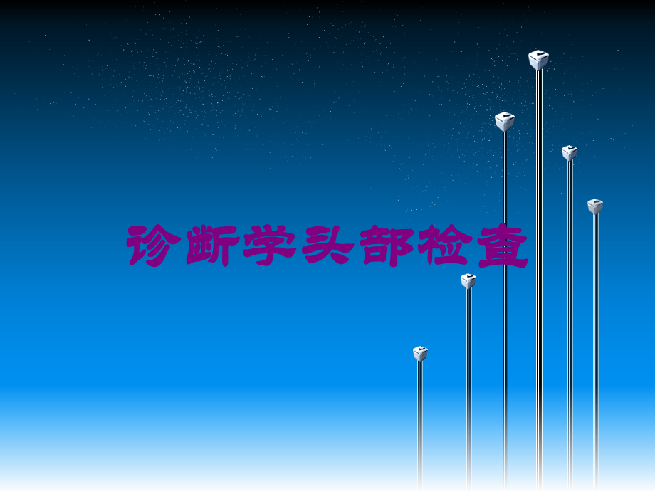 Click to edit Master text styles,Second level,Third level,Fourth level,Fifth level,*,诊断学头部检查,*,诊断学头部检查,学习要求:,掌握头颅大小的测量方法,掌握眼睑结合膜的检查方法及瞳孔的检查方法,掌握常见瞳孔异常及各种调节反射的临床意义,掌握扁桃体肿大的分度,掌握头颈部淋巴结触诊方法,掌握甲状腺触诊方法,了解鼻窦的检查方法及其临床意义,了解常见头颅畸形的临床意义,了解口腔黏膜病变及牙齿检查的记录方法,2,诊断学头部检查,第一节 头颅,视诊:,头颅大小,外形变化,有无异常活动,3,诊断学头部检查,第一节 头颅,头颅大小,头围的测量,:,自眉间最突出处经枕骨粗隆绕头一周的长度,新生儿:34,cm,前6个月:+8,后6个月:+3,1-2岁:+2,3-4岁:+1.5,4-10岁:1.5,至18岁:达53,cm,4,诊断学头部检查,颅骨解剖,5,诊断学头部检查,第一节 头颅,头颅的外形,与前、后,囟,门闭合早晚有关,小颅,:,前囟过早闭合,(正常小儿,12-18,个月闭合)可引起小头畸形,同时伴有智力发育障碍(痴呆症)。,6,诊断学头部检查,第一节 头颅,尖颅,:,因,冠状缝和人字缝过早闭合,,头顶呈尖形或锥形的一种现象,患者头顶尖,颅底低,眼眶浅,鼻尖发育落后,。,尖颅畸形多见于:,Apert,综合征,+,并指畸形,7,诊断学头部检查,第一节 头颅,巨颅,:,额、顶、颞及枕部突出膨大呈圆形,头颅明显增大,颜面相对很小,眼球突出常向下转,显露上部巩膜,形成双目下视,呈落日现象,见于,脑积水,。,脑积水的病因,:颅内炎症、脑血管畸形、脑外伤、各种内源性或外源性神经毒素、缺氧、水和电解质紊乱、酸中毒、肝肾功能衰竭等。,8,诊断学头部检查,第一节 头颅,方颅,:,额、顶明显向外隆起,头颅平坦,顶面观头颅似方形。多由囟门闭合延迟引起。,见于,佝偻病,,,先天性梅毒,,先天性成骨不全,石骨症等,9,诊断学头部检查,第一节 头颅,短头畸形,:,冠状缝早闭导致头颅前后径短而横径加宽,前额突出,见于先天性头颅畸形。,长颅,:,颅顶至下颏的长度明显增大,多见于肢端肥大症,,Marfan,综合征等。,变形颅:,头颅骨的增大变形,见于成年人的变形性骨炎。,10,诊断学头部检查,第一节 头颅,头颅的异常活动,帕金森病(麻痹性震颤,PD):,头部不随意而比较有规律的颤动。,点头征(,Musset,):,也叫收缩期点头征,多见于严重的主动脉关闭不全,左心室射血量增加,收缩压上升,舒张时血流反流致舒张压下降,脉压差增大,出现颈动脉和心脏搏动一致的点头运动。,颈椎病:,患者常见头部运动的受限。,11,诊断学头部检查,第一节 头颅,触诊:,用双手仔细触摸头颅的每一个部位,了解其外形,有无,压痛,和,异常隆起,。,12,诊断学头部检查,第二节 头部器官,眼,眼的功能检查,外眼检查,眼前节检查,眼底检查,13,诊断学头部检查,1、眼(eye),巩膜及球结膜,角膜,虹膜,瞳孔,穹窿结膜,睑结膜,第二节 头部器官,14,诊断学头部检查,第二节 头部器官,眼的功能检查,视力(,visual acuity),分为中心视力和周边视力,中心视力:,指检查眼底黄斑中心凹的功能,眼睛辨别两点间最小距离的能力,包括远视力和近视力。,远视力表,,5,m,处能看清1.0正常视力;,近视力表,,33,cm,处能看清1.0正常视力。,两表合用可初步判断有无屈光不正(近视、远视、散光和老光)及眼底病变。,周边视力:,指黄斑中心凹以外的视网膜的功能,即余光。正常人两侧达90,上方为60,下方为75。近视、夜盲等患者的周围视力比较差。,15,诊断学头部检查,第二节 头部器官,视野,(,visual field,),指眼球向正前方固视不动时所见的空间范围,色觉(,color sensation),:色弱 色盲,色盲,:对某种颜色缺乏或完全没有辨色力。,红,绿,盲最常见,男性高于女性;先天性为遗传因素,后天为视网膜病变、视神经病变等。,色弱,:辨色力不足,在自然光线下,距色觉检查表,50cm,处,,5,秒内说检查表的内容为正常,否则为色弱。,16,诊断学头部检查,第二节 头部器官,外眼检查,眼睑,泪器,结膜,眼球,17,诊断学头部检查,第二节 头部器官,眼睑,检查内容:,观察眼睑有无红肿、浮肿、瘀血、硬结、瘢痕,睑缘有无内、外翻,睫毛生长方向如何,根部有无脓痂、溃疡,双侧睑裂是否对称,闭合功能是否正常等。,18,诊断学头部检查,第二节 头部器官,常见病变:,眼睑水肿,(,blepharoedema,),:,眼睑皮下组织发生水肿,常见于 肾炎、肝炎、贫血、血管神经性水肿,19,诊断学头部检查,第二节 头部器官,睑内翻(,entropion),:,指睑缘向内卷、睫毛倒向眼球者。,老年人眼睑皮肤、肌肉等松弛无力也可致。,多见于,先天性睑内翻、重症沙眼、结膜烧伤、结膜炎、角膜炎等。,20,诊断学头部检查,第二节 头部器官,睑外翻,(ectropion),:,指睑缘外翻离开眼球,睑结膜外露者。,分为瘢痕性、老年性、痉挛性和麻痹性。结膜充血、肥厚干燥、多有泪溢。,由于睑裂闭合不全,常引起,暴露性角膜炎,。,21,诊断学头部检查,第二节 头部器官,眼睑下垂:,分为单侧眼睑下垂和双侧眼睑下垂,单侧眼睑下垂:多为,动眼神经麻痹,所致,原发病常为脑血管病变、外伤、白喉等所致的动眼神经麻痹。,Horner,综合征,亦为单侧眼睑下垂。,双侧眼睑下垂:多见于,先天性眼睑下垂,和,重症肌无力,患者,应用新斯的明药物前上睑明显下垂。用药后症状改善。,22,诊断学头部检查,第二节 头部器官,眼闭合功能障碍,:,见于,面神经麻痹,、,严重睑外伤、甲状腺功能亢进、昏迷,的病人。,面神经麻痹致左眼睑闭合障碍,23,诊断学头部检查,第二节 头部器官,泪器,