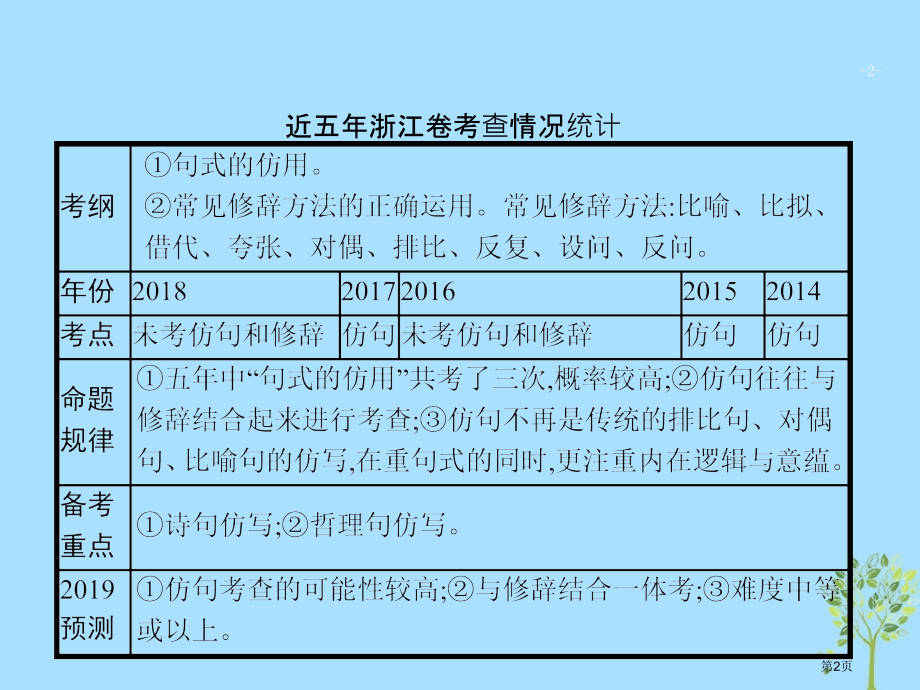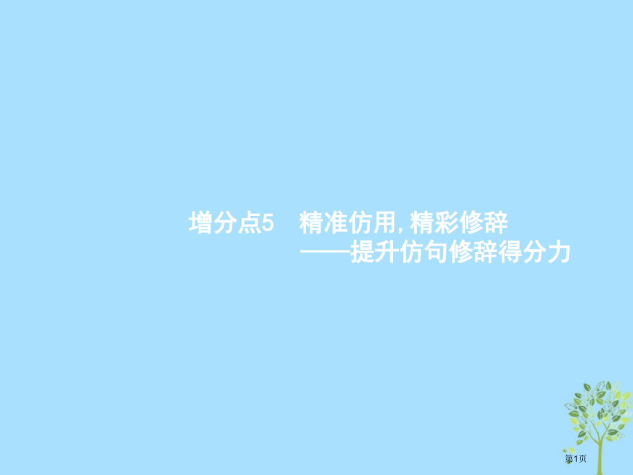 单击此处编辑母版标题样式,单击此处编辑母版文本样式,第二级,第三级,第四级,第五级,*,*,*,增分点,5,精准仿用,精彩修辞,提升仿句修辞得分力,第1页,-,2,-,近五年浙江卷考查情况统计,第2页,-,3,-,1,.(,全国,卷,),仿照下面示例,利用所给材料续写三句话,要求内容贴切,句式与所给示例相同。,诸子争鸣、造纸印刷、筑长城开运河,中国人民含有伟大创造精神。,材料,:,奋斗,团结,梦想,建强国谋复兴,御外侮卫家国,脱贫困奔小康,垦田拓海,开天辟地,守望相助,抗灾治水,逐日奔月,同舟共济,第3页,-,4,-,答案示例,垦田拓海、抗灾治水、脱贫困奔小康,中国人民含有伟大奋斗精神。,同舟共济、守望相助、御外侮卫家国,中国人民含有伟大团结精神。,开天辟地、逐日奔月、建强国谋复兴,中国人民含有伟大梦想精神。,解析,本题考查仿用句式、扩展语句能力。答题关键是先把后两行词语按照,“,奋斗,”“,团结,”“,梦想,”,分组,分组正确了,解答就轻易了。每组前两个四字词语语序能够交换。,第4页,-,5,-,2,.(,浙江卷,),归谬法是指为反对错误观点,先假设这个观点是正确,由此推论得出荒谬结论论证方法。仿照下面示例,另写一句话。要求:符合归谬逻辑,句式基本一致,语言简练明了。,例句:,假如作品水平越高,知音越少,那么谁也不懂东西就是世界上绝作了。,答案示例,假如语言是生产工具,能够生产出物质资料,那么夸夸其谈人就能够是百万富翁了。,解析,本题考查语言表示简明、准确、鲜明能力。作答本题,首先要明确题干要求,:,内容上,“,符合归谬逻辑,”,归谬法是间接反驳方法之一,为了反驳某论题,(,或某论据,),先假定它为真,然后由它推出荒谬结论,;,句式与例句,“,基本一致,”,即为,“,假如那么,”,形式,;,“,语言简练明了,”,字数不能太多。最终,对照例句选择对象进行仿写。,第5页,-,6,-,第6页,-,7,-,1,.(,浙江卷,),古人有名有字。名与字意义上往往有联络,或同义,或反义,或相关,如岳飞字鹏举,意思是鲲鹏高飞。给下面人名取字,并说明字与名意义关联。(各不超出25字),(1),陈璋,字,。说明:,(2),孙冠群,字,。说明:,答案示例,(1),玉成“璋”,玉器名,字“玉成”,表示玉汝于成。,(2),谦之“冠群”意为出类拔萃,字“谦之”,以谦虚戒之。,解析,本题考查古代文化常识。题干中已经有说明,名与字意义上往往有联络,或同义,或反义,或相关。作答此题时,需要了解名意思,“,璋,”,是古代一个玉器,形状像半个圭。,“,王,”,字旁字普通都与,“,玉,”,相关,所以在回答时候要按照这个思绪来。,“,冠群,”,顾名思义,是出类拔萃,或同义,或反义,或相关,比如,“,谦之,”,就是要到达出类拔萃一个相关路径。意思对即可。,第7页,-,8,-,2,.(,浙江卷,),依据下面示例仿写,要求句式、结构与示例相同,不得选择“月”“湖”“鱼”作为描述对象。,示例,弯月落在湖水中,;,鱼儿游去了,碎得月影半池,听见了嫦娥幽怨歌声么,?,第8页,-,9,-,答案示例,残花缀在繁枝上;,鸟儿飞去了,撒得落红满地,听见了花儿落地叹息么?,解析,本题主要考查仿写语句能力。答题时应明确题目要求,“,句式、结构与示例相同,”,且要符合情理。首先,从内容上看,要分析示例中事物,理清它们之间关系,“,月,”,落在,“,湖,”,中,“,鱼,”,也在,“,湖,”,中,有动有静,第三句紧承前两句造成一个意境,第四句有着丰富想像力和意趣。其次,从结构、手法上看,第四句是联想想象,虚实结合,同时还是一个问句形式。再次,选择一组相关意象,按例句句式结构仿写即可。,第9页,-,10,-,突破攻略,典题突破,提升攻略,即时提升,仿写句式组合能力非常强,它能够在句式上要求与例句保持统一前提下,又要求使用一定修辞方法,如比喻、排比、拟人、对偶等,修辞方面要求可隐可显。,仿写句式又可与语言得体横向联合,除要求仿写内容、句式上保持一致外,又要求语言合乎情景、身份、场所、文体等需要。,常见修辞方法考查普通不单独命题,而是与其它考点融合来进行综合检测,这么就往往给考生造成一个假象:高考命题不重视对修辞考查。其实,这种特殊命题方式充分表达了高考命题重能力、重利用、重主观、重综合大趋势。,第10页,-,11,-,突破攻略,典题突破,提升攻略,即时提升,仿用句式基本类型有:,1,.,续写式。续写式特点是在所供材料末尾留出一个空位,要求考生依据例句内容和句式,续写一个或多个句子,使之与上文组成一段语意完整文字。,2,.,嵌入式。在所提供材料中间空出一句或几句,要求仿照上句或下句句式再造句子嵌入空缺处,且要与上下文衔接。,3,.,命题式。这种题型是提供一个语言材料,再另外命题确定新内容,仿照例句句式造句。,第11页,-,12,-,突破攻略,典题突破,提升攻略,即时提升,4,.,开放式。开放式仿写是近年来仿写重点形式。方式有两种:一是提供一个句子作为例句,不限定仿写内容;二是不提供语言材料,只有内容或形式要求。,5,.,对联式。对联知识即使在中学阶段没有系统讲解,不过对联艺术毕竟是中华民族文化瑰宝,今天我们应读继承和发扬这一艺术传统。更主要是,对联题直接指向是对考生语文素养考查。伴随考查深入,对联题型定会重出江湖。,第12页,-,13,-,突破攻略,典题突破,提升攻略,即时提升,仿用句式突破策略:,(1),必须句式一致。试题往往给出范例句式,或要求与某一画线句句式相同。这么,新造语句是否合乎要求、