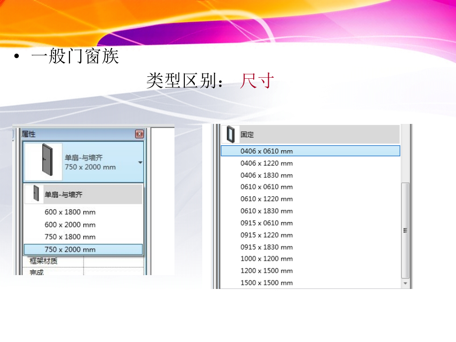 单击此处编辑母版标题样式,单击此处编辑母版文本样式,第二级,第三级,第四级,第五级,*,*,*,万能门窗族,(多类型门窗族),定义:一个族里面包含多种族类型,“多种类型”不仅是尺寸上的,多种,还包括材质装饰,构件可见性等多种参数上的不同。,一般门窗族,类型区别:,尺寸,实例,万能门窗族(多类型门窗族),万能门窗族(多类型门窗族),万能门窗族(多类型门窗族),关键词:参数设置 尺寸标注,材质装饰,可见性设置,多类型门窗族的创建,第一种:建好一个族类型,然后新建下一个,中间发现需要编辑可见性的时候再进行编辑,知道全部建完,建“子族”分“可见”完成“子族”,第二种:把所有类型族的内容都创建出来,然后按类型分类新建。,建“大族”分“可见”分“子族”,建“子族”分“可见”完成“子族”,1 对第一个“子族”进行创建建“子族”,2 新建下一个“子族”,改参数,并对新建“子族”的可见性进行创建和编辑分“可见”,3 重复新建“子族”,完成所有“子族”新建,确认所有非共同部分的可见性设置完成“子族”,实际操作,多类型窗族,包含:百叶窗,玻璃窗,平开窗,1 创建单一的窗族:百叶窗1000*1000,2 新建类型:百叶窗1000*2000(修改尺寸标注),3 新建类型:红色玻璃窗(添加红色玻璃),第一步 为百叶设置可见性参数,编辑组选择百叶添加可见性参数“百叶”完成编辑组,第二步 为玻璃设置可见性参数,选择玻璃添加可见性参数“玻璃”完成,第三步 将百叶窗中的类型属性中“玻璃”可见性去掉,将玻璃窗中类型属性中的“百叶”可见性去掉,第四步 建玻璃材质选择为红色的玻璃,红色玻璃窗,4 新建类型:绿色玻璃窗(修改玻璃材质),第一步 新建类型 绿色玻璃窗,第二步 更改玻璃材质为绿玻璃,5 新建类型:平开窗(添加把手,开启方向线),第一步 新建平开窗,第二步 添加把手构建,并设置可见性参数,第三步 添加开启方向线,设置可见性参数,第四步 对各类型把手和开启方向的可见性进行编辑,6 最后检查各类型的可见性,确保没有错误后,,将各类型的窗户添加到墙上进行对比,建“大族”分“可见”分“子族”,1 把所有族内所有类型所包含的部分全部创建,不管是不是共同部分,形成一个包含所有类型的大集合建“大族”,2 把所有不是共同部分的进行可见性编辑,如把手,百页,玻璃等。(一般在创建各非共同部分的时候进行可见性编辑,但最后还是整体检查所有非共同部分的可见性比较保险)分“可见”,3 新建各族类型,对各类型的尺寸标注,材质装饰,可见性的选择进行编辑,完成最后的创建分“子族”,建“大族”,分“可见”,分“子族”并对各类型的可见性参数编辑,两种方法比较,建“子族”分“可见”完成“子族”,走一步算一步的做法,比较不会遗漏,但是容易出错,适合新手。,建“大族”分“可见”分“子族”,需要预先整理出需要设置可见性部分,并且把所有族类型都放进一个族里面,比较容易乱,适合熟练的人群。,其他问题,1 如何判断多个类型的门窗族可以合成一个多类型门窗族,2 对族命名的统一,3 材质、尺寸的统一标准,