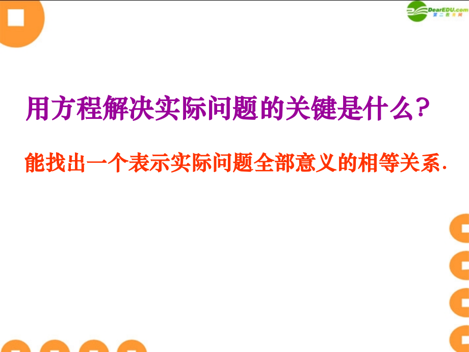 建湖县实验初中,用方程解决问题,(6),能找出一个表示实际问题全部意义的相等关系,.,用方程解决实际问题的关键是什么,?,问题,6,一件夹克衫先按成本提高,50%,标价,再以,8,折出售,结果获利,28,元,这件夹克衫的成本是多少元,?,分析,:,本题的相等关系是什么,?,利润,=_,-,_,售价,成本,试改变题问题,6,中的部分条件,编一个问题,再请列出一元一次方程,练一练,一件商品按成本价提高,20%,标价,然后打,9,折出售,售价为,270,元,这种商品的成本价是多少,?,2.,某种家具的标价为,132,元,如果按,9,折出售,仍可获利,10%(,相对于进价,).,求这种家具的进价,.,3.,一家商店将某种服装按成本价提高,40%,后标价,又以,8,折,(,即标价的,80%),优惠卖出,结果每件仍获利,15,元,这,种服装每件的成本是多少元,?,4.,某个体商贩在一次买卖中同时卖出两件上衣,每件都以,135,元出售,按成本计算,其中一件盈利,25%,另一件亏本,25%,试问,:,(1),在这次买卖中,该商贩是赚还是赔,还是不赚不赔,?,(2),把题中的,135,元改为任何正数,a,情况如何,?,.,一年期定期储蓄年利率为,2.25%,所得,到利息要交纳,20%,的利息税,.,已知某储,户有一笔一年期定期储蓄到期纳税后得到利息,450,元,问该储户存入多少本金,?,某自来水公司按如下规定收取水 费,:,如果每月用水不超过,10t,按每 吨,1.5,元收费,;,如果每月用水超过,10t,超过部分按每吨,2,元收费,小明家,9,月份的水费是,22.8,元,小明家,9,月份用水多少,?,这节课的收获是,作业,110,页,:14,、,15,、,16,、,17,