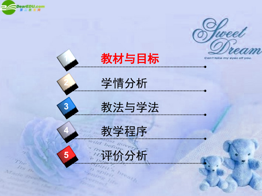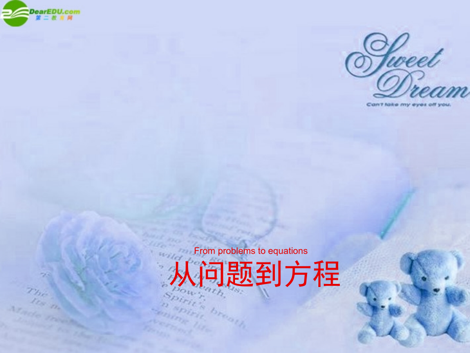 单击此处编辑母版标题样式,单击此处编辑母版文本样式,第二级,第三级,第四级,第五级,*,From problems to equations,从问题到方程,4,教材与目标,1,2,3,5,学情分析,教法与学法,教学程序,评价分析,教材分析,数,不等式,函数,一元一次方程,方程,一元二次方程,字母表示数,分式方程,方程组,教学目标,情感态度与价值观,过程与方法,知识与技能,探索实际问题中的数量间的相等关系,并用方程描述;,通过对多种实际问题中的数量关系的分析,使学生初步感受方程是刻画现实世界的有效模型;,通过教学初步培养学生观察、思考、分析问题的能力,.,经历以“探究”的形式讨论如何用方程描述实际问题,体验方程与实际的密切联系,结合问题中基本数量关系和相等关系,,培养学生转化的数学思想,,,渗透数学建模思想,在设计活动中,培养合作交流和增强用数学的意识,体验成功的喜悦,激发学习数学的热情,增强自信心,教学重难点,从问题 方程,教学难点,探索实际问题中的数量关系,教学重点,探索实际问题中的数量关系,并用方程描述,到,4,教材与目标,1,2,3,5,学情分析,教法与学法,教学程序,评价分析,学生的年龄特点与认知特点,学生所具备的基本知识与技能,初中阶段是智力和心理发展的关键阶段,学生,的逻辑思维从经验型逐步向理论型发展初中生具,备活泼好动、好奇、好表现这一特点,在小学阶段,已学习了用算术方法解决应用题,,还学习了简易方程,学生已经对方程有了初步的认,识,积累了一些用方程表示简单情境中的数量关系,的经验,4,教材与目标,1,2,3,5,学情分析,教法与学法,教学程序,评价分析,教学策略,教学策略,在活动中教师着眼于,“,引,”,,尽力激发学生求知的欲望,引导他们解决问题,并掌握从问题到方程的规律和方法,学习策略,学生着眼于,“,探,”,,通过不断的探索尝试发现相等关系,解决问题,发展探索能力和创造能力,.,4,教材与目标,1,2,3,5,学情与学法,构思与教法,教学程序,评价分析,教学程序与设想,1,2,3,5,4,知识技能,学生发展,情境创设,建构活动,数学化认识,教学过程设置,2,合作质疑,探索新知,1,创设情境,引入新课,3,自主归纳,形成方法,4,反思设计,分组活动,5,发展能力,拓展延伸,6,课堂小结,感悟收获,现有一袋散装食盐、一架天平和一盒标准砝码,(内有,5,克,,10,克,,50,克,,100,克砝码各一个,,20,克砝码,2,个),你如何称出这袋食盐的质量?,在上述问题中,如果缺少了一个,10,克的砝码,,那么你又如何称出这袋食盐的质量?,1,创设情境,引入新课,练习巩固,父子年龄,相等关系,排球问题,直接设未知量,教师年龄问题,天平引发兴趣,间接设未知量,不同形式,不同情境,相同形式,2,合作质疑,探索新知,猜年龄游戏,问题,1,王老师的童年是现在年龄的 ,之后继续读书的时间是现在年龄的 ,王老师又在讲台上工作了,8,年,你们知道王老师多大吗,?,2,合作质疑,探索新知,教师年龄问题,解:设王老师现在,x,岁,问题,2,军军今年,5,岁,爸爸今年,32,岁,如果,x,年以后军军的年龄是爸爸年龄的?你能用方程描述这个问题中的数量关系吗?,2,合作质疑,探索新知,问题,3,某排球队参加排球联赛,胜一场得,2,分,负,一场得,1,分,该队赛了,12,场,共得,20,分,该队胜了,x,场,你得到的方程是什么?如果胜场总得分是,y,分,你得到的方程又是什么?,2,合作质疑,探索新知,胜场,负场,12,场,胜场总得分负场总得分,20,分,学生自主归纳:如何从问题到方程?,巩固练习,3,自主归纳,,形成方法,巩固练习,2,x,1,5,1,一个长为,2 m,的长方形菜地的面积比,5 m,2,少,1 m,2,,,设该菜地的宽为,x,米,则可得方程,_,2,把,5 kg,大米分别装在,2,个同样大小的袋子里,装 满后还剩余,1 kg,,若设每个袋子装大米,x,kg,,则 可得方程,_,3,小李从出版社邮购,2,本一样的杂志,包括,1,元的 邮费在内总价为,5,元如果设杂志每本,x,元,则 可得方程,巩固练习,2,x,1,5,2,x,1,5,2,x,1,5,4,反思设计,分组活动,你能举出一些生活中的例子并用,方程,来描述吗?,5,发展能力,拓展延伸,古希腊数学家丢番图的墓碑上记载着:,“,他生命的六分之一是幸福的童年;,再活了他生命的十二分之一,两颊长起了细细,的胡须;,他结了婚,又度过了一生的七分之一;,再过五年,他有了儿子,感到很幸福;,可是儿子只活了他父亲全部年龄的一半;,儿子死后,他在极度悲痛中度过了四年,也,与世长辞了,”,6,课堂小结,感悟收获,【,设计意图:第一次谈论与小结解决了,“,how,?,”,,即如何从问题到方,程,在第二次讨论中则解决,“,what,?,”,,即什么问题可以用方程来描述,,现实世界存在各种各样的问题,有的可以用不等关系解决,有的可以,用函数关系,通过举例,提高对从,“,问题到方程,”,的理解,对将来学习,不等式,函数打下基础,】,通过以上自己,设计的问题,你觉,得怎样的问题可以,用方程来描述?,作业布置,1,、,阅读课本,,体会从问题到方程的思想方法,2,、,必做题,:课本,P92,练一练,1,、,2,、,3,3,、,选做题,:阅读课本,101,页丢番图的墓志铭,寻找未知量,尝试用一个你认为正确的方 程来描述这篇墓志铭,4,教材与目标,1,2,3,5,学情与学法,构思与教法,教学程序,评价分析,评价分析,学生发展,提供现实、有趣、富有挑战性的学习素材,培养学生,的探索能力,和创造能力,领会一些重,要的数学思想和数学方法,问题,情境,解释,应用,数学,模型,解应用题,知识层面,能力层面,模型思想,学习之前,学习之后,习惯于算术方法解决问题以及模糊的方程意