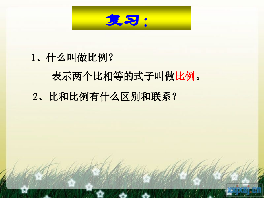单击此处编辑母版标题样式,单击此处编辑母版文本样式,第二级,第三级,第四级,第五级,#,马郎小学 陈伟,人教版六年级数学下册第三单元,比例的基本性质,复习:,1,、什么叫做比例?,表示两个比相等的式子叫做,比例,。,2,、比和比例有什么区别和联系?,复习:,3,、判断下面每组中的两个比能否组成比例?,(1)6:15=8:20,根据比例的意义判断。,复习:,3,、判断下面每组中的两个比能否组成比例?,(2)0.5:0.4=2:2.5,根据比例的意义判断。,例如:,2.4 1.6 =60 40,外项,内项,组成比例的四个数,叫做比例的,项,。两端的两项叫做比例的,外项,,中间的两项叫做比例的,内项,。,两个外项的积是,2.440=,,,两个内项的积是,1.660=,,,96,96,也就是,1.660=2.440,例如:,2.4 1.6 =60 40,外项,内项,组成比例的四个数,叫做比例的,项,。两端的两项叫做比例的,外项,,中间的两项叫做比例的,内项,。,两个外项的积是,2.440=,,,两个内项的积是,1.660=,,,96,96,也就是,1.660=2.440,(),内项,(),(),(),外项,外项,内项,1.660=2.440,2.41.6=6040,1.660=2.440,在比例里,两个外项的积等于两个内项的积,这叫做,比例的基本性质,。,复习:,3,、判断下面每组中的两个比能否组成比例?,(1)6:15=8:20,根据比例的意义判断:,根据比例的基本性质判断:,复习:,3,、判断下面每组中的两个比能否组成比例?,(2)0.5:0.4=2:2.5,根据比例的意义判断:,根据比例的基本性质判断:,根据上面的等式,你能判断哪两个是外项?哪两个是内项吗?,340=206,根据比例的基本性质我们知道,两个内项的积等于两个外项的积。倒过来理解,,乘积相等(并且不为,0,)的两个乘法式子,也可以改写成比例。,根据上面的等式,你能判断哪两个是外项?哪两个是内项吗?,340=206,你能把上面的等式改写成比例吗?,3:,20,=,6,:40,40:,20,=,6,:3,40:,6,=,20,:3,3:,6,=,20,:40,20:,3,=,40,:6,6:,3,=,40,:20,6:,40,=,3,:20,20:,40,=,3,:6,3,和,40,当内项,6,和,20,当内项,做一做,应用比例的基本性质,判断下面哪组中的两个比,可以组成比例。,63,和,85,0.22.5,和,450,因为,65,30,所以,63,和,85,不能,组成比例,所以,0.22.5=450,10=10,38,24,3024,因为,2.54,10,0.250,10,应用比例的基本性质,判断下面哪组中的两个比,可以组成比例。,1,、填空,(,1,)在,a:7=9:b,中,()是内项,,(,)是,外项,,ab=(),。,(,2,)一个比例的两个内项分别是,3,和,8,,则两个外项的,积是(),两个外项可能是()和()。,(,3,)在一个比例里,两个外项互为倒数,那么两个内,项的积是(),如果一个外项是 ,另一个,外项是()。,7,、,9,a,、,b,63,24,1,9,(,4,)在比例里,两个内项的积是,18,,其中一个外,项是,2,,另一个外项是()。,(,5,)如果,5a=3b,,那么,,=,,,=,。,5,3,3,5,2,、判断。,(,1,)在比例中,两个外项的积减去两个,内项的积,差是,0,。(),(,2,),18:30,和,3:5,可以组成比例。(),(,3,)如果,4X=3Y,(,X,和,Y,均不为,0,),,那么,4:X=3:Y,。(),(,4,)因为,310=56,,所以,3:5=10:6,。(),练,习,六,12:16=3:4,只会在水泥地上走路的人,永远不会留下深深的脚印。,