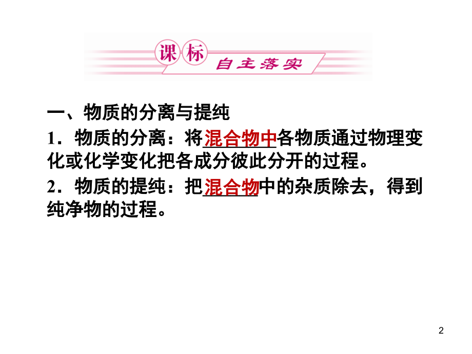 单击此处编辑母版标题样式,单击此处编辑母版文本样式,第二级,第三级,第四级,第五级,*,单击此处编辑母版标题样式,单击此处编辑母版文本样式,第二级,第三级,第四级,第五级,*,第二单元研究物质的实验方法,第一课时物质的分离与提纯,1,一、物质的分离与提纯,1物质的分离:将_各物质通过物理变化或化学变化把各成分彼此分开的过程。,2物质的提纯:把_中的杂质除去,得到纯净物的过程。,混合物中,混合物,2,一、物质的分离与提纯,物质的分离与提纯有何区别与联系?,师生互动,【提示】,物质的分离过程中,分开后的各物质要恢复到原来的状态,而提纯过程中,若杂质发生化学变化,不必恢复为原来的状态。,3,从根本上说分离和提纯都是将某一物质从某混合物中分离出来,相比较而言,提纯采用的方法更为宽松,而分离需要将各组分一一分开。无论分离还是提纯,都要特别注意不要引入新的杂质。,4,二、分离和提纯的常用方法,1过滤,过滤是分离_混合物最常用的方法之一,主要是除去液体中的_,过滤装置如图:,液体和不溶性固体,难溶性组分,5,(1)过滤时用到的玻璃仪器有:_。,(2)过滤的操作要点,一贴:滤纸紧贴_内壁;,二低:_边缘应略低于漏斗边缘,_ 应略低于滤纸的边缘;,三靠:向漏斗中倾倒液体时,烧杯的尖嘴应与_接触;玻璃棒的底端应和漏斗的_处轻轻接触;漏斗颈的末端应与_相接触。,烧杯、漏斗、玻,璃棒,漏斗,滤纸,滤液液面,玻璃棒,三层,滤纸,烧杯内壁,6,过滤完成后,一般对过滤器中的难溶物还要洗涤一下。请说明洗涤的操作有哪些?,学生交流,【提示】,过滤后为了保证沉淀物纯净,需要对沉淀进行洗涤。洗涤时应在原过滤器中加适量蒸馏水,待水自然滤出后,重复洗涤23次。,7,2蒸发,蒸发是将溶液加热,使溶液受热汽化,从溶液中分离出固体物质的方法。蒸发可得晶体,也用于浓缩溶液。蒸发装置如图:,8,(1)蒸发时用到的仪器有:_、玻璃棒、酒精灯、铁架台。,(2)在进行蒸发操作时要注意以下问题,实验结束后,不能将蒸发皿直接放在_上,以免烫坏_或遇实验台上的冷水引起蒸发皿炸裂;,当蒸发到析出大量_、剩余少量_时,应停止_,利用_蒸干,以防止晶体过热迸溅。,蒸发皿,实验台,桌面,桌面,晶体,溶液,加热,余热,9,蒸发操作中要注意哪些安全事项?,师生互动,10,二、分离和提纯的常用方法,1过滤和蒸发操作注意事项,过滤和蒸发操作中共同使用了哪些仪器?它们的用途是否完全一样?,师生互动,【提示】,(1)都曾用到的实验装置:铁架台、玻璃棒。,(2)玻璃棒的用途:过滤时使用玻璃棒的作用是引流。,蒸发时使用玻璃棒的作用是搅拌,防止NaCl晶体在受热不均匀时飞溅。,11,3结晶和重结晶,(1)冷却法,将热的饱和溶液慢慢冷却后析出晶体,此法适用于溶解度_的溶质,如KNO,3,。,(2)蒸发法,此法适用于_的溶质,如NaCl。,随温度变化较大,溶解度变化不大,12,(3)重结晶,将已得到的晶体用蒸馏水溶解,经_等步骤,得到更纯净的晶体的过程。,过滤、加热,浓缩、冷却结晶、过滤,13,4萃取和分液,(1)定义,萃取:利用物质在_的溶剂中_的不同,将物质从一种溶剂转移到另一种溶剂中,从而实现分离的方法。,分液:将萃取后两种_的液体分开的操作。,(2)萃取与分液所用的主要仪器:_(带铁圈)。,互不相溶,溶解度,互不相溶,烧杯、分液漏,斗、铁架台,14,2萃取操作注意事项,如何检验分液漏斗是否漏液?,师生互动,【提示】,分液漏斗使用前必须检查是否漏液,方法是:在分液漏斗中注入少量的水,塞上瓶塞,倒置看是否漏水,若不漏水,正立后把瓶塞旋转180,再倒置看是否漏水。,15,所加萃取剂有何要求?,学生交流,【提示】,萃取剂必须具备的三点性质,萃取剂和水互不相溶;,萃取剂和溶质不发生反应;,溶质在萃取剂中的溶解度远大于在水中的溶解度。,16,分液操作应该注意哪些情况?,师生互动,【提示】,分液操作的注意事项,振荡时,要不时旋开活塞放气,以防止分液漏斗内压强过大引起危险。,分液时要将玻璃塞打开,或使塞上的凹槽(或小孔)对准漏斗上的小孔,保证漏斗内与外界大气相通,同时漏斗下端管口要紧贴烧杯内壁,从而使液体顺利流下。,下层液体要从下口放出,上层液体要从上口倒出。,17,使用分液漏斗时应注意的问题:,(1)使用前必须先检查玻璃塞和活塞处是否漏液;,(2)不能长时间盛装碱性溶液;,(3)萃取溶液从上口倒入,不得超过容积的 ;,18,(4)萃取操作时,用右手压住分液漏斗口部,左手握住活塞部分,把分液漏斗倒转过来用力振荡,振荡时应不断地旋转活塞放气;,(5)分液操作时先要打开上口玻璃塞或将玻璃塞上的凹槽与漏斗口部的小孔对齐;,(6)分液时,分液漏斗的下端管壁应紧贴烧杯内壁;,(7)分液时下层液体从下口流出,上层液体从上口倒出。,例题、用CCl4从碘的饱和水溶液中萃取碘,19,实验步骤,实验现象及结论,1.用量筒量取10 mL碘的饱和水溶液,倒入分液漏斗中,然后再注入4 mL四氯化碳,盖好玻璃塞,加四氯化碳时,四氯化碳不溶于水,且密度比水大,在下层,2.用右手压住分液漏斗口部,左手握住活塞部分,把分液漏斗倒转过来用力振荡,使两种液体充分接触;振荡后打开活塞,使漏斗内气体放出,用力振荡的目的是使水与四氯化碳充分混合,进行萃取,20,3.将分液漏斗放在铁架台上,静置,静置后四氯化碳层变紫色,水层由黄色变浅或接近无色,4.待液体分层后,将分液漏斗颈上的玻璃塞打开,或使塞上的凹槽(或小孔)对准漏斗上的