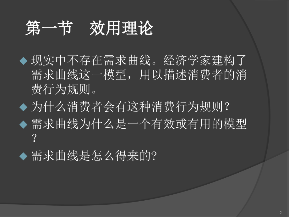 ,单击此处编辑母版标题样式,单击此处编辑母版文本样式,第二级,第三级,第四级,第五级,*,单击此处编辑母版标题样式,单击此处编辑母版文本样式,第二级,第三级,第四级,第五级,*,单击此处编辑母版标题样式,单击此处编辑母版文本样式,第二级,第三级,第四级,第五级,*,单击此处编辑母版标题样式,单击此处编辑母版文本样式,第二级,第三级,第四级,第五级,*,单击此处编辑母版标题样式,单击此处编辑母版文本样式,第二级,第三级,第四级,第五级,*,单击此处编辑母版标题样式,单击此处编辑母版文本样式,第二级,第三级,第四级,第五级,*,单击此处编辑母版标题样式,单击此处编辑母版文本样式,第二级,第三级,第四级,第五级,*,单击此处编辑母版标题样式,单击此处编辑母版文本样式,第二级,第三级,第四级,第五级,*,第三章 消费者均衡分析,1,第一节 效用理论,现实中不存在需求曲线。经济学家建构了需求曲线这一模型,用以描述消费者的消费行为规则。,为什么消费者会有这种消费行为规则?,需求曲线为什么是一个有效或有用的模型?,需求曲线是怎么得来的,?,2,一、效用的概念,效用:,指消费者在消费商品时所感受到的满足,程度。,效用就是一种感觉。,感觉有好坏之分,效用也就有正负之分。,3,渴,累 此时什么对你来说效用最大呢,一个汉堡包,鸡蛋,电脑 对你们来说效用一样吗,4,二、效用的评价,如何比较效用呢?如何度量效用呢?,基数效用:,赋予效用一个具体数值。数值可比较大小,也可以相加减。,序数效用:,为效用进行大小排序。没有具体数值,只比较大小,不能相加。,19,世纪到,20,世纪初,西方经济学家普遍使用基数效用的概念。包括边沁在内的一些学者就希望能够通过制造一种机器来测度人的幸福程度。,20,世纪,30,年代后,序数效用概念为大多数经济学家所使用。,5,第二节 边际效用分析,一、总效用和边际效用,总效用,(,Total Utility,)是指消费者在一定时间内从一定数量的商品的消费中所得到的效用量的总和。,边际效用,(,Marginal Utility,)是指消费者在一定时间内增加一单位的消费所得到的效用量的增量。,6,假定消费者消费一种商品的数量为,Q,,,则总效用函数为:,TU=f(Q),边际效用函数为:,MU=TU(Q)/Q,当,Q0,时,,MU=TU,(,Q,),/Q=dTU(Q)/Dq,边际量,=,因变量的变化量,/,自变量的变化量,7,商品数量,(,1,),总效用,(,2,),边际效用,(,3,),价格,(,4,),0,1,2,3,4,5,6,7,0,10,18,24,28,30,30,28,10,8,6,4,2,0,-2,5,4,3,2,1,0,某商品的效用表 货币的边际效用,=2,8,某商品的效用曲线,总效用与边际效用是什么关系?,边际效用曲线为什么为向右下方倾斜呢?,9,二、边际效用递减规律,边际效用递减规律,:在一定时间内,在其他商品的消费数量保持不变的条件下,随着消费者对某种商品消费量的增加,消费者从该商品连续增加的每一消费单位中所得到的效用增量即边际效用是递减的。,戈森第一规律,10,为什么会边际效用递减呢?,1.,生理和心理的原因,2.,商品用途的多样性,11,三、基数效用论的消费者均衡,消费者均衡:,指消费者花费既定代价使自己,得到的效用最大化,或者为了达到一定的效,用量而使自己所花的代价最小的一种状态。,(一)实现消费者均衡的假设条件,1,、消费者的嗜好是既定的,2,、消费者的收入是既定的,3,、商品的价格是既定的,12,4,、,每一单位货币的边际效用对消费者都是相同的,一般情况下,随着货币收入的增加,货币的边际效用递减。,基数效用论在分析消费者行为时,通常假定货,币的边际效用是不变的。,理由是,消费者收入,给定的情况下,单位商品的价格只占消费者总,货币收入的很小部分。另外只有假定,货币的边际效用不变,才能使货币的,效用去衡量其他商品的效用。,13,(二)基数效用论的消费者均衡条件,消费者可以支出金额为,40,元,单位,X,和,Y,的,价格分别为,5,元和,10,元,,X,和,Y,各买多少效用,才最大呢?,表,3-2,表,3-3,买橘子和香蕉,14,假定:消费者用既定的收入,I,购买,n,种商品,,P,1,,,P,2,,,.,,,P,n,分别为,n,中商品的数量,,MU,1,,,MU,2,,,.,,,MU,n,分别表示,n,种商品的边际效用,则消费者效用最大化的均衡条件用公式表示为:,P,1,X,1,+P,2,X,2,+.+P,n,X,n,=,I,(,3.5,),MU,1,/P,1,=MU,2,/P,2,=.=MU,n,/P,n,=,(,3.6,),消费者的每一元钱所买到的各种商品的边际效用相,等的时候,就能在花费既定支出的情况下使买得的商,品效用极大化。,注意:,是货币的边际效用,15,相对应,在购买两种商品情况下的消费者效用最大化的均衡条件为:,P,1,X,1,+P,2,X,2,=I,MU,1,/P,1,=MU,2,/P,2,=,思考,为什么在买两个单位,X,三个单位,Y,时效用会最大化呢?,没错,当其中一个边际效用大于另一个时,总会尝试增加边际效用大的那一样物品,16,四、消费者剩余,消费者剩余是消费者在购买一定数量的某种商,品时愿意支付的最高总价格和实际支付的总价,格之间的差额。,你在买面包时的成交,价格等于面包带给你的,边际效用,但是在你买,第一面包时,它给你,带来的效用大于付出的,价格,你有类似的经历吗?,17,你如何安排你的时间呢,假设工作,8,小时,,吃饭、睡觉、娱乐你,会如何安排呢?,是不是当三者的边际,效用相等时,你才最,舒服呢,18,第三节 无差异曲线分析,一、消费者偏好,偏好:更喜欢的意思,带有明显倾向性。,序数效用论关于消费者偏好的两个假定:,(,1,)非对称性,(,2,)传递性,19,二、无差异曲线,基于序数效用论的分析工具,人们的需求是多样的,不会只消费一种商品,,不会仅拿一种