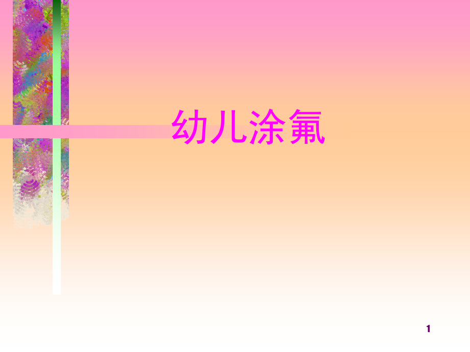 单击此处编辑母版标题样式,单击此处编辑母版文本样式,第二级,第三级,第四级,第五级,*,幼儿涂氟,1,氟化物防龋机制,降低釉质溶解度,促进釉质再矿化,对微生物产生作用,影响牙体形态,以达到防龋效果,分为全身应用和局部应用,涂氟主要为局部应用来防龋,2,局部应用常用方法,含氟涂料,含氟凝胶,含氟泡沫,3,多乐氟,产品特征,多乐氟是涂布于牙面的一种保护性涂料,1高露洁多乐氟产品有效成分为氟化钠5%(22.600ppm),蜂蜡和乙醇、虫胶和乳香树胶(提供一个柔韧的、具渗透性的坚硬表面防止涂料在唾液中迅速溶解)、流动增强剂、糖精、调味剂等成分,2操作简单快速,无需辅助设备,患者容易配合,2分钟内涂布牙面,遇唾液后1分钟迅速干燥,3使用量少,安全,低风险,4涂布后4小时内呈透明谈黄色,口味好,易于观察,5口味好,容易接受,特别是儿童,6高露洁多乐氟已全面获得临床数据支持,适合单独牙齿或全口使用。,目前,多乐氟已成为WHO,英国,美国ADA等部门推荐的首选龋病预防,治疗方法,4,多乐氟适应症,适应症,1所有萌出牙齿,2釉质白斑或早期龋损,3暴露牙根及根面龋,4充填体边缘,5萌出过程中的牙齿,6龋坏的前牙,7适用人群为2岁以上儿童及成人,建议每年涂抹2次可以有效预防龋齿,5,6,禁忌症,1口腔炎,2溃疡性牙龈炎,3对氟化钠任何成分有过敏史的个体,4需要住院治疗的支气管炎,7,检查填表,省,市,县(区),乡镇(街道),幼儿园,班级,姓名,性别,出生日期,年,月,日,家长姓名,与儿童关系,联系电话,家庭地址,检查医师姓名,所属医疗机构,西安市中心医院口腔科,检查日期,8,牙列状况,55,54,53,52,51,61,62,63,64,65,85,84,83,82,81,71,72,73,74,75,9,龋齿检查记录代码,0=无龋,1=有龋,2=已充填有龋,3=已充填无龋,4=因龋缺失,5=因其他原因失牙,6=窝沟封闭,9=不做记录,10,口腔卫生状况,55,51,65,85,71,75,0=无软垢,1=覆盖牙面1/3以下,2=覆盖牙面1/3与2/3之间,3=覆盖牙面2/3以上,9=不做记录,X=缺失牙,11,结果通知书,尊敬的,(孩子姓名)家长同志:,您孩子:,()已经接受了口腔健康检查和局部用氟;,()只接受了口腔健康检查,因孩子不能配合或呕吐反射强烈没有接受局部用氟;,您的孩子患有,颗龋齿,12,多乐氟技术规范,1、清洁牙面:刷牙、棉签擦拭,2、隔湿和干燥:棉卷隔湿,3、涂布:小毛刷。所有牙面,主要为唇侧和咬合面,以及邻面。,4、时间:自然干燥。遇唾液会凝固。做好隔湿。,13,医嘱与注意事项,1、2-4小时不进食,2、涂布当晚不刷牙,3、间隔6个月涂布一次,4、牙龈出血禁止使用,14,注意事项,态度和蔼,有爱心,有耐心,15,