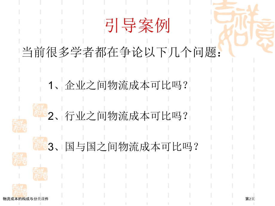 Click to edit Master title style,Click to edit Master text styles,Second level,Third level,Fourth level,Fifth level,*,*,单击此处编辑母版标题样式,单击此处编辑母版文本样式,第二级,第三级,第四级,第五级,*,单击此处编辑母版标题样式,单击此处编辑母版文本样式,第二级,第三级,第四级,第五级,*,单击此处编辑母版标题样式,单击此处编辑母版文本样式,第二级,第三级,第四级,第五级,*,单击此处编辑母版标题样式,单击此处编辑母版文本样式,第二级,第三级,第四级,第五级,*,第二章,物流成本组成与分类,物流成本的构成与分类课件,第1页,引导案例,当前很多学者都在争论以下几个问题:,1,、企业之间物流成本可比吗?,2,、行业之间物流成本可比吗?,3,、国与国之间物流成本可比吗?,物流成本的构成与分类课件,第2页,从我国财务管理过程看,因为处于社会再生产不一样领域,,应分别考虑社会物流成本、商业流通企业物流成本、制造企业,物流成本以及物流企业物流成本,才能更清楚地看清物流,成本组成。,一、物流成本组成,物流成本的构成与分类课件,第3页,社会物流成本组成,社会物流成本是核实一个国家在一定时期内发生物流总成本,是不一样性质企业微观物流成本总和。,运输成本,(,Transportation Cost,),存货持有成本,(,Inventory Carrying Cost,),物流行政管理成本,(,Logistics Administration Cost,),物流成本的构成与分类课件,第4页,美国社会物流成本组成,物流总成本,=,存货持有成本运输成本物流行政管理成本,物流成本的构成与分类课件,第5页,其中:,存货持有成本,利息,税、折旧、贬值、保险仓储成本,序 号,项 目,比重(,%),1,2,3,4,5,6,7,8,9,保 险,仓 储,税 费,运 输,搬 运,贬 值,利 息,过 时,总 计,0.25,0.25,0.50,0.50,2.50,5.00,6.00,10.00,25.00,物流成本的构成与分类课件,第6页,运输成本,公路运输铁路运输水路运输油料管道运输 航空运输货运代理相关费用,物流行政管理成本,订单处理及,IT,成本 市场预测、计划制订及相关财务人员发生管理费,=,(存货持有成本,+,运输成本),固定百分比(,4%,),物流成本的构成与分类课件,第7页,美国近年社会物流成本总额改变,物流成本的构成与分类课件,第8页,美国近年社会物流成本占,GDP,改变,物流成本的构成与分类课件,第9页,几点启示:,降低物流成本是提升效益主要战略办法,运输费百分比不变,降低库存支出就成为降低物流成本主要起源。,当代物流关键考评指标,:,加速资金周转率、降低库存水平,物流成本概念必须拓展。库存支出更主要是存货占压资金利息,过时损失。,10,物流成本的构成与分类课件,第10页,欧洲社会物流成本组成,社会物流成本,=,运输成本,+,仓储成本,+,包装费,+,基础设施投资费,运输成本,=,公路运输费,+,铁路运输费,+,轮船运输费,+,航空运输费,+,货主运输费,仓储成本,=,人工费,+,占压资金成本和利息,+,货物损毁,+,保险费用,物流成本的构成与分类课件,第11页,日本社会物流成本组成,社会物流成本,=,运输费保管费,物流管理费,物流成本的构成与分类课件,第12页,其中:,运输费,营业运输费,企业自家运输费,营业运输费,卡车货运费铁路货运费 内海航运货运费国内航空货运费货运站收入,自家运输费,=,营业用卡车平均行走一里原价,自家卡车行走里数,实际平均一日一车行走里数比,自家用卡车装载比率,实际平均一日一车行走里数比,=,自家用卡车实际平均一日一车行走里数,营业用卡车实际平均一日一车行走里数,自家用卡车装载比率,=,自家用卡车平均装载率,营业用卡车平均装载率,物流成本的构成与分类课件,第13页,保管费,(原材料库存余额产品库存余流通库存余额),原价率,库存费用比率,物流管理费,(制造业产出额批发、零售业产出额),物流管理费用百分比(,0.5%,),物流成本的构成与分类课件,第14页,日本近年社会物流成本总额改变,物流成本的构成与分类课件,第15页,日本近年社会物流成本占,GDP,比率改变,物流成本的构成与分类课件,第16页,经典案例,:,日本宏观物流成本发展,从全球成本控制总体趋向看,日本等发达国家已经有效地将物流成本控制在了较小范围内,详细看,依据德国Deutsche银行统计,从全行业物流成本占价值比重来看,日本平均物流成本为6.0%,欧洲为9.1%,加拿大为9.5%,美国为10.0%,从这些资料中能够看出,日本在物流成本控制上已经取得了良好绩效,之所以如此,不但在于日本形成了全方面物流管理体系和运作流程,而且还制度化实施了物流成本监控和管理。,日本物流协会每年都要对物流成本情况进行调查,从中我们能够看到日本当前物流成本管理发展阶段和水准。从日本全行业物流成本调查看,物流成本占销售额比重全行业平均水平为5.45%,制造业为5.89%,批发业为4.68%,零售业为4.13%;,物流成本的构成与分类课件,第17页,日本物流协会还对影响物流发展很多原因进行了专门调查,这些原因主要有:,全社会物流量与物流成本关系,对此方面,抽样调查,110,家各类型企业,其中认为物流经营量与物流成本同时增加企业占,22.7%,,物流经营量与物流成本都降低占,51.8%,,物流经营量降低而物流成本上升占,7.3%,,物流经营量增加而物流成本下降占,18.2%,。,委托客户企业要求物流服务深入提升主要要素,在该调查中大多数日本企业反应物流服务要求越来越高,其中对配送频度加紧持认同企业占调查企业总数,53.1%,,配送单元化占,54.6%,,缩短前置时间占,61.3%,,认为物流服务要求下降企业不