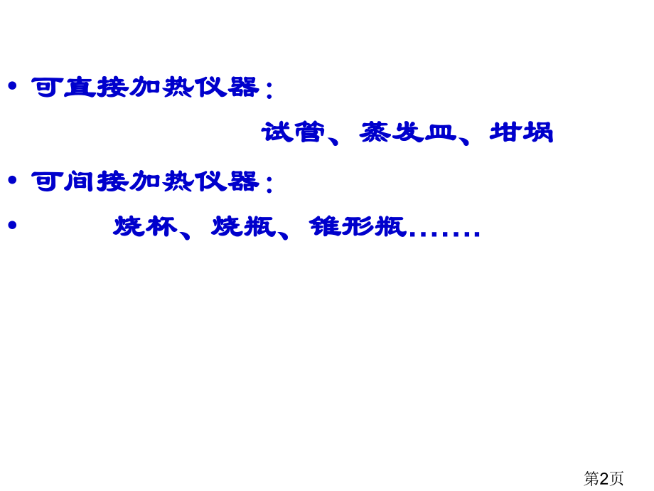 单击此处编辑母版标题样式,单击此处编辑母版文本样式,第二级,第三级,第四级,第五级,*,本资料仅供参考,不能作为科学依据。谢谢,惯用化学试验仪器,第1页,可直接加热仪器:,试管、蒸发皿、坩埚,可间接加热仪器:,烧杯、烧瓶、锥形瓶.,第2页,蒸发皿,三脚架,第3页,泥三角,灼烧:,坩埚,泥三角,,三脚架,酒精灯,第4页,圆底烧瓶,平底烧瓶,蒸馏烧瓶,三颈烧瓶,第5页,制乙烯,第6页,直形冷凝管,蛇形,冷凝,管,球形,冷凝,管,第7页,冷凝,冷凝、回流,第8页,普通漏斗,梨形,分液,漏斗,球形,分液,漏斗,恒压,滴液,漏斗,第9页,试验室制氧气,试验室制氯气,第10页,量筒,注意区分,无零刻度,小刻度在下,读数到0.1mL,零刻度在上方,读数到0.01mL,第11页,注意温度计放置,第12页,容量瓶,容量瓶,刻度线,温度,规格,第13页,第14页,防倒吸装置,第15页,防堵塞装置,第16页,
