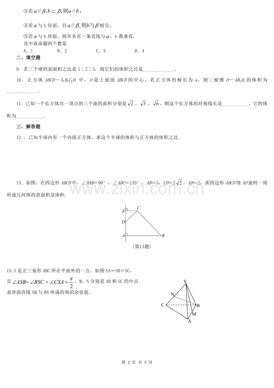 13.如图,在四边形ABCD中,∠DAB=90°,∠ADC=135°,AB=5,CD=2,AD=2,求四边形ABCD绕AD旋转一周所成几何体的表面积及体积.