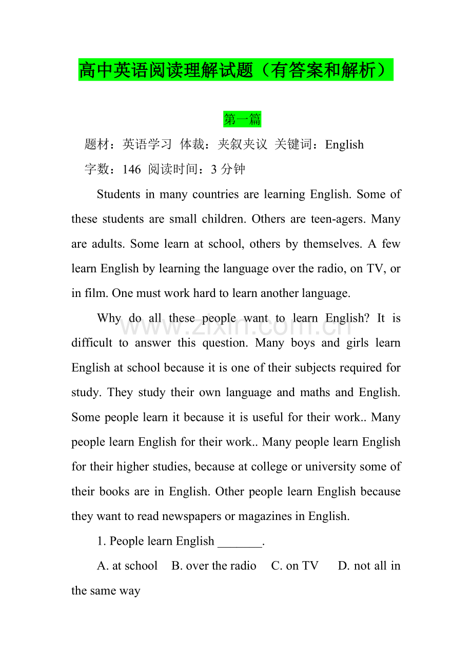 高中英语阅读理解试题(有答案和解析)