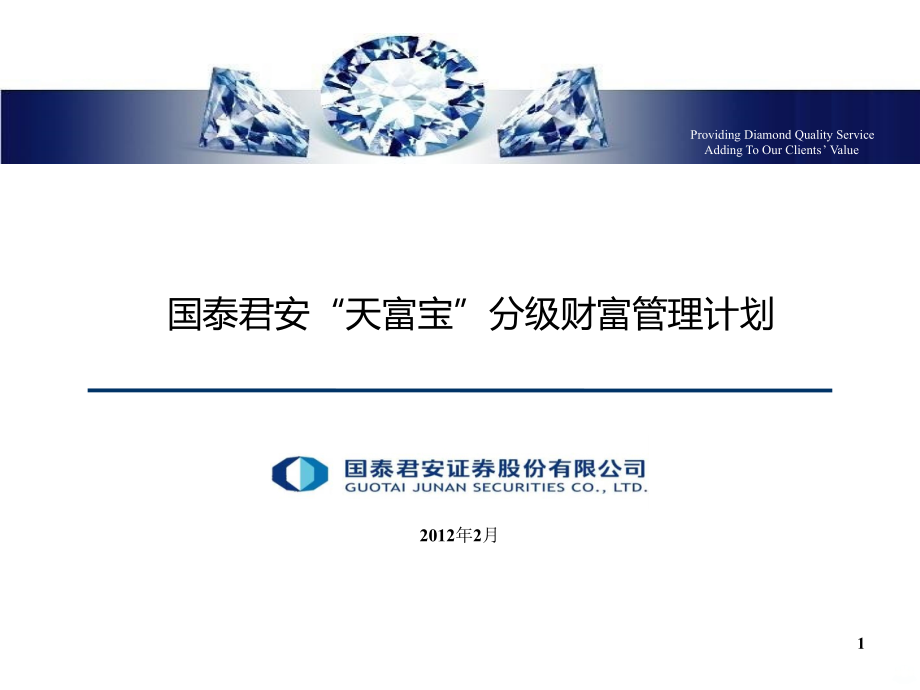 ,债券销售交易部,单击此处编辑母版标题样式,*,债券销售交易部,Providing Diamond Quality Service,Adding To Our Clients Value,*,*,*,*,单击此处编辑母版标题样式,*,Providing Diamond Quality Service,Adding To Our Clients Value,*,*,*,*,*,单击此处编辑母版标题样式,*,单击此处编辑母版标题样式,*,单击此处编辑母版标题样式,*,单击此处编辑母版标题样式,*,单击此处编辑母版标题样式,*,单击此处编辑母版标题样式,*,单击此处编辑母版标题样式,*,单击此处编辑母版标题样式,*,单击此处编辑母版标题样式,*,单击此处编辑母版标题样式,*,单击此处编辑母版标题样式,*,2012,年,2,月,Providing Diamond Quality Service,Adding To Our Clients,Value,国泰君安,“,天富宝,”,分级财富管理计划,1,设计框架,产品收益分成,产品优先档的比例不超过,90%,,次级档的比例不低于,10%,;,产品优先档收益率:,5-6%,;,产品次级档预期收益率:,10%,以上,次级档以其本金为限对优先档的本金和收益率提供担保,即在满足优先档的最低收益率后次级档才享有偿付本金和收益分配权利。,产品在扣除信托费和托管费后,首先保证优先档的收益率达到最低收益率,如果无法达到,则以次级档的本金为限保证优先档收益。,在优先档达到最低收益率后,超出部分归次级档所有。,投资策略,组合范围和风控措施,产品规模,5,亿,组合久期,2-4,年,投资品种标的,银行间市场交易的各类债券,,包括但不限于国债、金融债、,企业债、中期票据、短融等,各类债券,理财产品投资组合,投资策略,在配置的基础上,积极进行波段操作,投资品种限制,按成本计算的债券配置比例为,50%-100%,;,配置信用类债券时,该债券发行人的外部主体评级必须为,A,(含)及以上。,风险控制措施,国泰君安提供信托计划清算或赎回时的流动性:国泰君安承诺自身或安排第三方买入信托项下的固定收益资产;,预警线:,0.96,,信托单位制小于等于预警线时,提示风险,并限制进行有敞口买入交易;,止损线:,0.94,,信托单位制小于等于止损线时,进入止损变现期,投资顾问在,5,个交易日内协助进行变现。,产品特性及投资者,产品优势,销售进度安排,3-1,国泰君安证券股份有限公司介绍,3-2,国泰君安固定收益证券部介绍及竞争优势,附 国泰君安综合实力介绍,国泰君安所属的,5,家子公司及,26,家分公司所辖的近,200,家营业部分布于全国各省、自治区、直辖市、特别行政区。,国泰君安的股东包括上海市国有资产经营有限公司、中央汇金投资有限责任公司、深圳市投资控股有限公司等,其中上海国有资产经营有限公司作为控股股东,持有国泰君安,23.81%,股权,中央汇金持有国泰君安,21.28%,股权,是公司第二大股东。,上海国有资产经营,有限公司,深圳市投资控股,有限公司,国家电网公司,深圳市能源投资,股份有限公司,中国第一汽车,集团公司,中央汇金投资,有限责任公司,国泰君安期货,经纪有限公司,国联安基金,管理有限公司,国泰君安,资产管理公司,国泰君安创新,投资有限公司,分布于全国的近,200,家分支机构,国泰君安(香港),金融控股有限公司,国泰君安证券公司概况,国泰君安资本实力雄厚,资产结构稳定,创利能力领先,风险承受能力强,对公司的债券承销业务起到强而有力的支撑作用。,财务实力雄厚,项目,2007,年,2008,年,2009,年,2010,年,金额,排名,金额,排名,金额,排名,金额,总资产,10,536,685,1,6,806,967,3,10,172,240,4,9,362,241,净资产,2,252,091,3,1,595,941,3,2,195,923,5,2,374,259,营业收入,1,344,856,4,1,199,628,1,1,152,199,1,750,774,净利润,700,720,2,611,614,2,602,126,2,377,013,国泰君安,2007-2010,年主要财务数据及排名,数据来源:中国证券业协会网站,,2010,年排名尚未公布,单位:万元,2010,中国最具价值证券品牌,2007,本土最佳研究团队,券商综合实力大奖,“最佳研究团队”,中国最佳经纪商,券商综合实力大奖,2006,2005,2004,AA,级券商,本土最佳研究团队最佳分析师占,13,席,最佳研究团队,2009,最佳投行奖,2009,最佳证券研究机构,首席财务官最青睐的兼并收购业务投资银行,本土最佳研究团队、最佳分析师占,16,席,最受尊敬的投行、最佳投行团队,综合业务价值量第一名,最佳大型项目投行团队,首批创新试点资格,2008,最佳经纪,2008,最佳资产管理,2008,最佳衍生品,2008,最佳债券,2008,中国最具影响力投行,2008,中国最佳证券经纪商,2010,最具创新能力投行,2009,最受尊敬的投行,2009,最佳投行团队,2010,债券最佳投行,国泰君安屡获市场认可,2008-2009,2009,最具创新能力投行,2009,本土最佳投行团队,2009,最受尊敬的投行,2009,本土最佳研究团队第四,国泰君安所属的,5,家子公司、,26,家分公司所辖的近,200,家营业部分布于全国,29,个省、自治区、直辖市、特别行政区,是目前国内规模最大、经营范围最宽、网点分布最广的证券公司之一,作为国内大型综合券商,国泰君安的业务包括投资银行业务、零售业务、销售交易业务、融资融券业务、资产管理业务、证券及衍生产品投资业务、境外业务、期货业务及直接投资业务,衍生品开发,金融衍生品、结构产品的设计及创设,国泰君安,(,上海,),国泰君安购并,国泰君安,(,深圳,),国泰君安,(,北京,),国泰君安债券,国泰君安资产,国联安基金管理,国泰君安证投,资产管理,基金、资产管理、证券自营,投资银行,企业融资、购并、股权投资、,企业债(公司债)承销、债券研究,研究、股票销售与交易,资本市场研究、机构销售、证券交易,国泰君安营销,国泰君安研